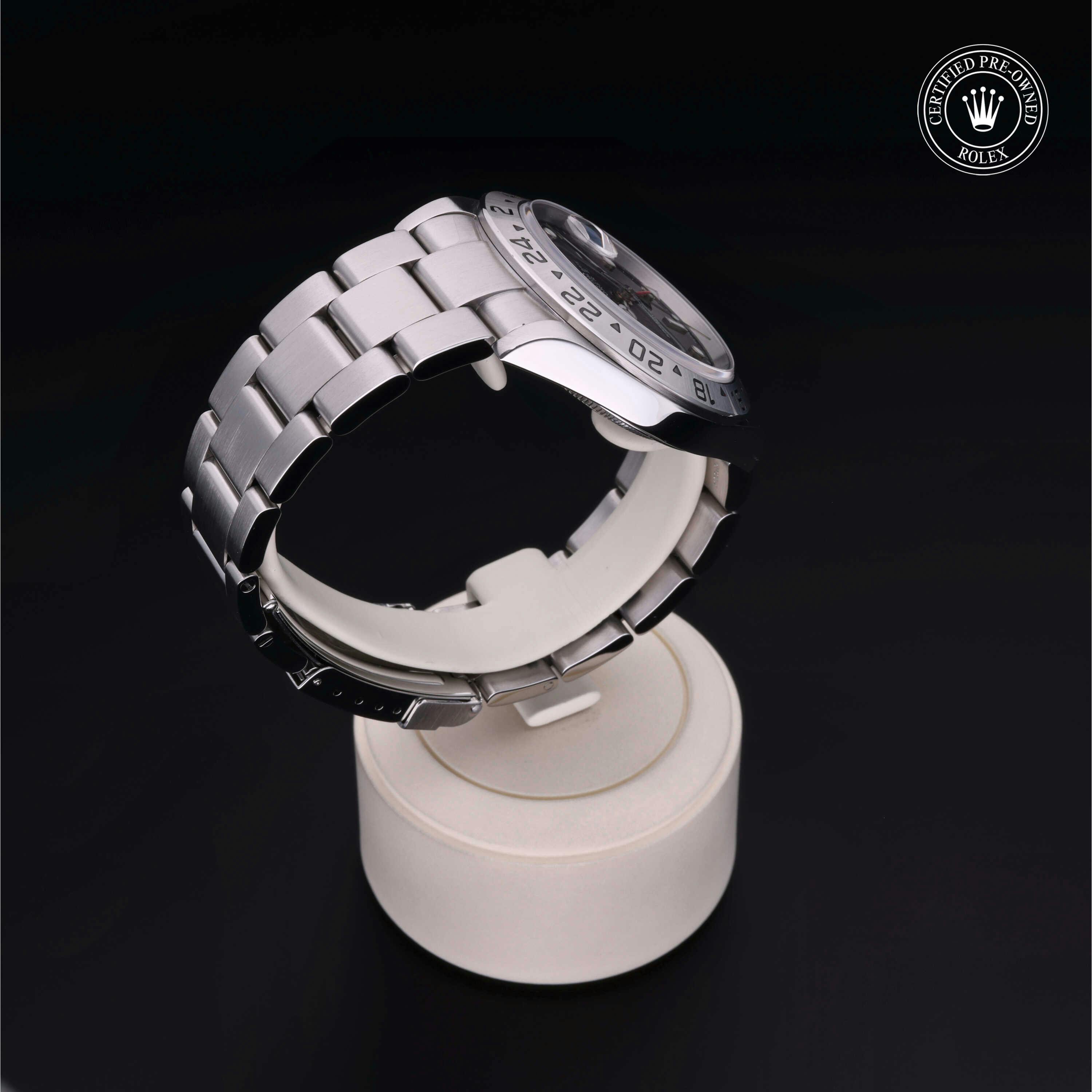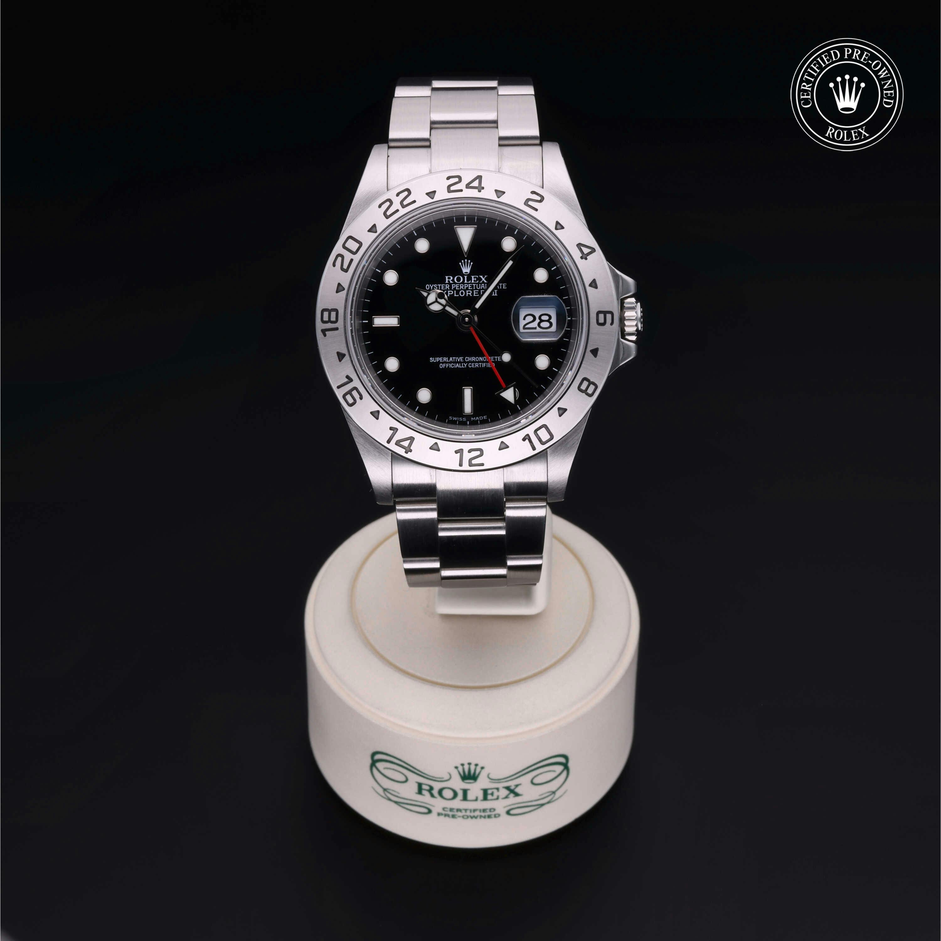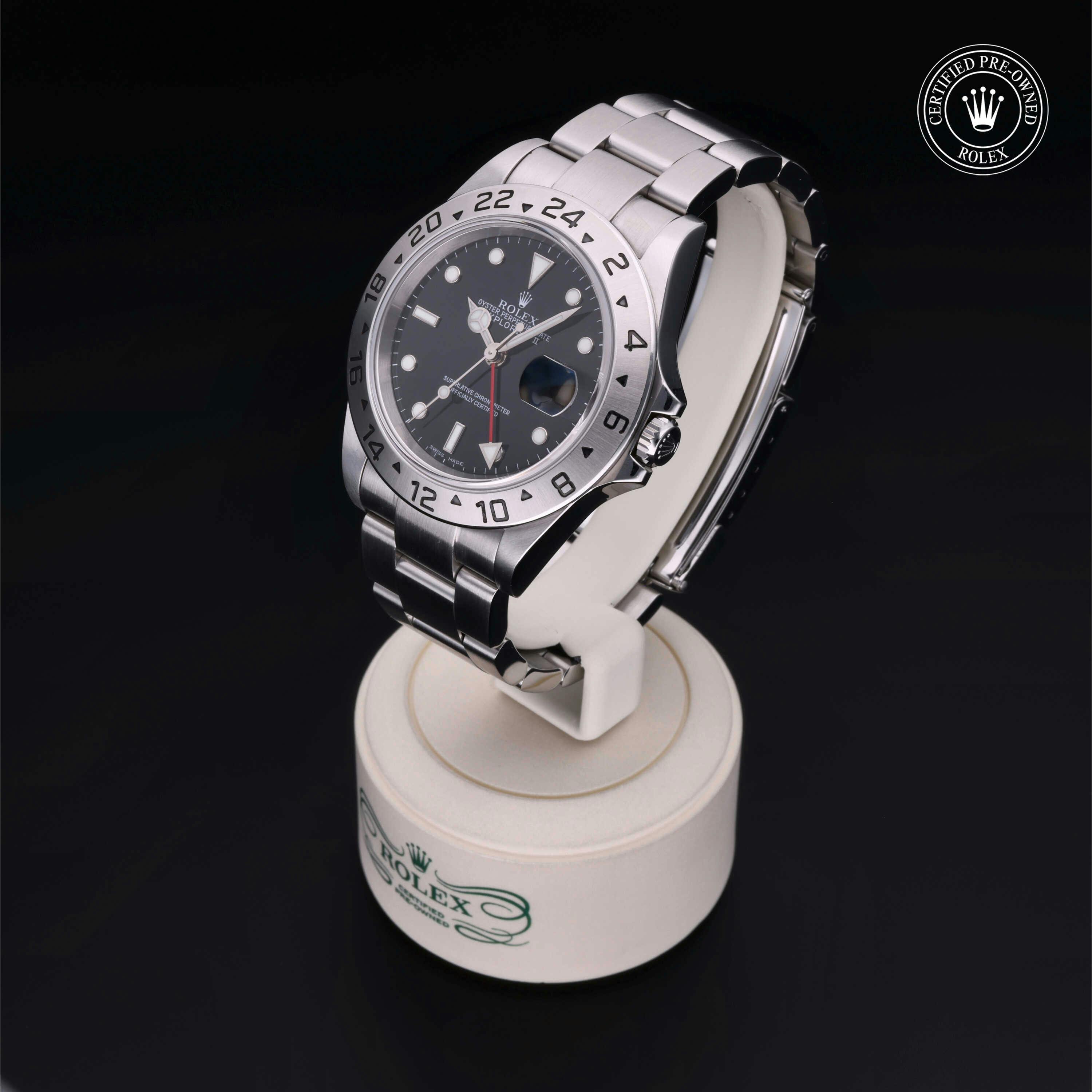 Rolex Certified Pre-Owned Explorer II (16570) self - winding automatic watch, features a 40mm stainless steel case and fixed bezel surrounding a black dial on a stainless steel oyster bracelet. Functions include hours, minutes, seconds, date and gmt/world time. This watch has received Rolex-authorized service and certification. It does not come with the original box or papers, but includes a custom Rolex Certified Pre-Owned hang tag, travel pouch and RCPO international warranty card.