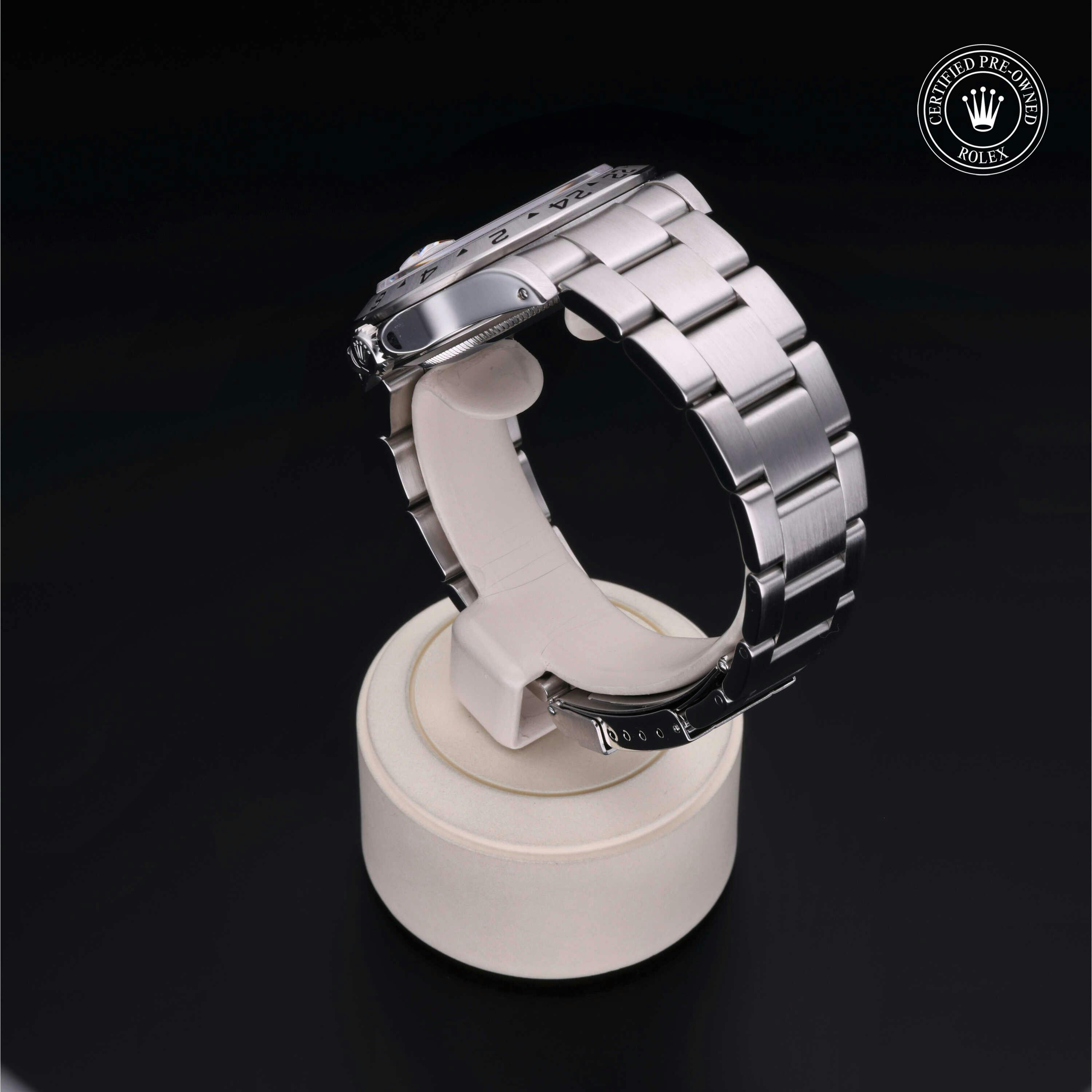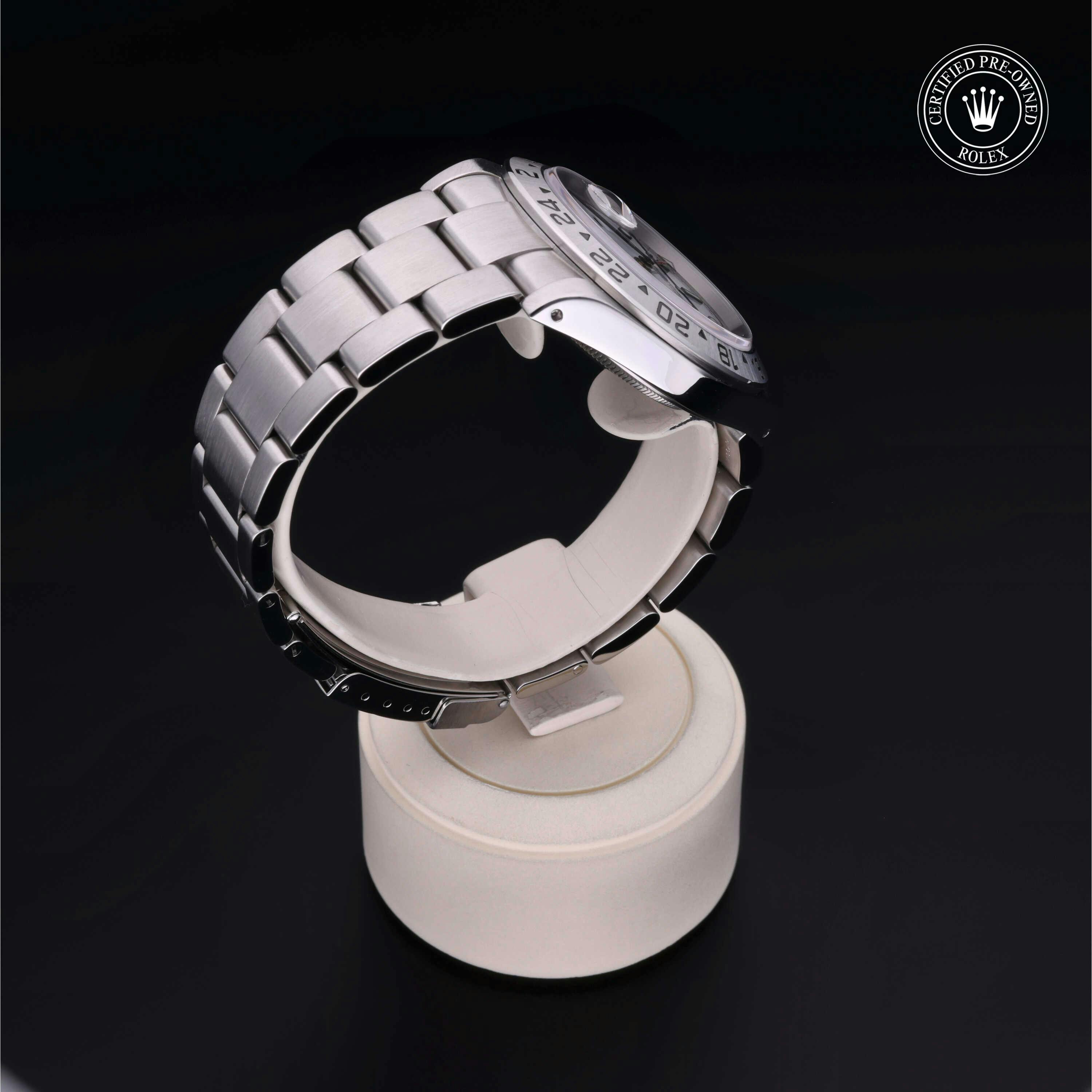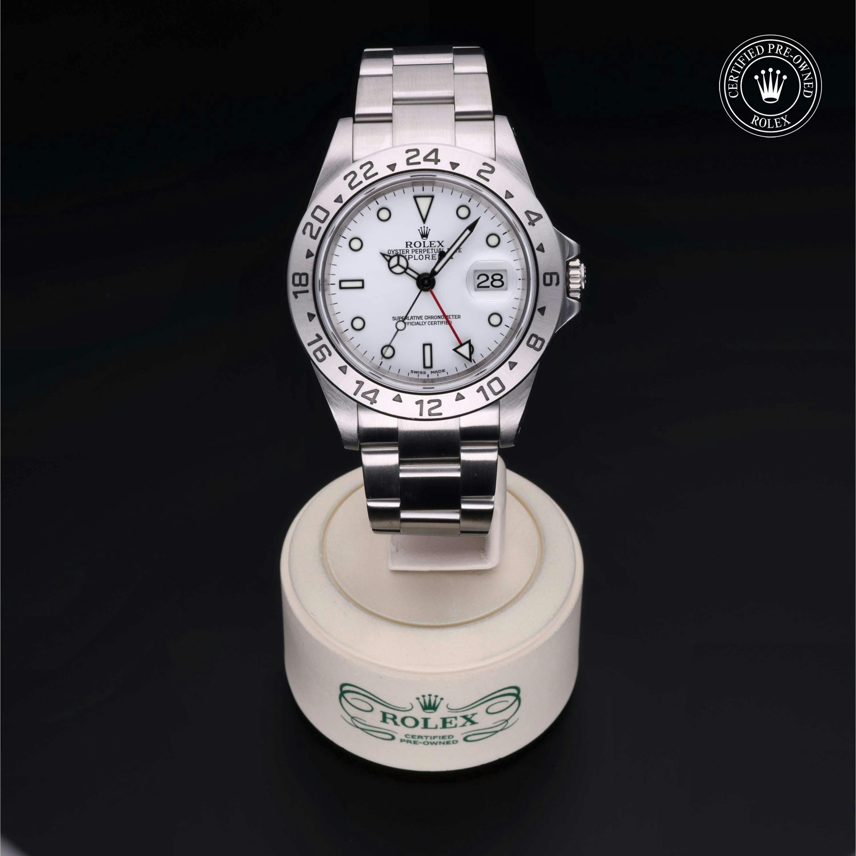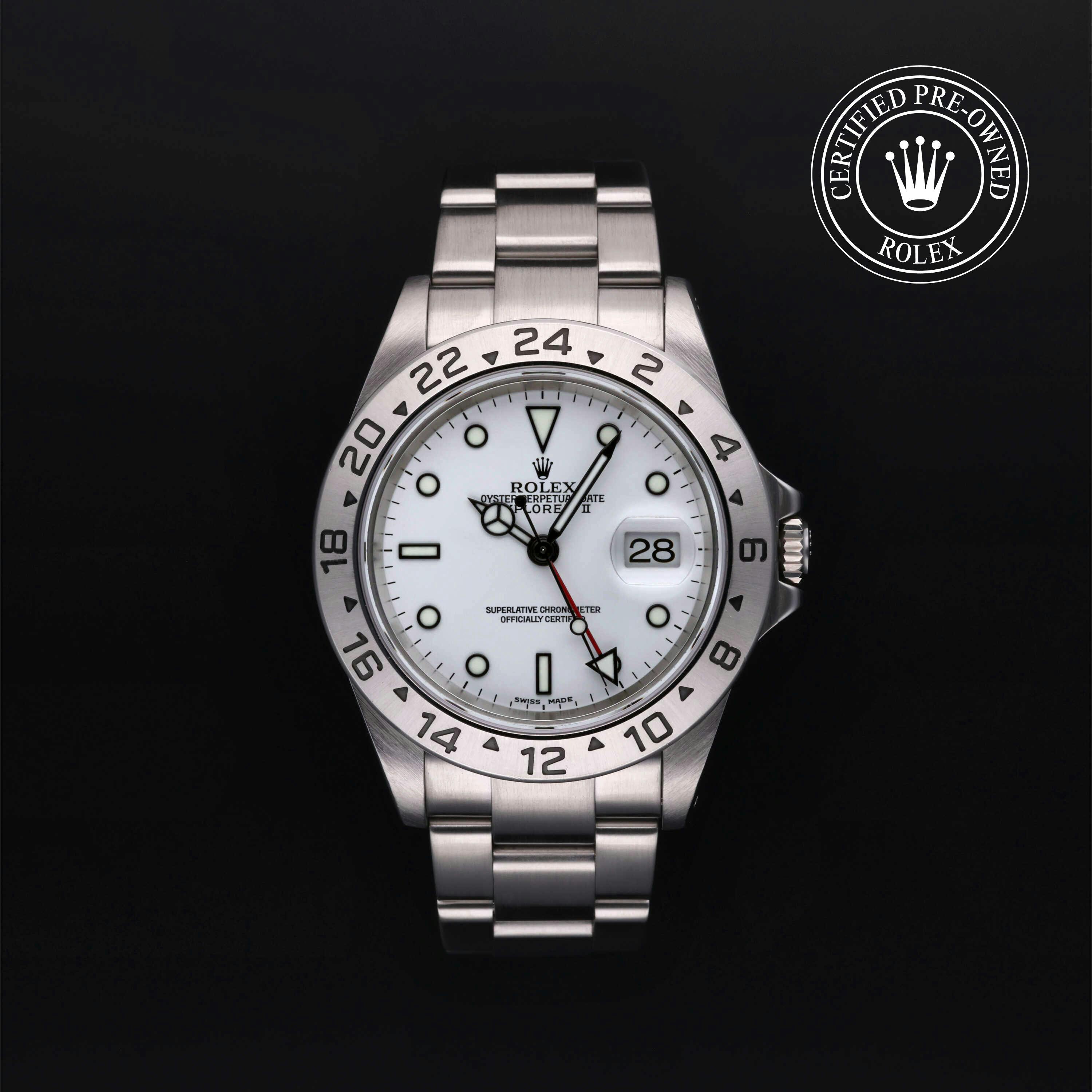 Rolex Certified Pre-Owned Explorer II (16570) self - winding automatic watch, features a 40mm stainless steel case and fixed bezel surrounding a white dial on a stainless steel oyster bracelet. Functions include hours, minutes, seconds, date and gmt/world time. This watch has received Rolex-authorized service and certification. It comes with the original papers, and includes a custom Rolex Certified Pre-Owned hang tag, travel pouch and RCPO international warranty card.