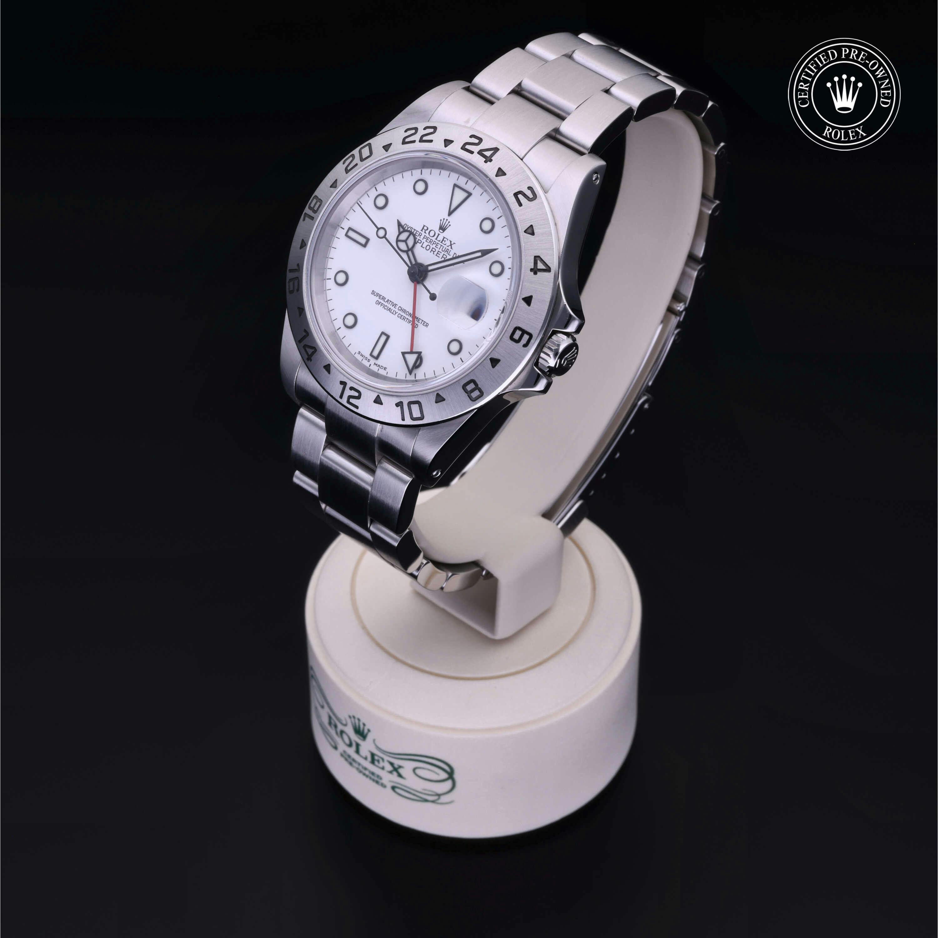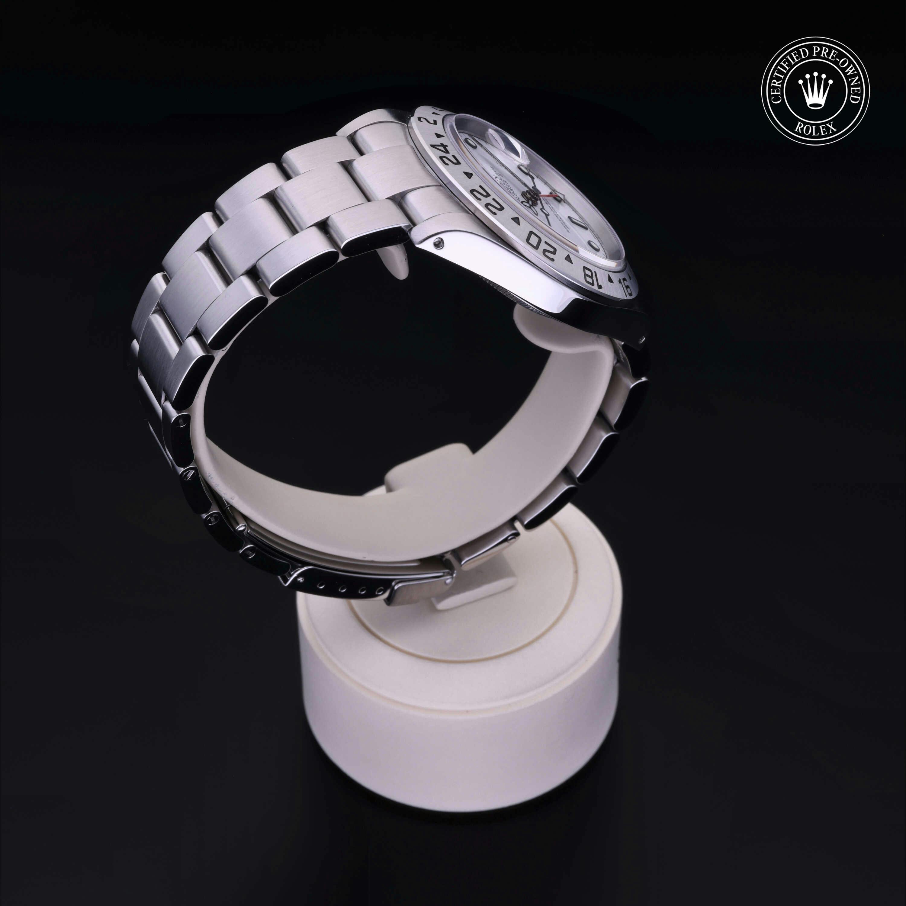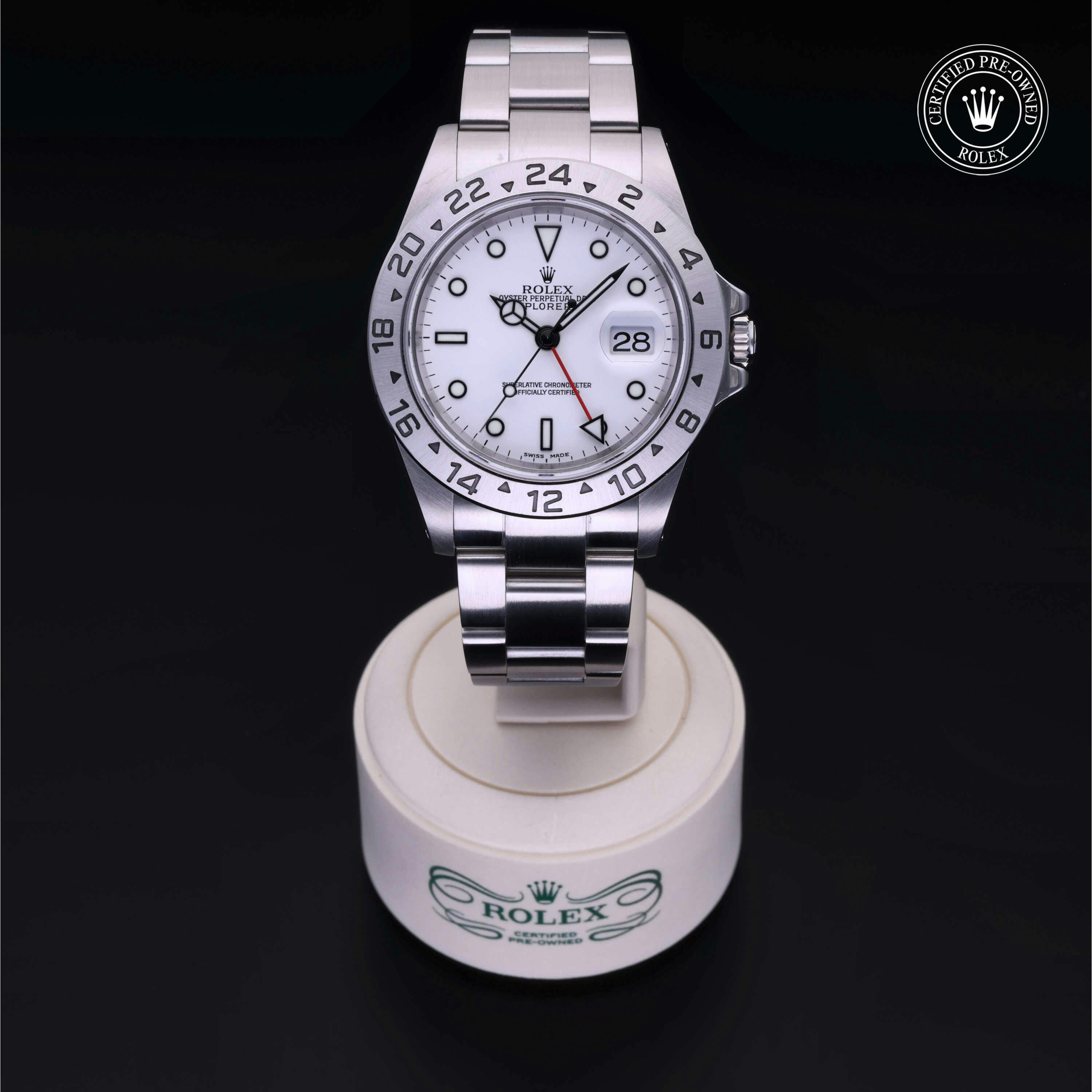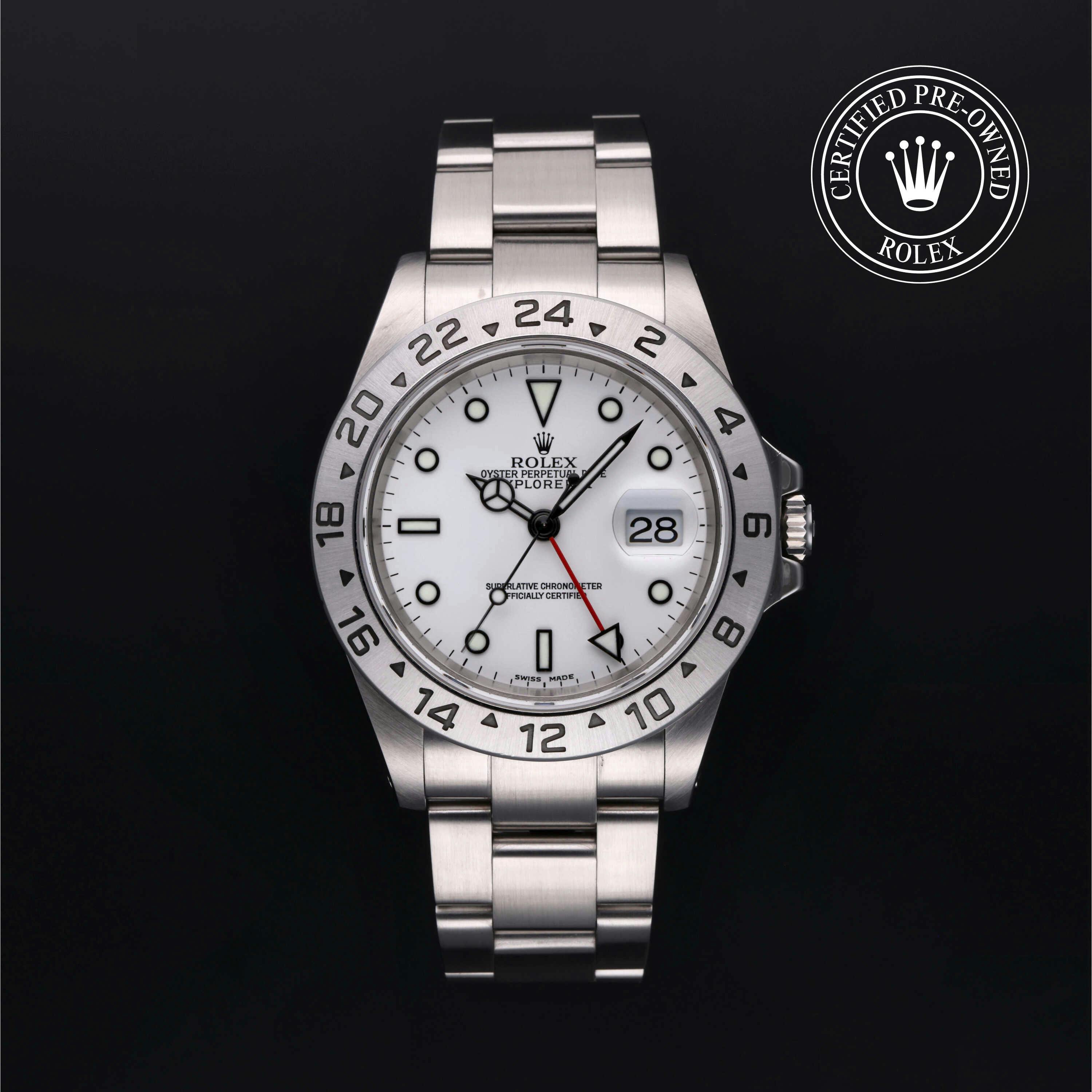 Rolex Certified Pre-Owned Explorer II (16570) self - winding automatic watch, features a 40mm stainless steel case with a 24-hour graduated fixed bezel surrounding a white dial. The watch is secured on a stainless steel Oyster bracelet complete with a folding buckle. Functions include hours, minutes, seconds, date and gmt/world time. This watch has been serviced by an authorized service center and certified by Rolex. It comes with the original papers and includes a custom Rolex Certified Pre-Owned hang tag, travel pouch and international warranty card.