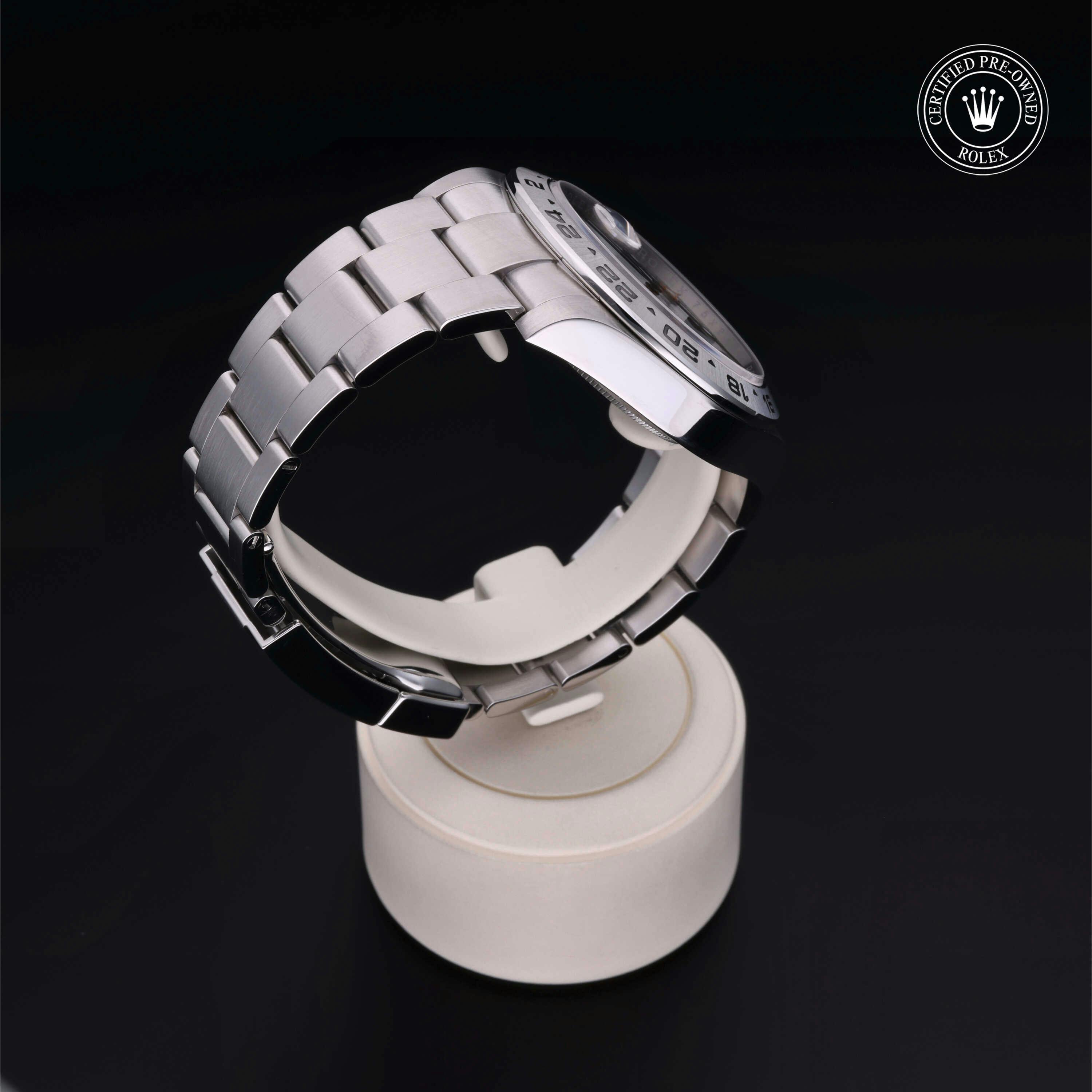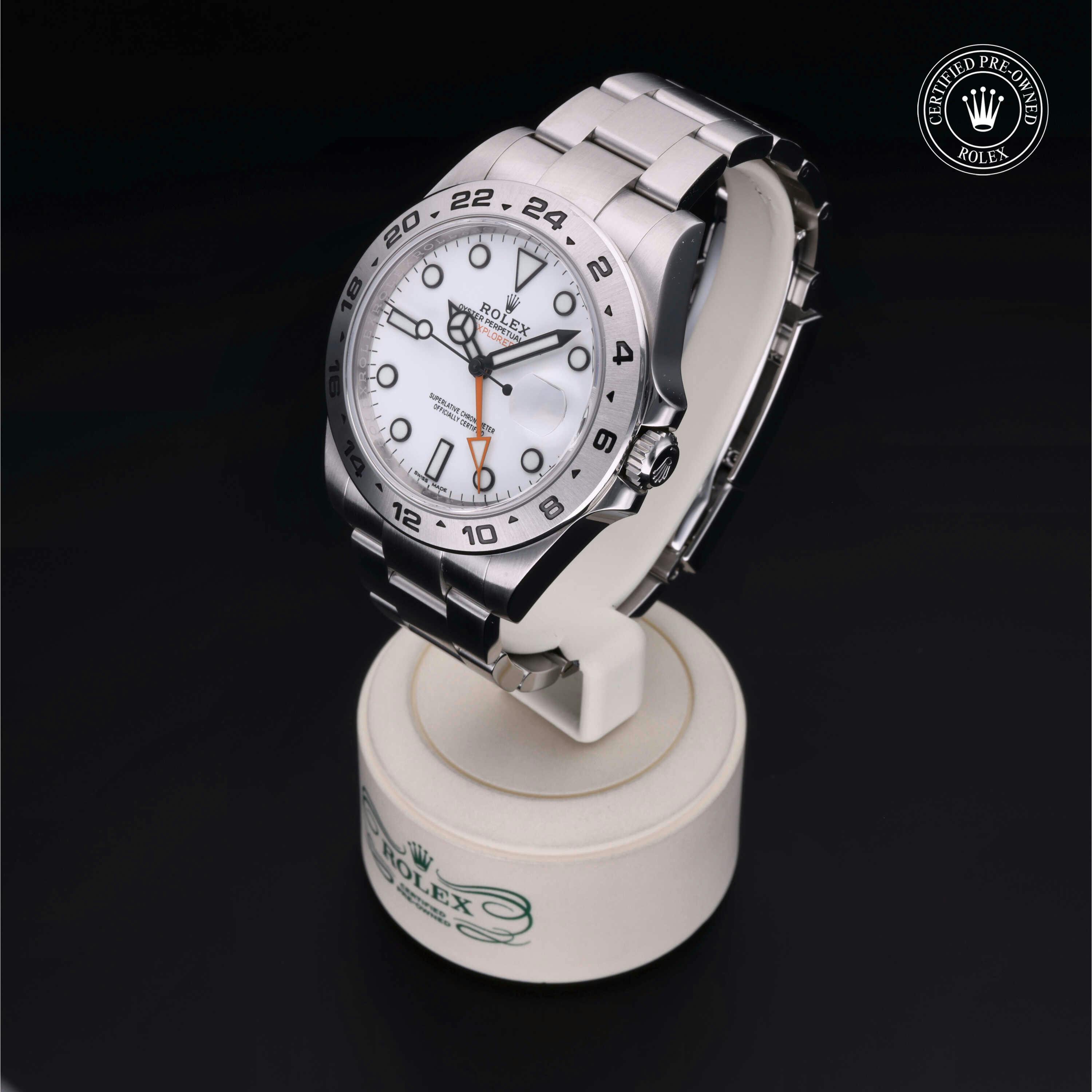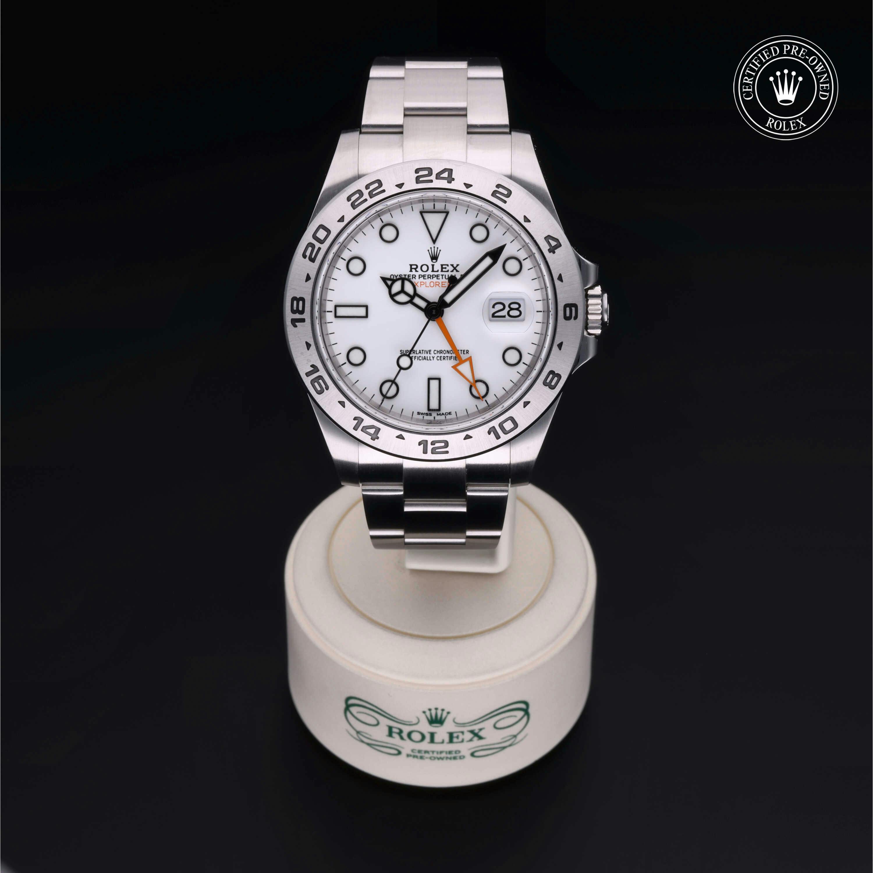 Rolex Certified Pre-Owned Explorer II (216570) self - winding automatic watch, features a 42mm stainless steel case and fixed bezel surrounding a white dial on a stainless steel oyster bracelet. Functions include hours, minutes, seconds, date and gmt/world time. This watch has received Rolex-authorized service and certification. It does not come with the original box or papers, but includes a custom Rolex Certified Pre-Owned hang tag, travel pouch and RCPO international warranty card.