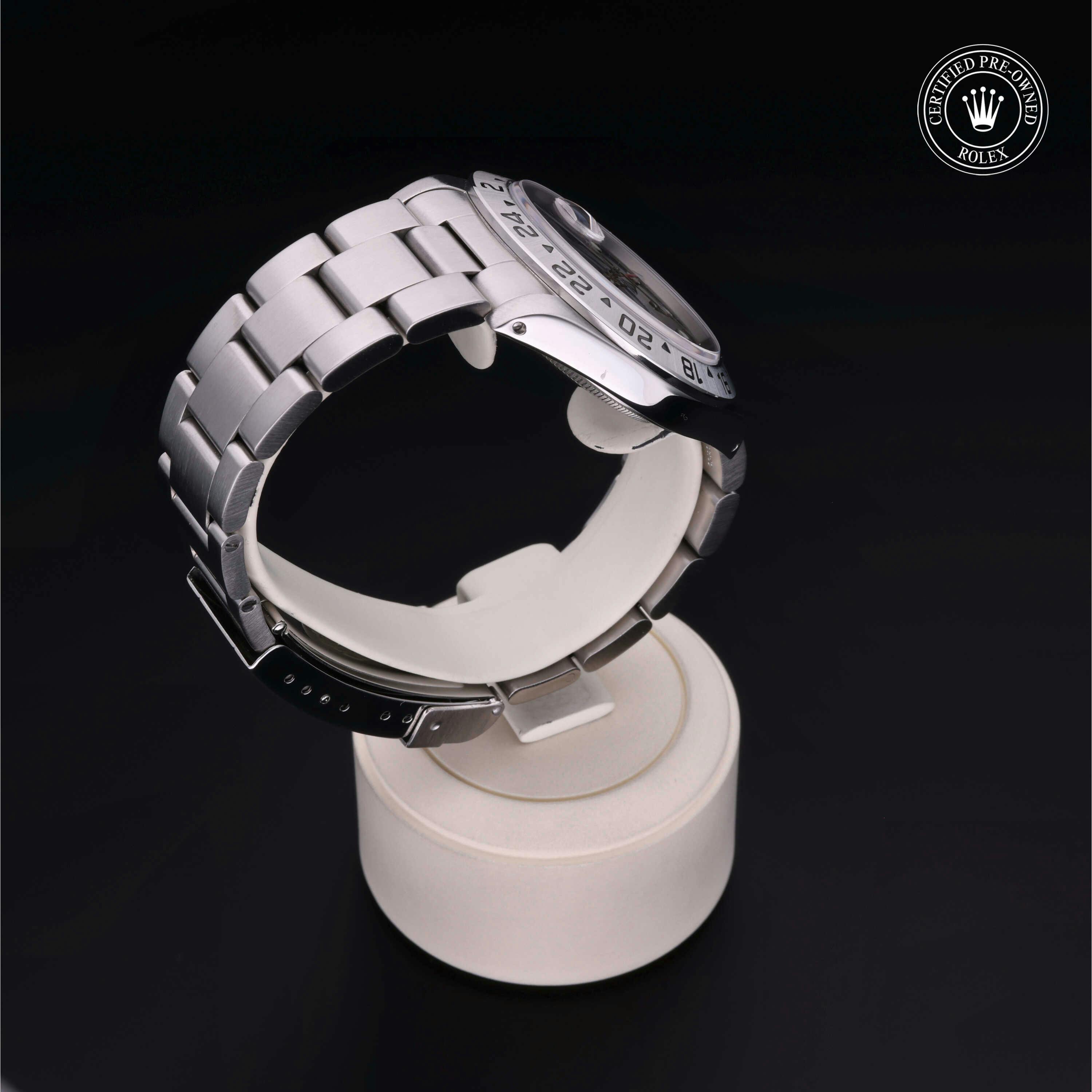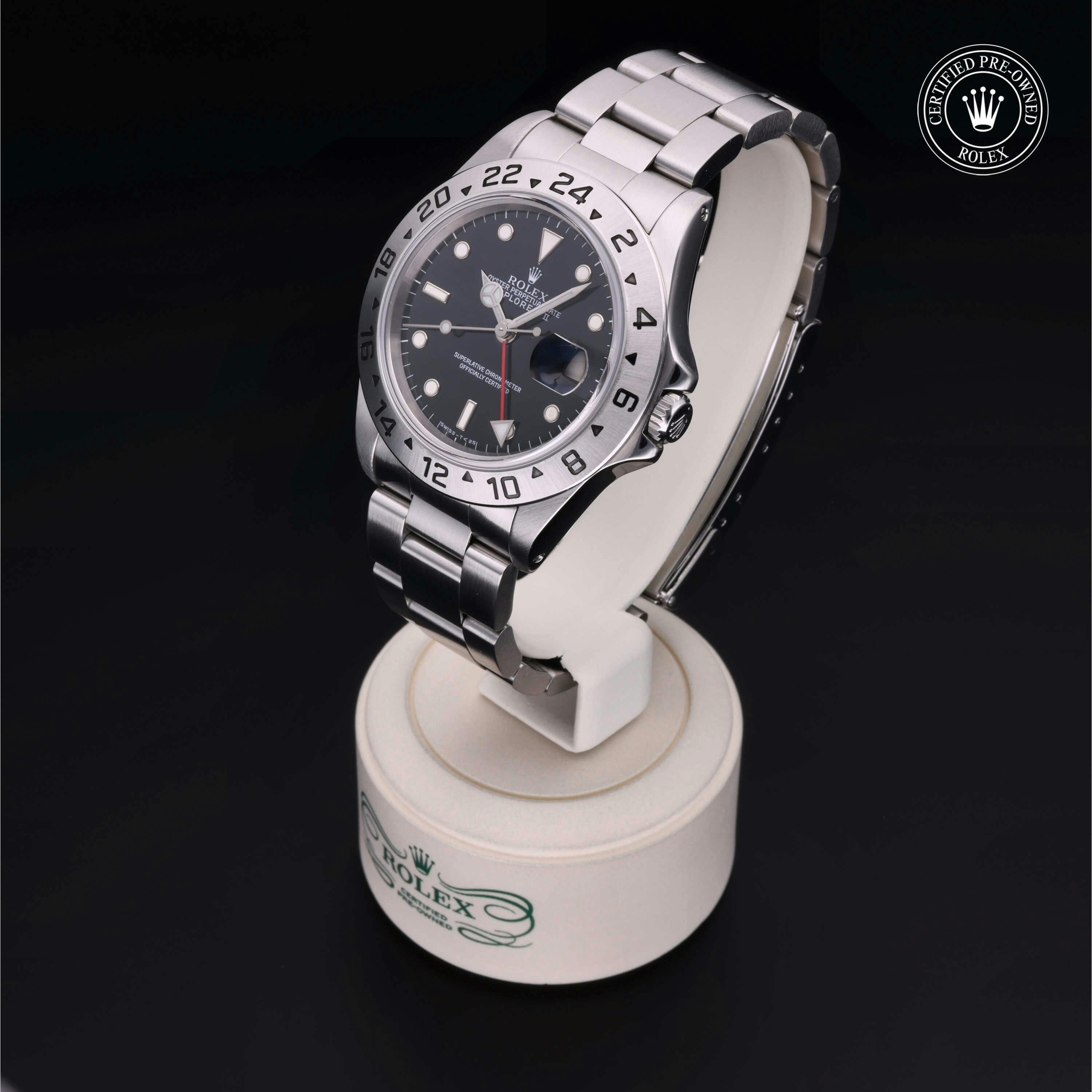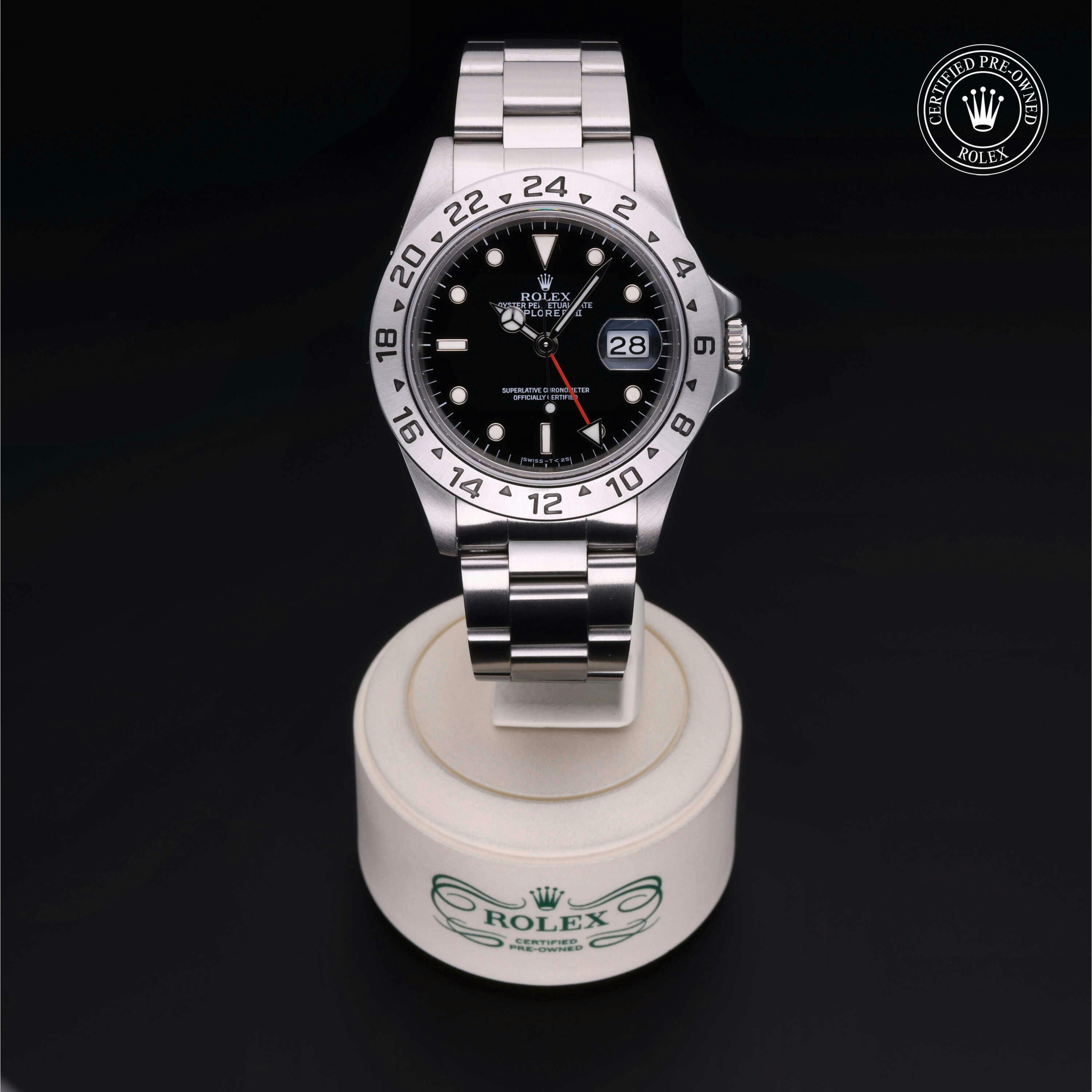 Rolex Certified Pre-Owned Explorer II (16570) self - winding automatic watch, features a 40mm stainless steel case and fixed bezel surrounding a black dial on a stainless steel oyster bracelet. Functions include hours, minutes, seconds, date and gmt/world time. This watch has received Rolex-authorized service and certification. It does not come with the original box or papers, but includes a custom Rolex Certified Pre-Owned hang tag, travel pouch and RCPO international warranty card.