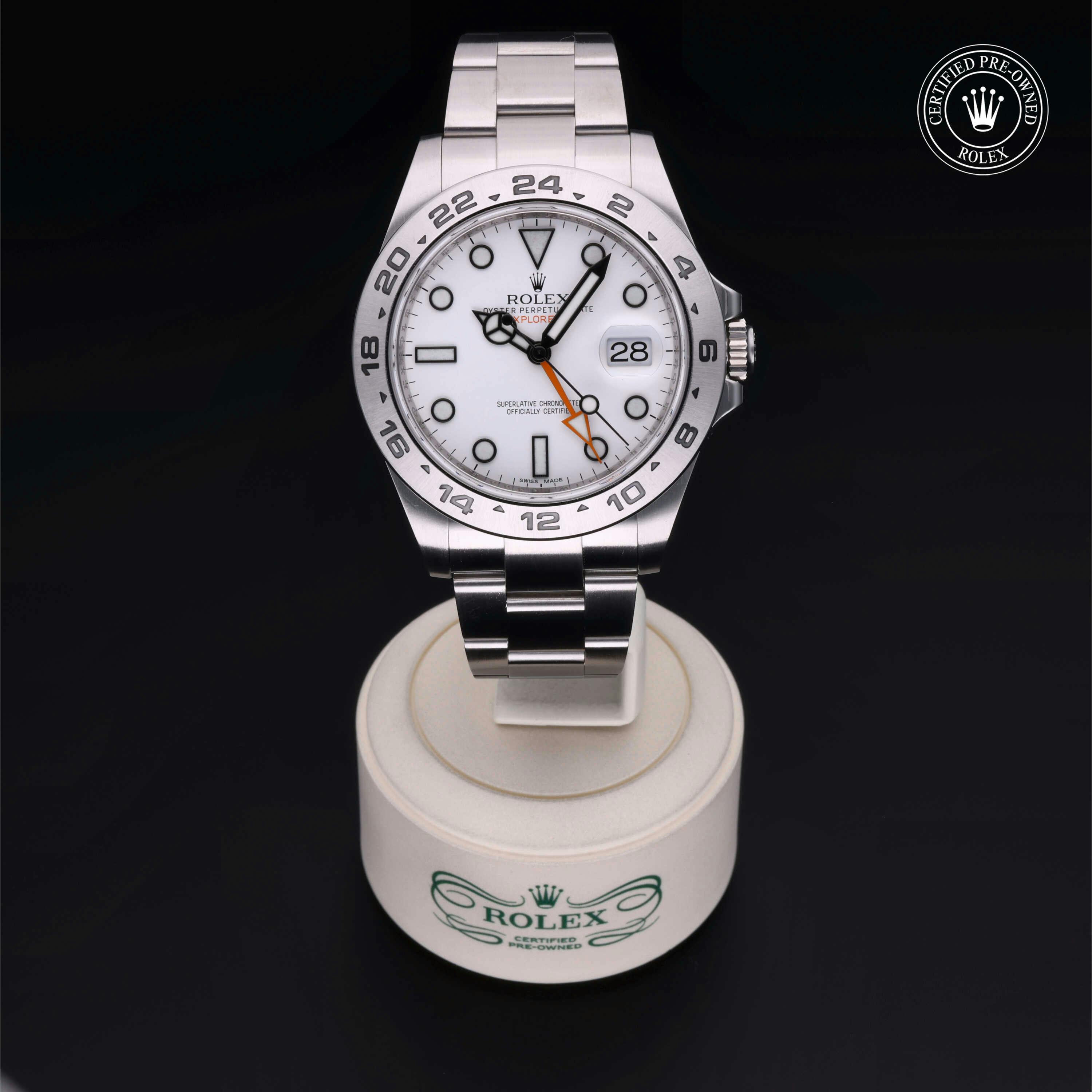 Rolex Certified Pre-Owned Explorer II (216570) self - winding automatic watch, features a 42mm stainless steel case and fixed bezel surrounding a white dial on a stainless steel oyster bracelet. Functions include hours, minutes, seconds, date and gmt/world time. This watch has received Rolex-authorized service and certification. It comes with the original papers, and includes a custom Rolex Certified Pre-Owned hang tag, travel pouch and RCPO international warranty card.