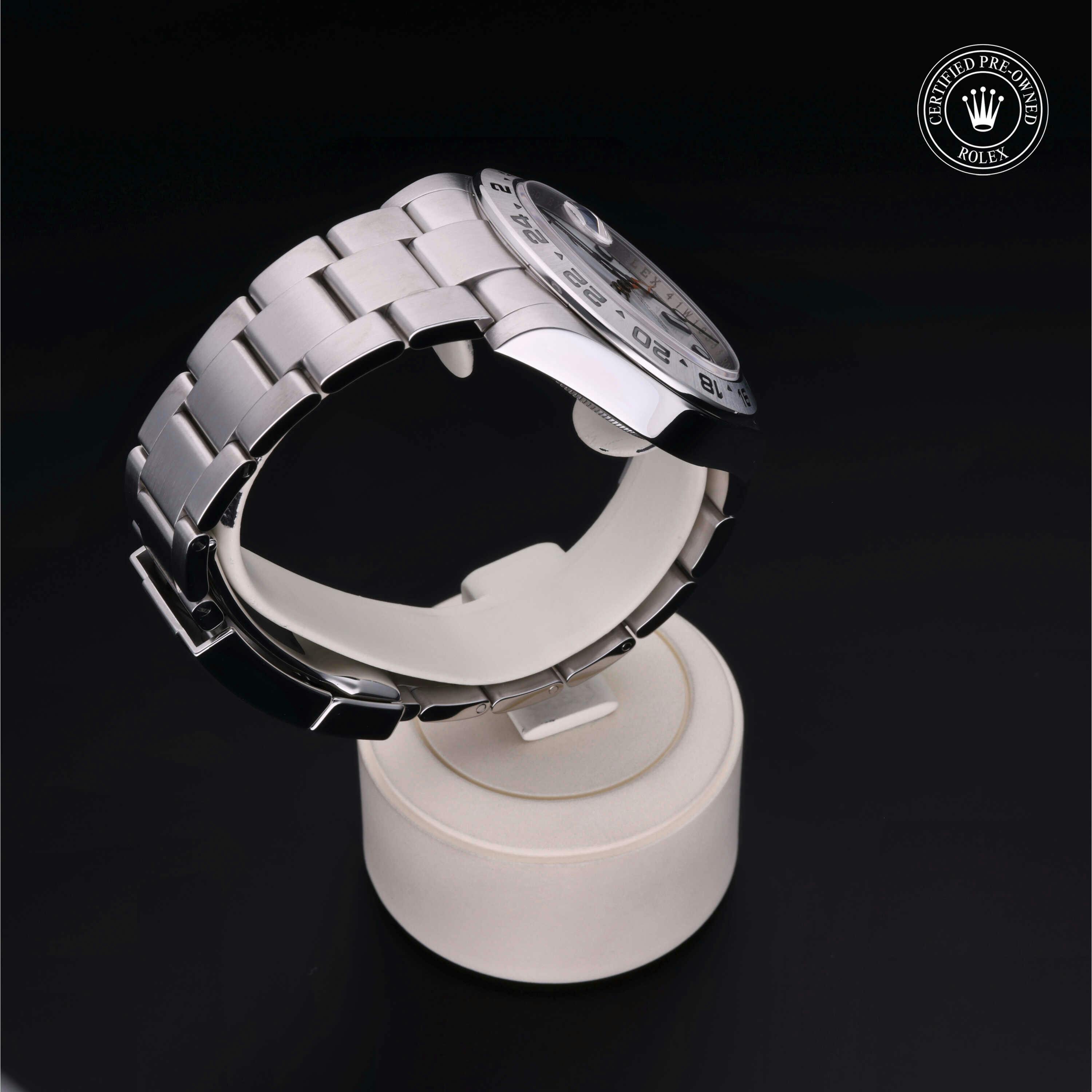 Rolex Certified Pre-Owned Explorer II (216570) self - winding automatic watch, features a 42mm stainless steel case and fixed bezel surrounding a white dial on a stainless steel oyster bracelet. Functions include hours, minutes, seconds, date and gmt/world time. This watch has received Rolex-authorized service and certification. It comes with the original papers, and includes a custom Rolex Certified Pre-Owned hang tag, travel pouch and RCPO international warranty card.
