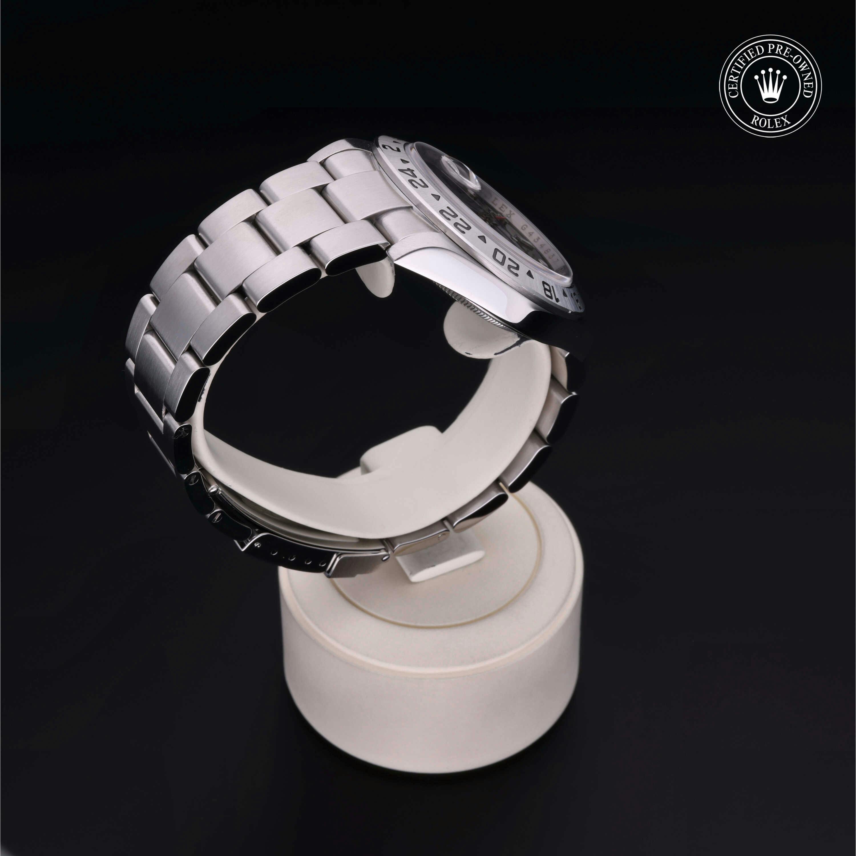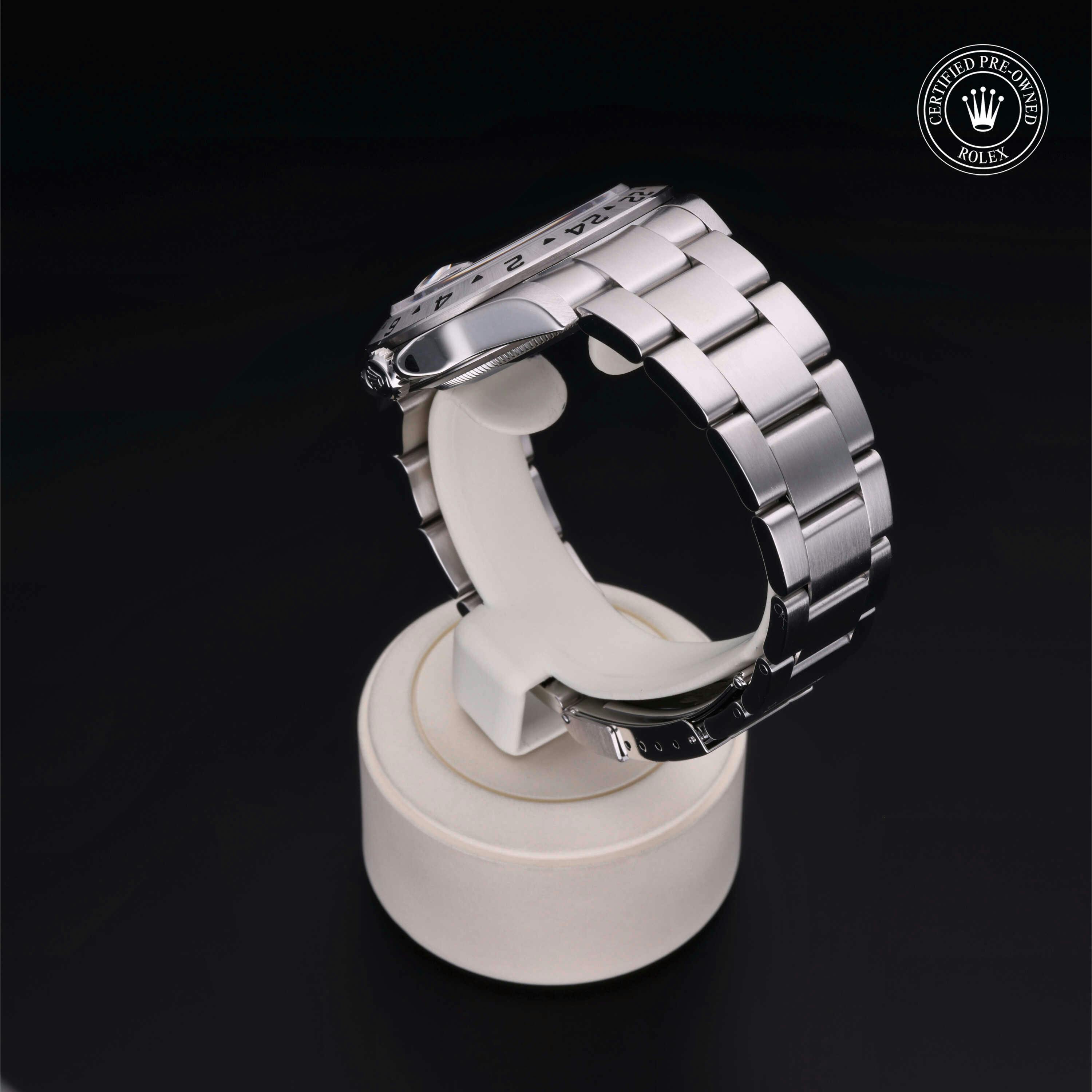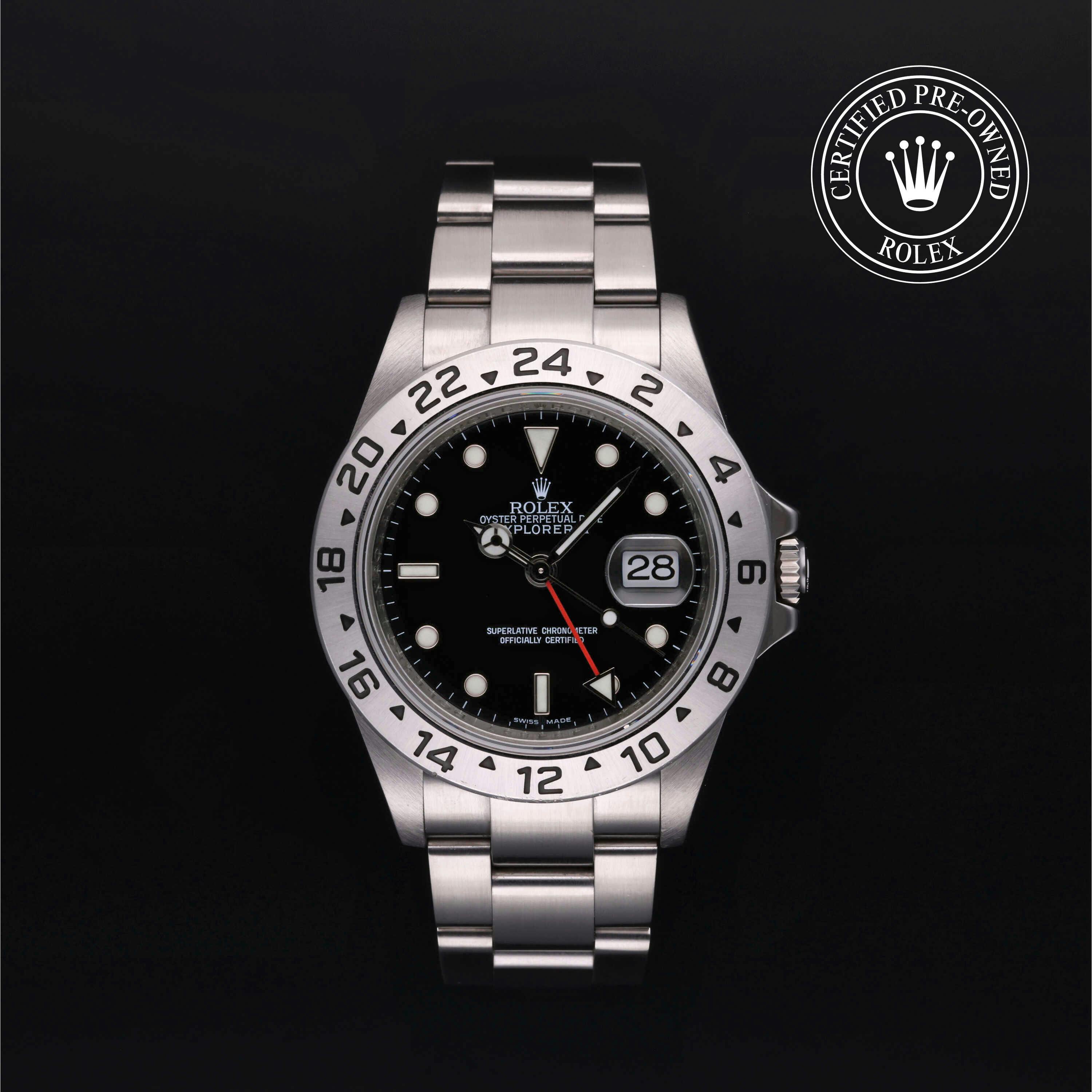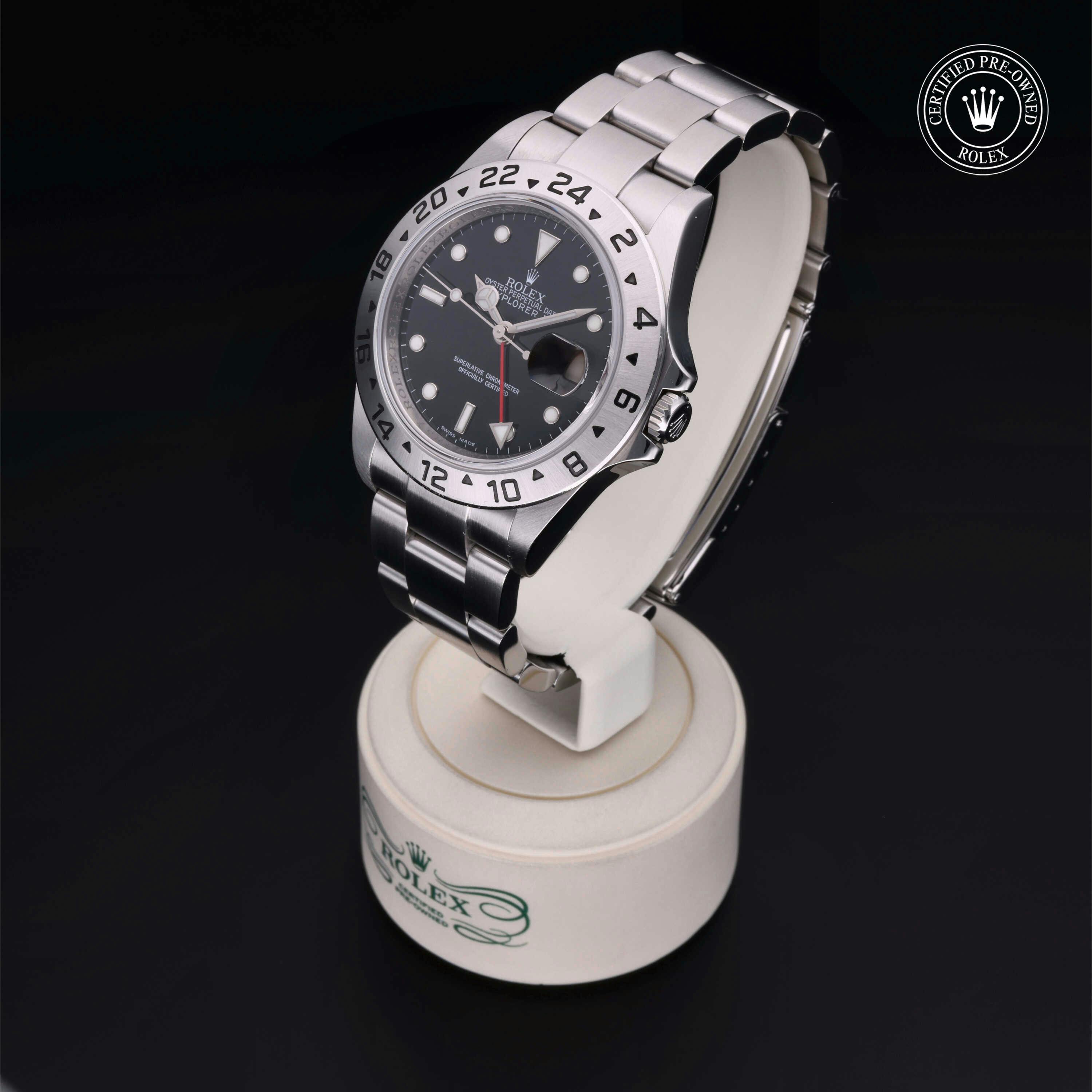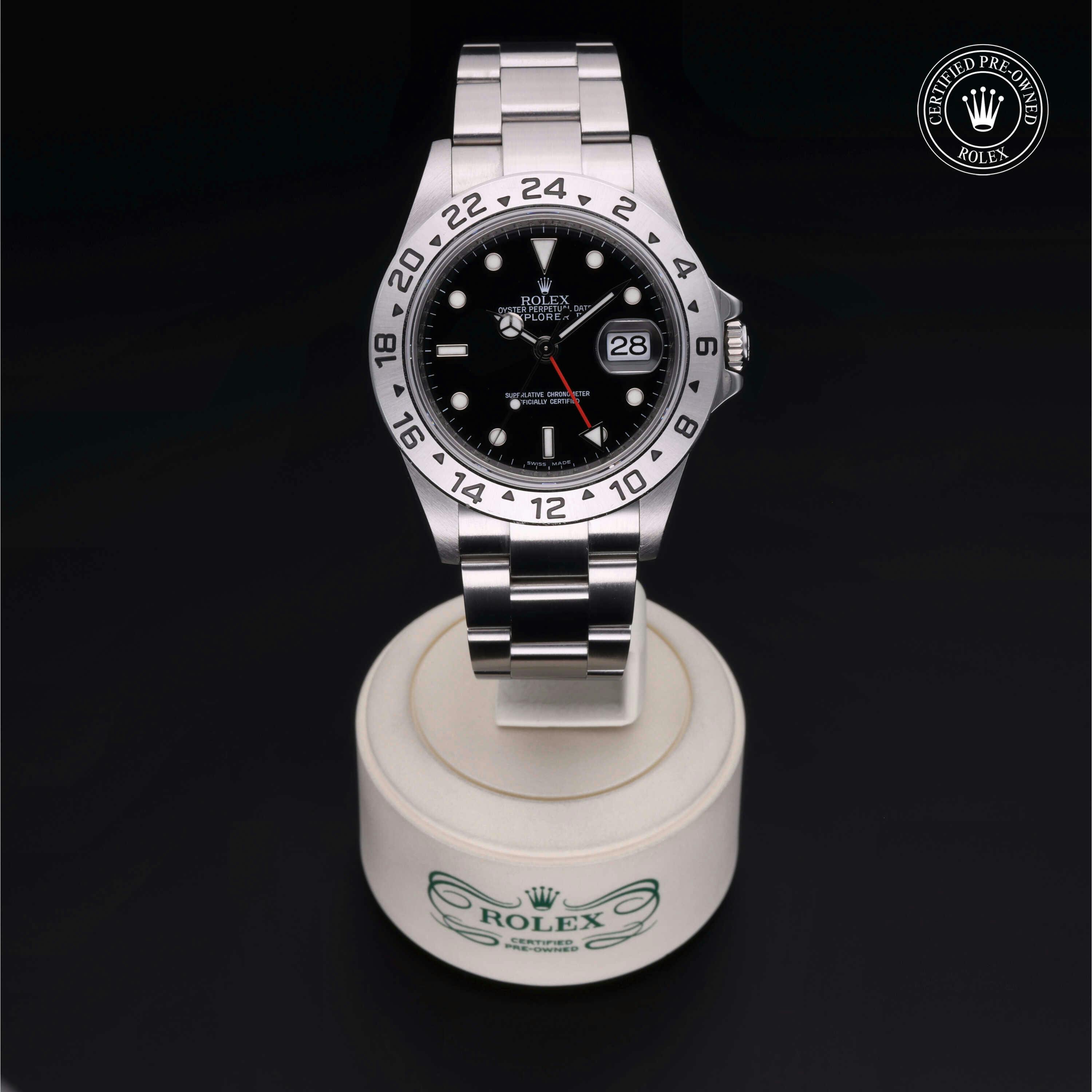 Rolex Certified Pre-Owned Explorer II (16570) self - winding automatic watch, features a 40mm stainless steel case and fixed bezel surrounding a black dial. The watch is secured on a stainless steel Oyster bracelet complete with a folding buckle. Functions include hours, minutes, seconds, date and gmt/world time. This watch has received Rolex-authorized service and certification. It comes with the original papers, and includes a custom Rolex Certified Pre-Owned hang tag, travel pouch and RCPO international warranty card.