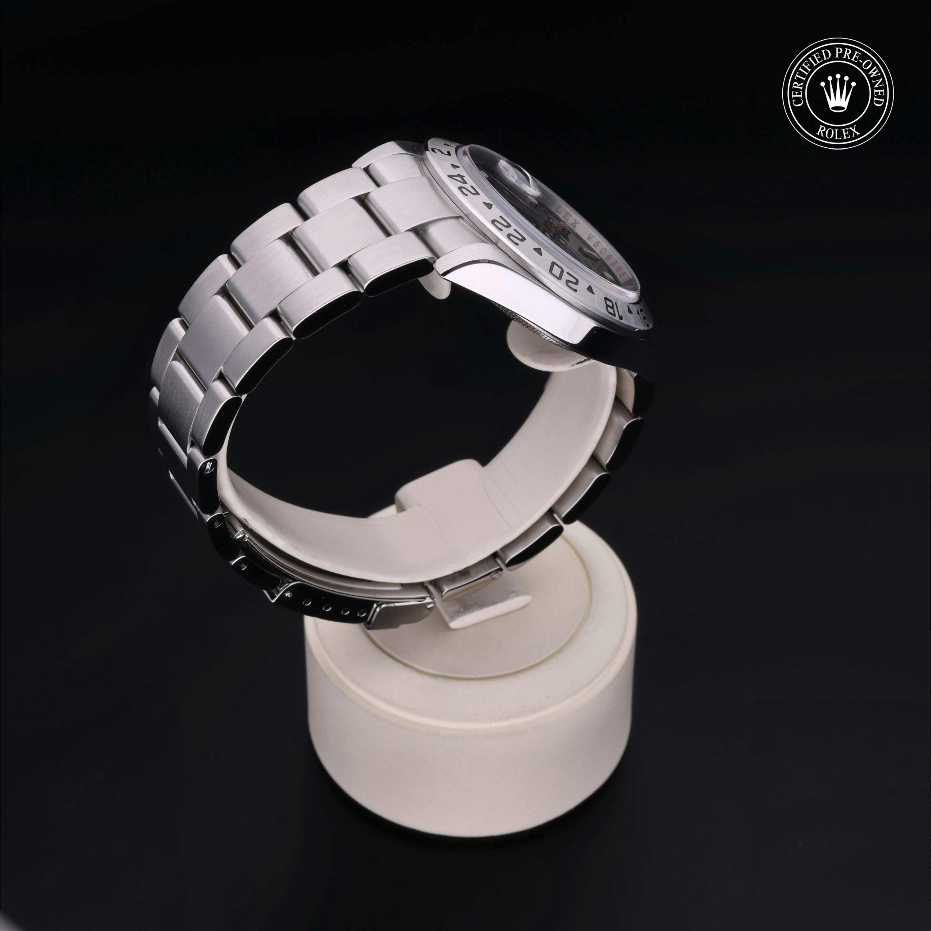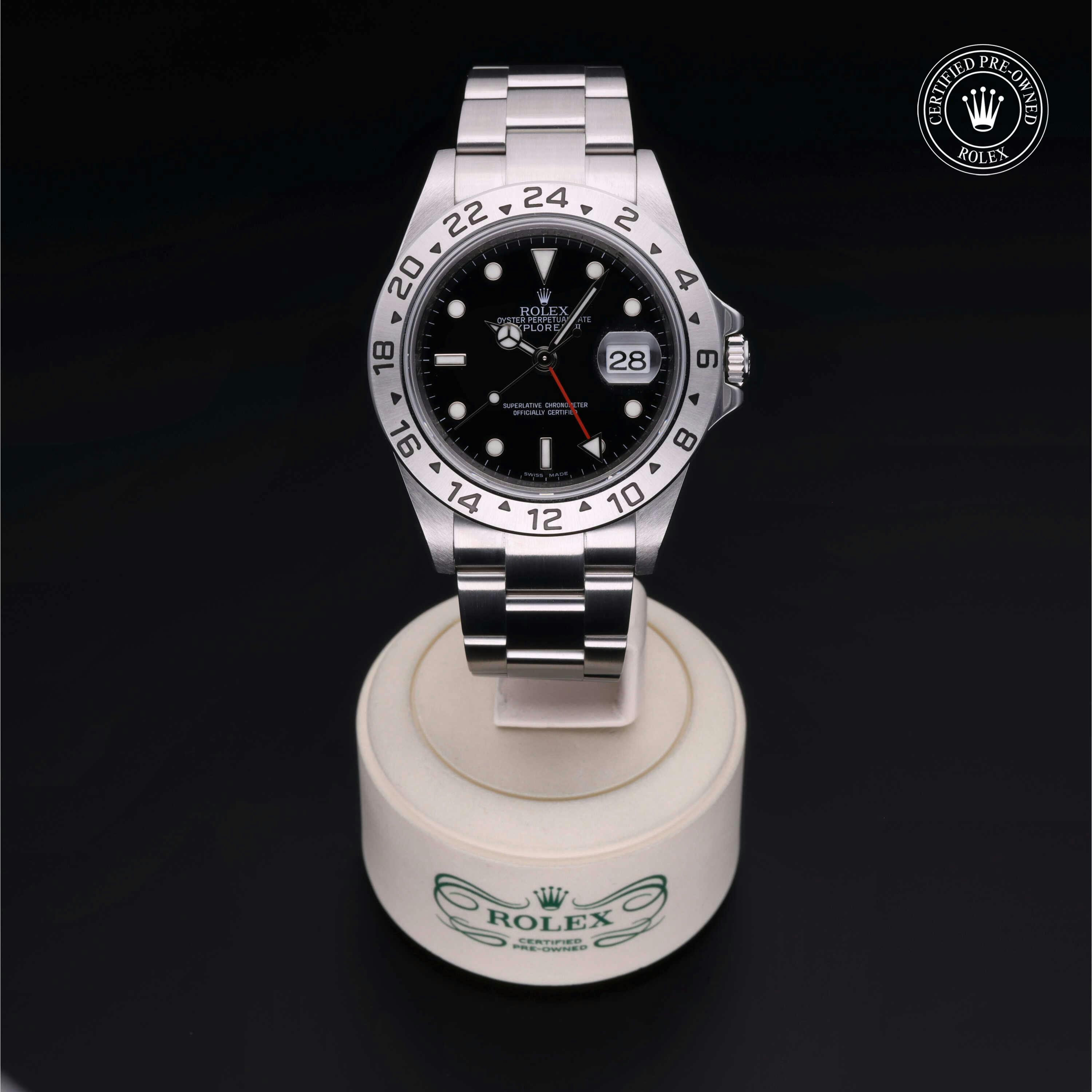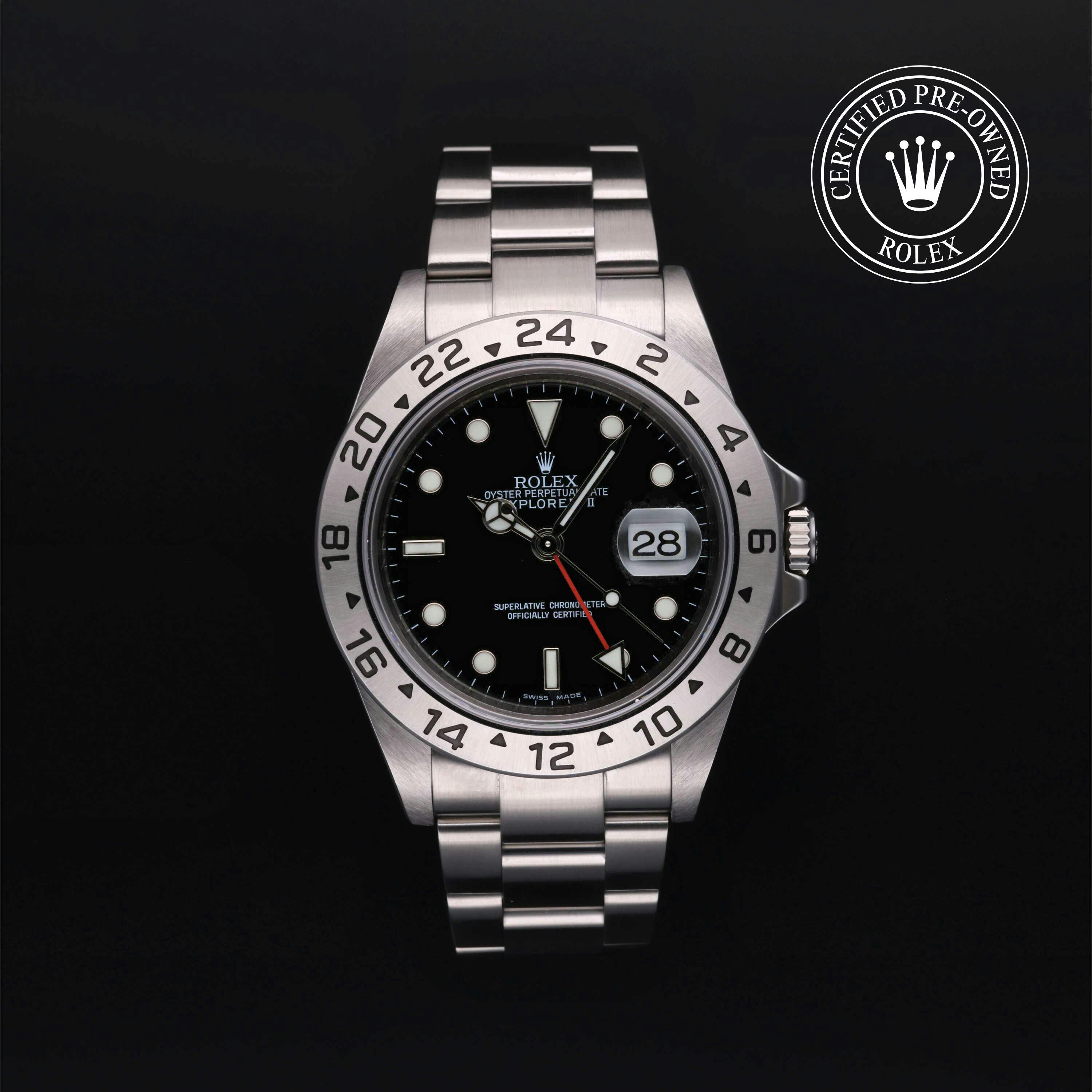 Rolex Certified Pre-Owned Explorer II (16570) self - winding automatic watch, features a 40mm stainless steel case and fixed bezel surrounding a black dial on a stainless steel oyster bracelet. Functions include hours, minutes, seconds, date and gmt/world time. This watch has received Rolex-authorized service and certification. It comes with the original papers, and includes a custom Rolex Certified Pre-Owned hang tag, travel pouch and RCPO international warranty card.