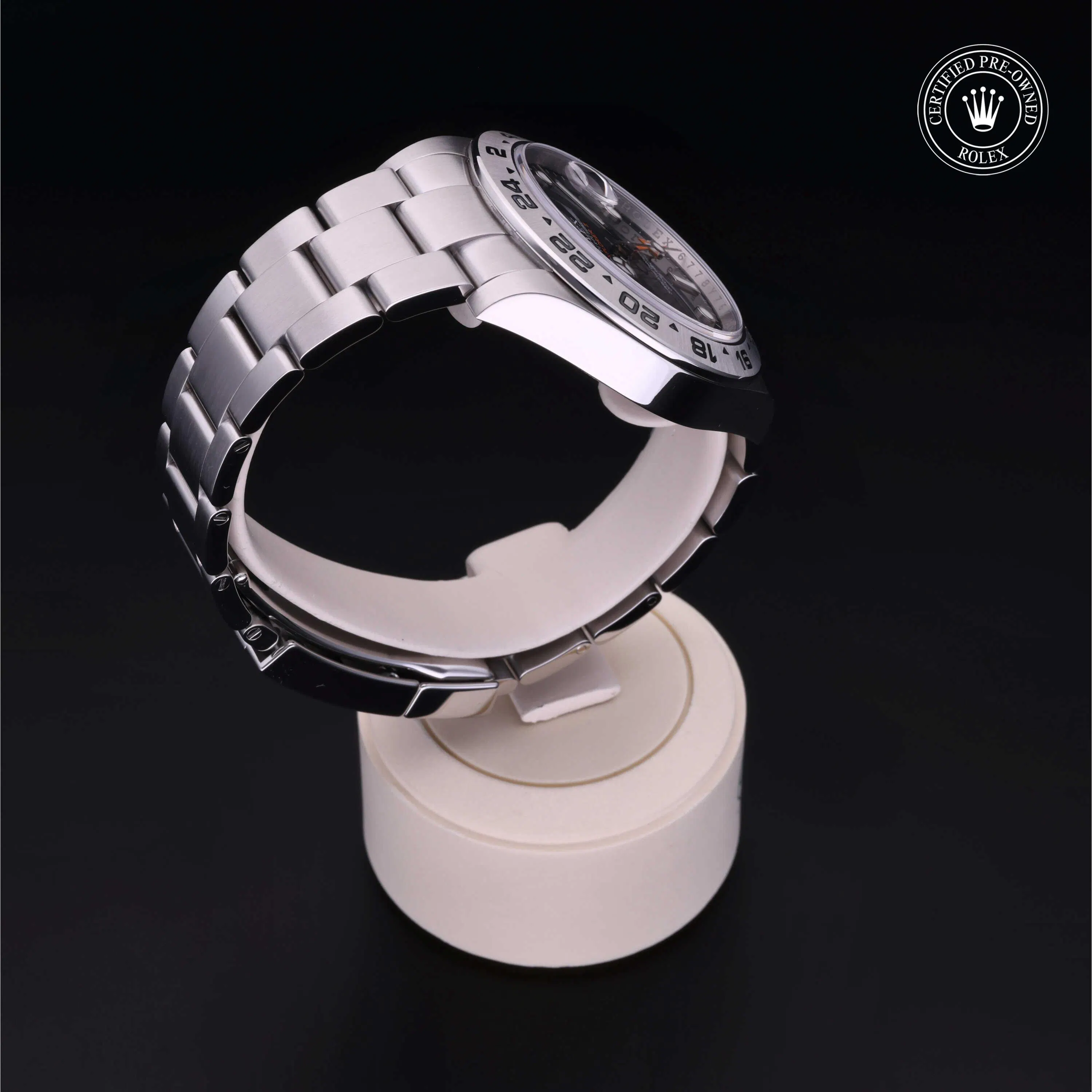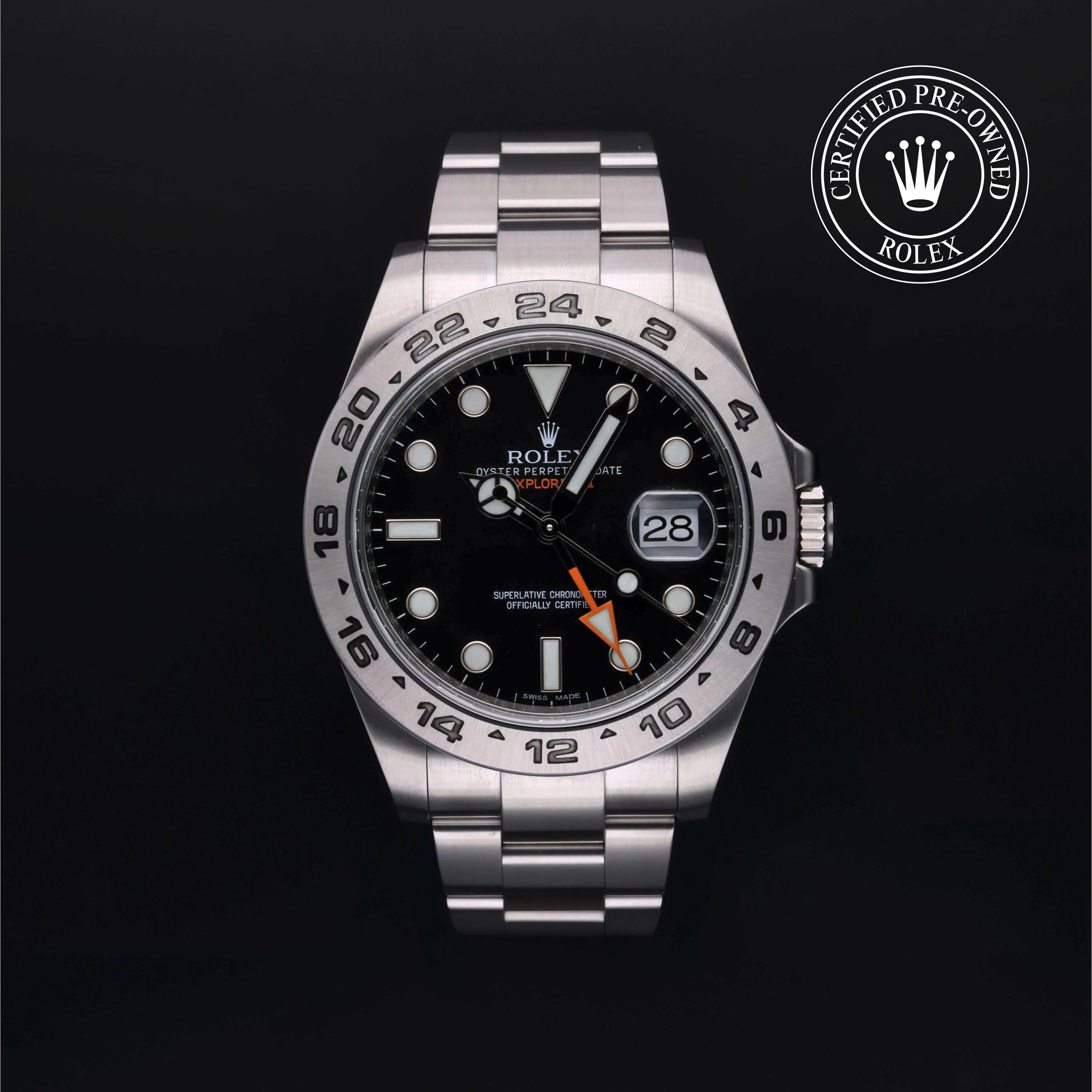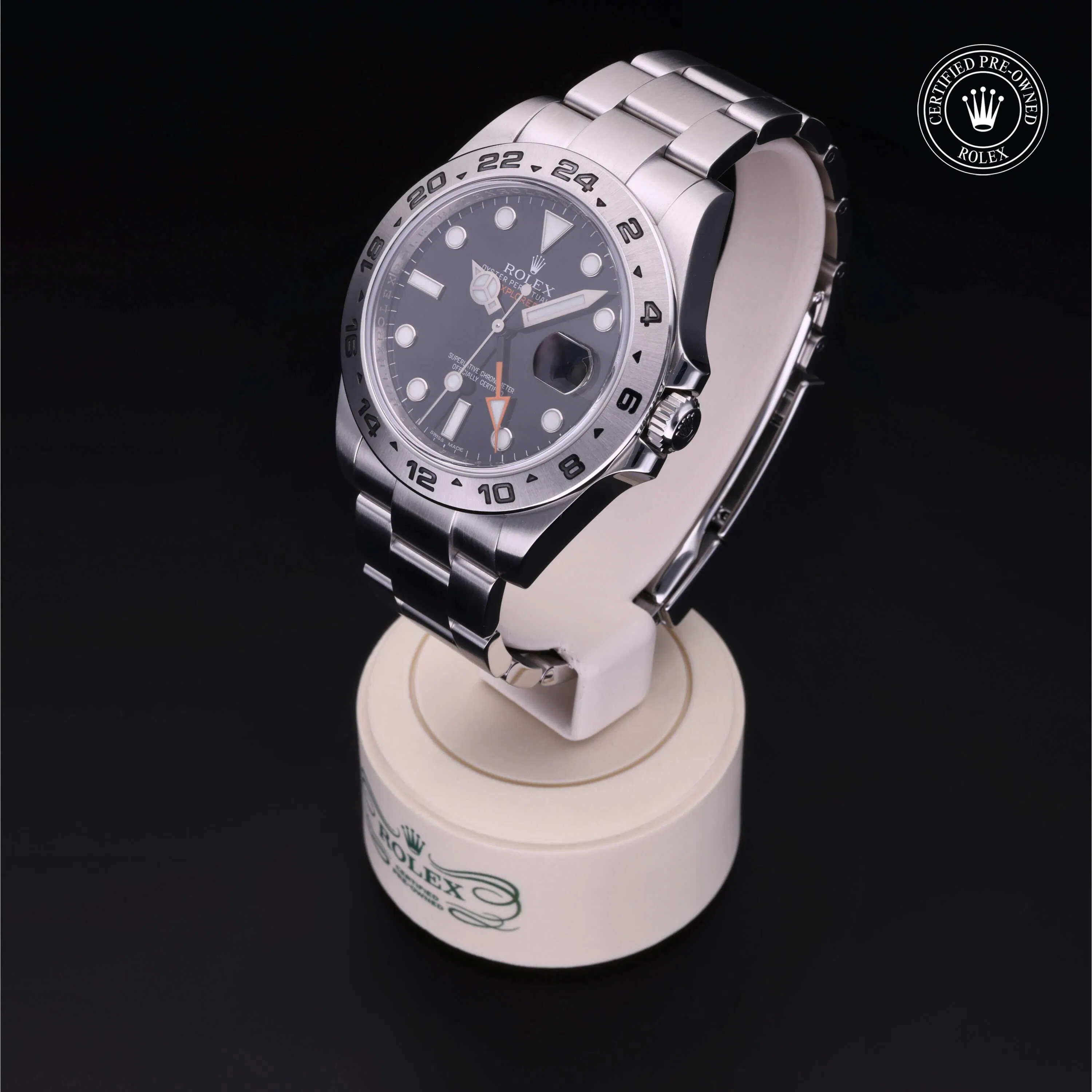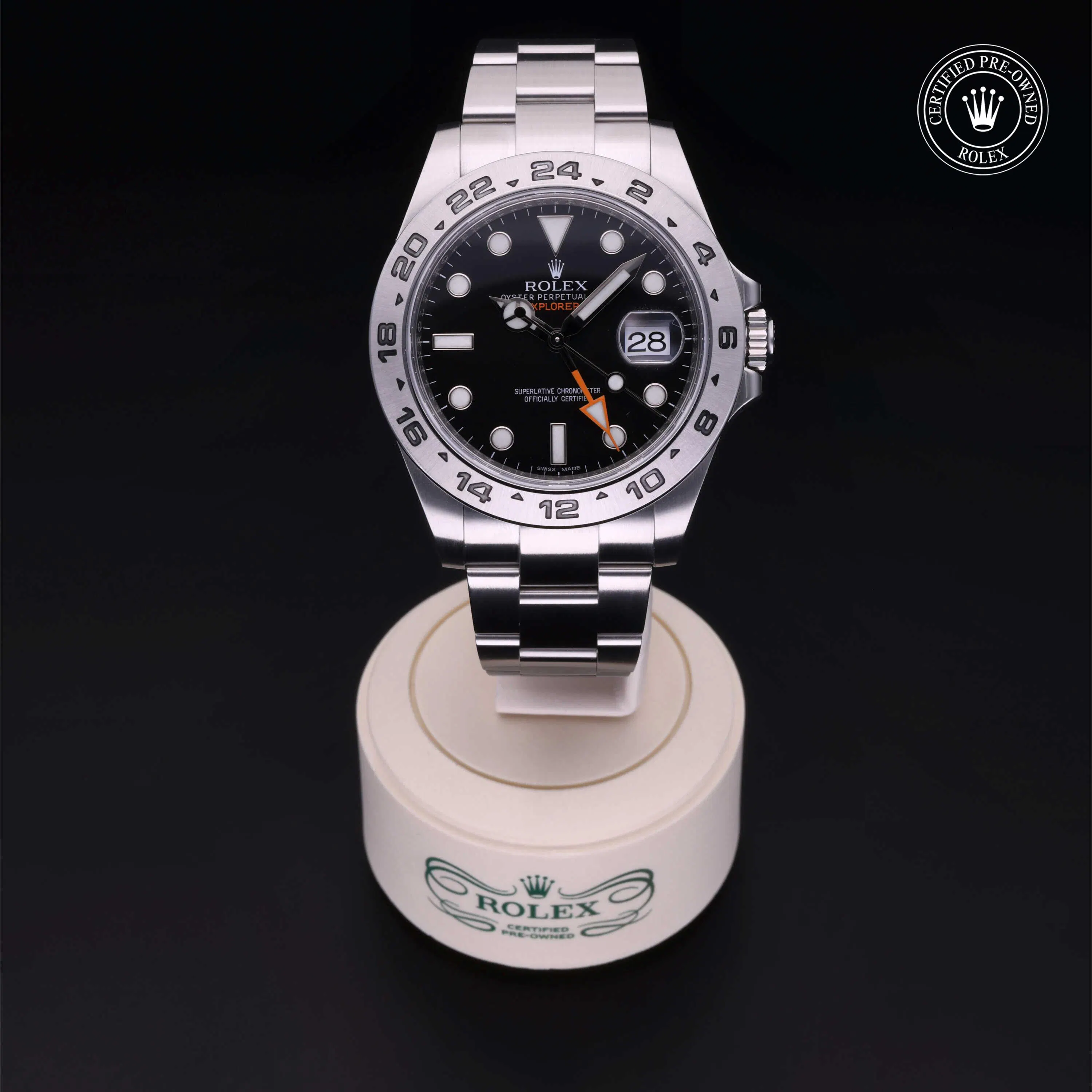 Rolex Certified Pre-Owned Explorer II (216570) self - winding automatic watch, features a 42mm stainless steel case and fixed bezel surrounding a black dial on a stainless steel oyster bracelet. Functions include hours, minutes, seconds, date and gmt/world time. This watch has received Rolex-authorized service and certification. It comes with the original box and papers, and includes a custom Rolex Certified Pre-Owned hang tag, travel pouch and RCPO international warranty card.
