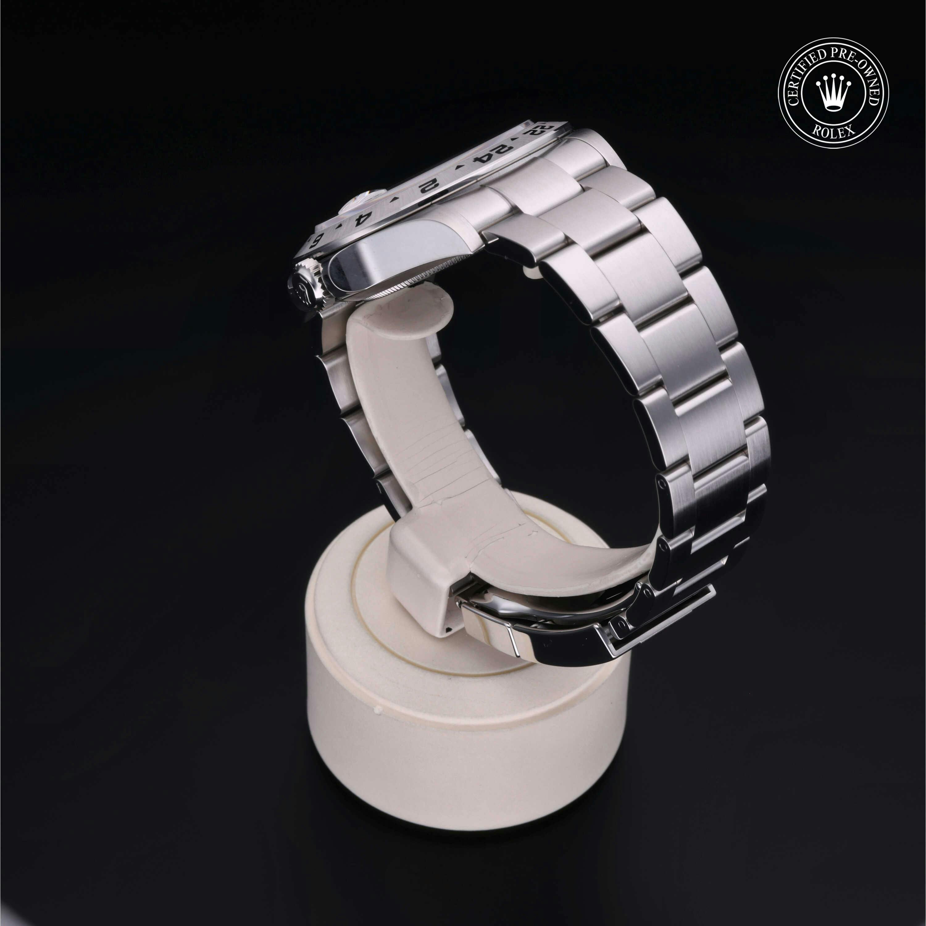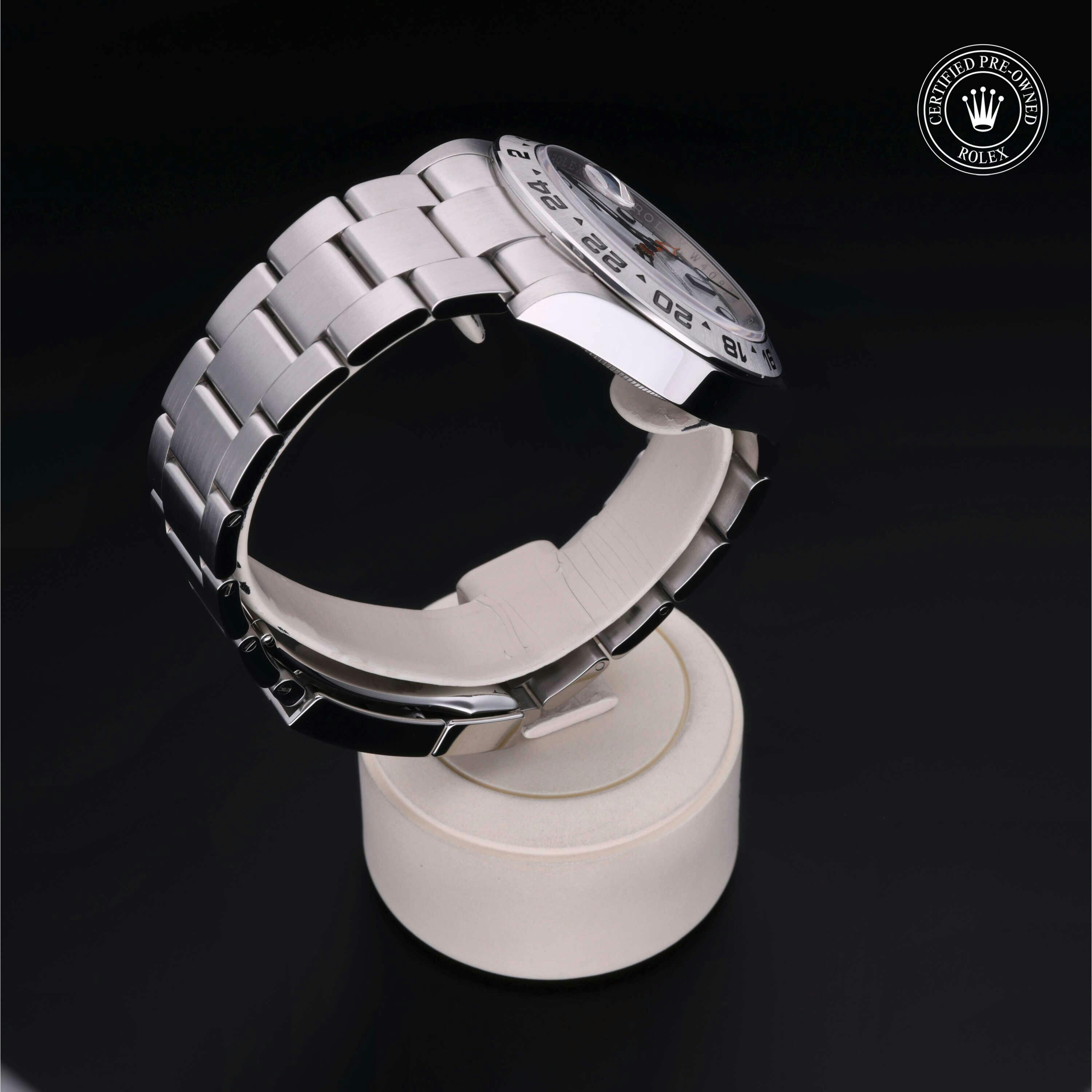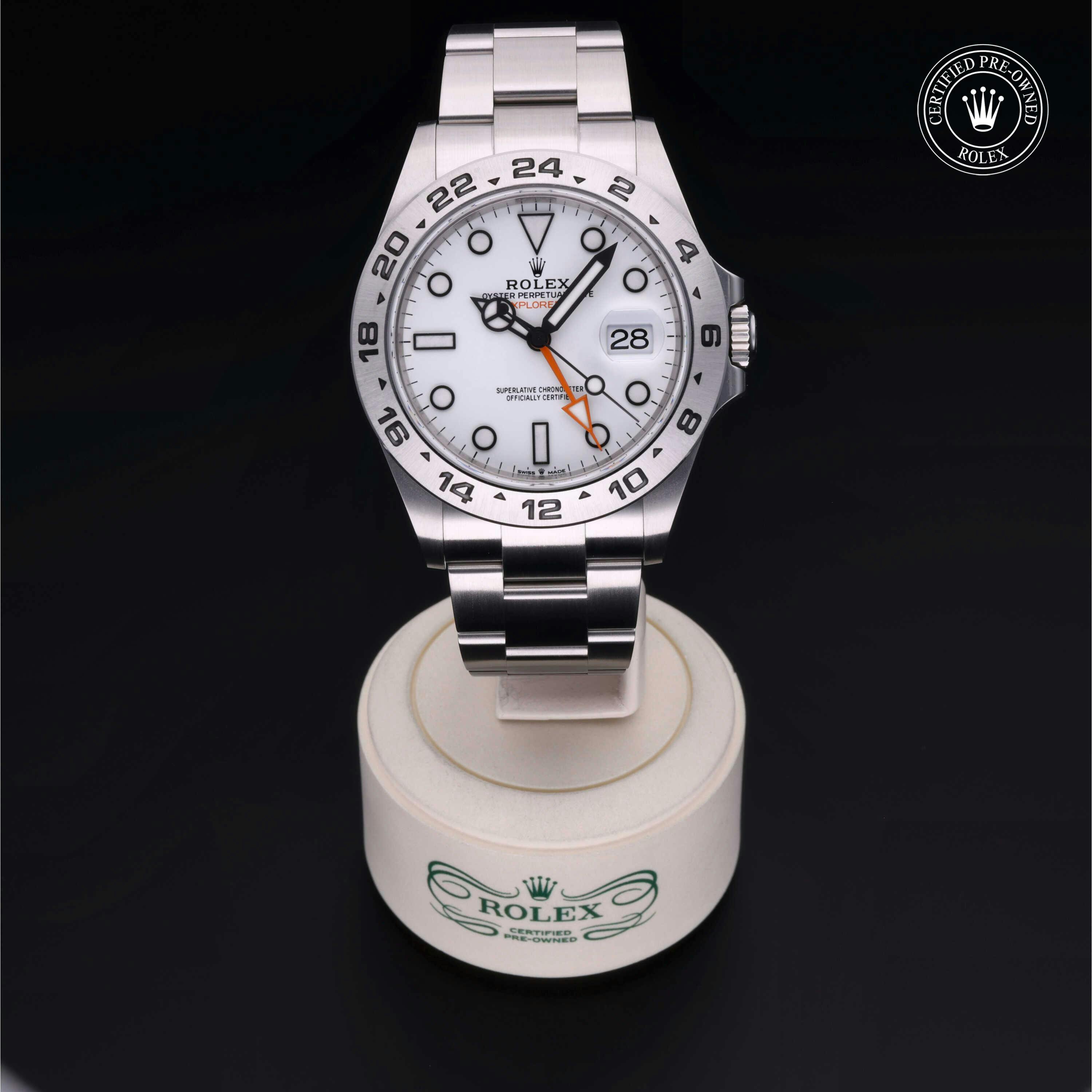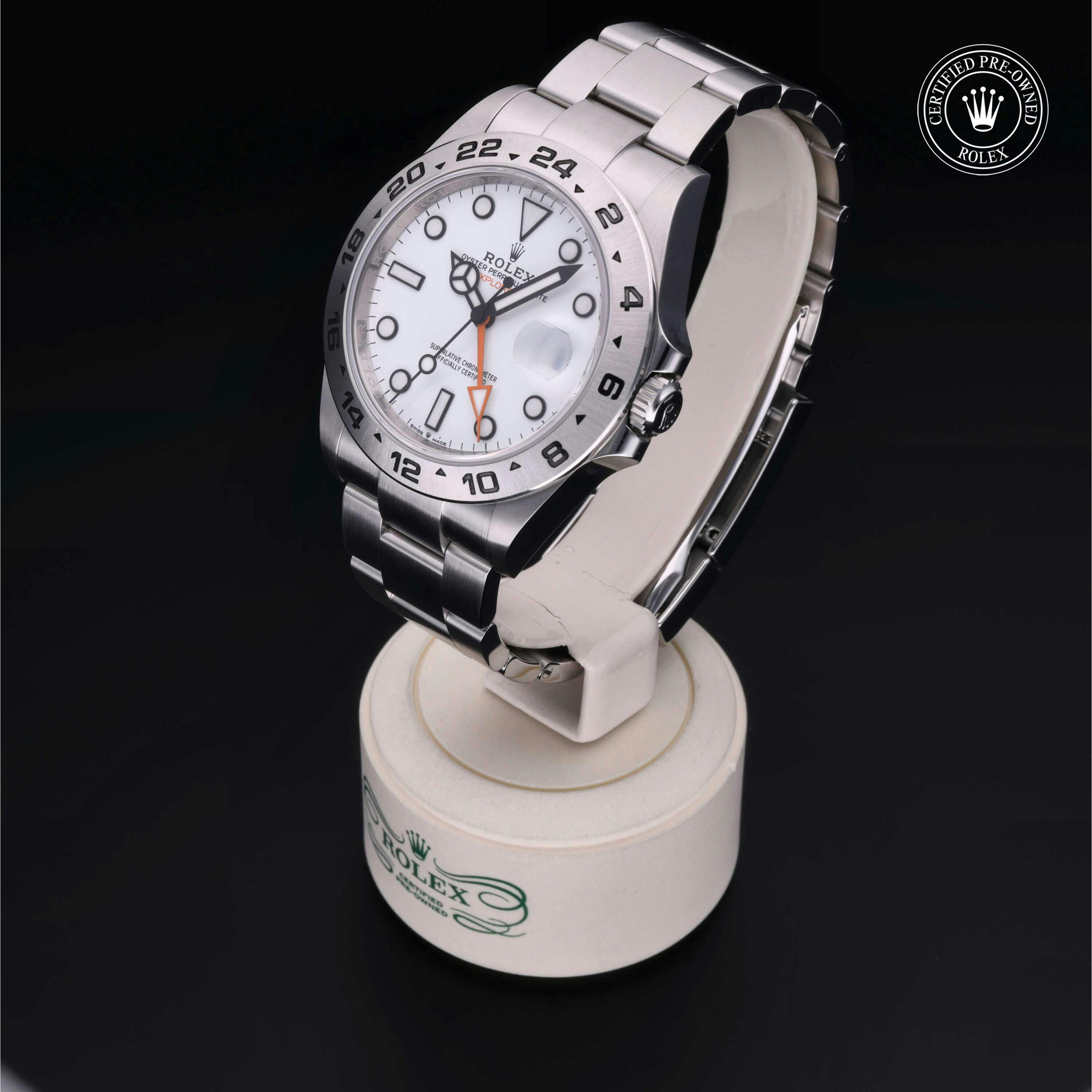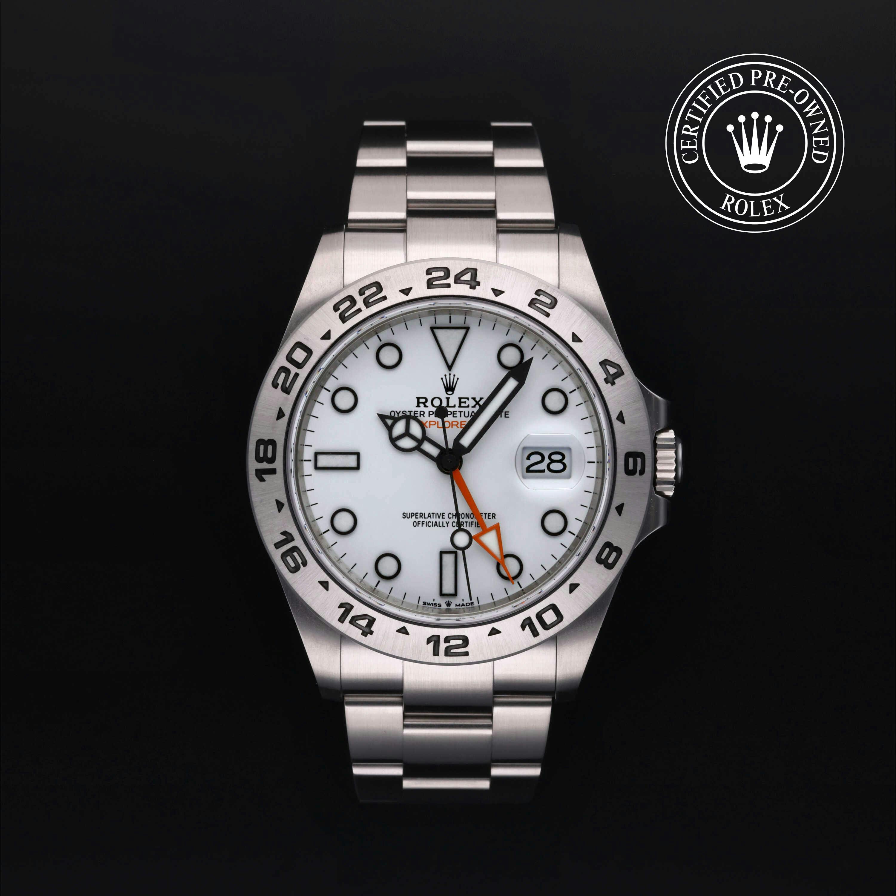Rolex Certified Pre-Owned Explorer II (226570) self - winding automatic watch, features a 42mm stainless steel case and fixed bezel surrounding a white dial on a stainless steel oyster bracelet. Functions include hours, minutes, seconds, date and gmt/world time. This watch has received Rolex-authorized service and certification. It comes with the original box and papers, and includes a custom Rolex Certified Pre-Owned hang tag, travel pouch and RCPO international warranty card.