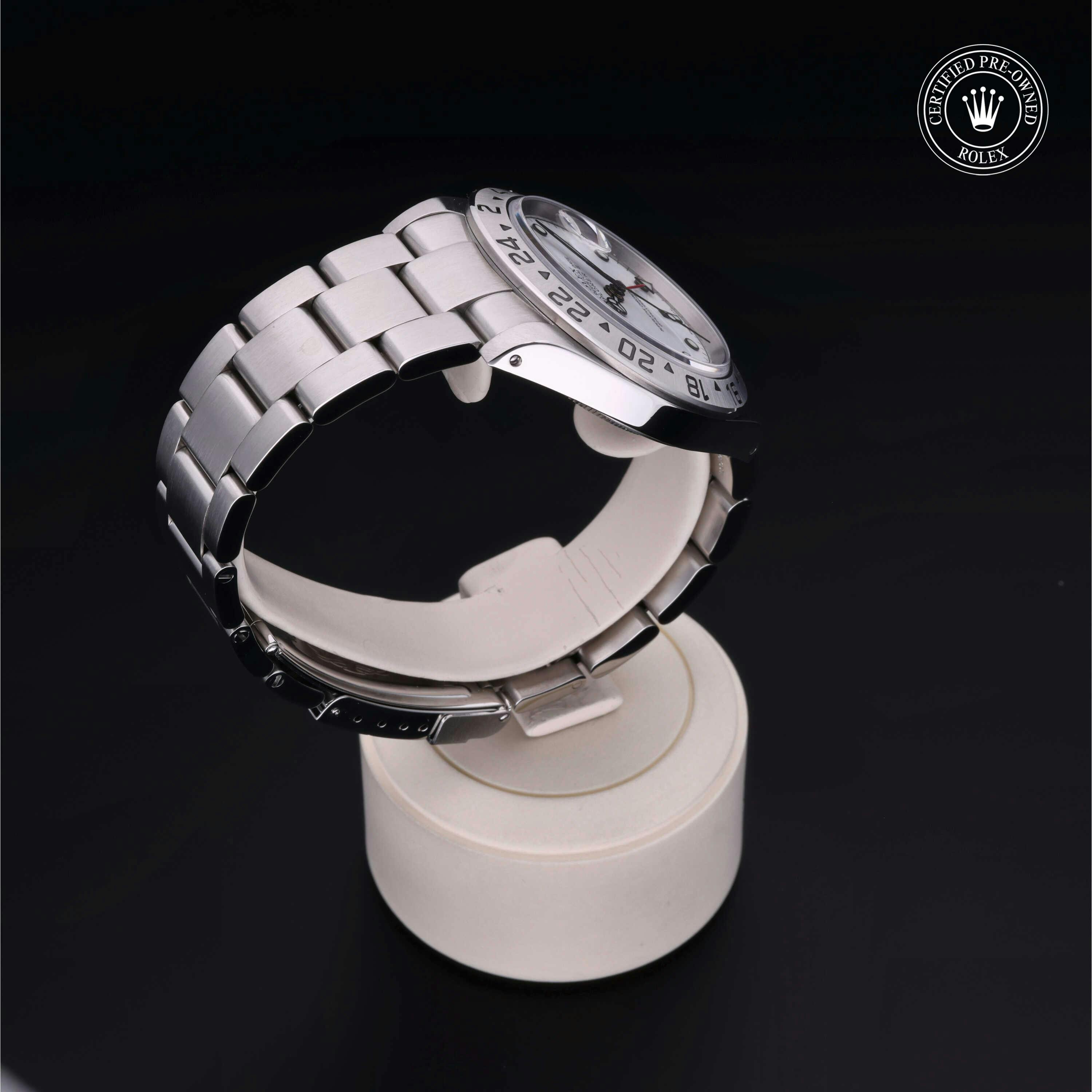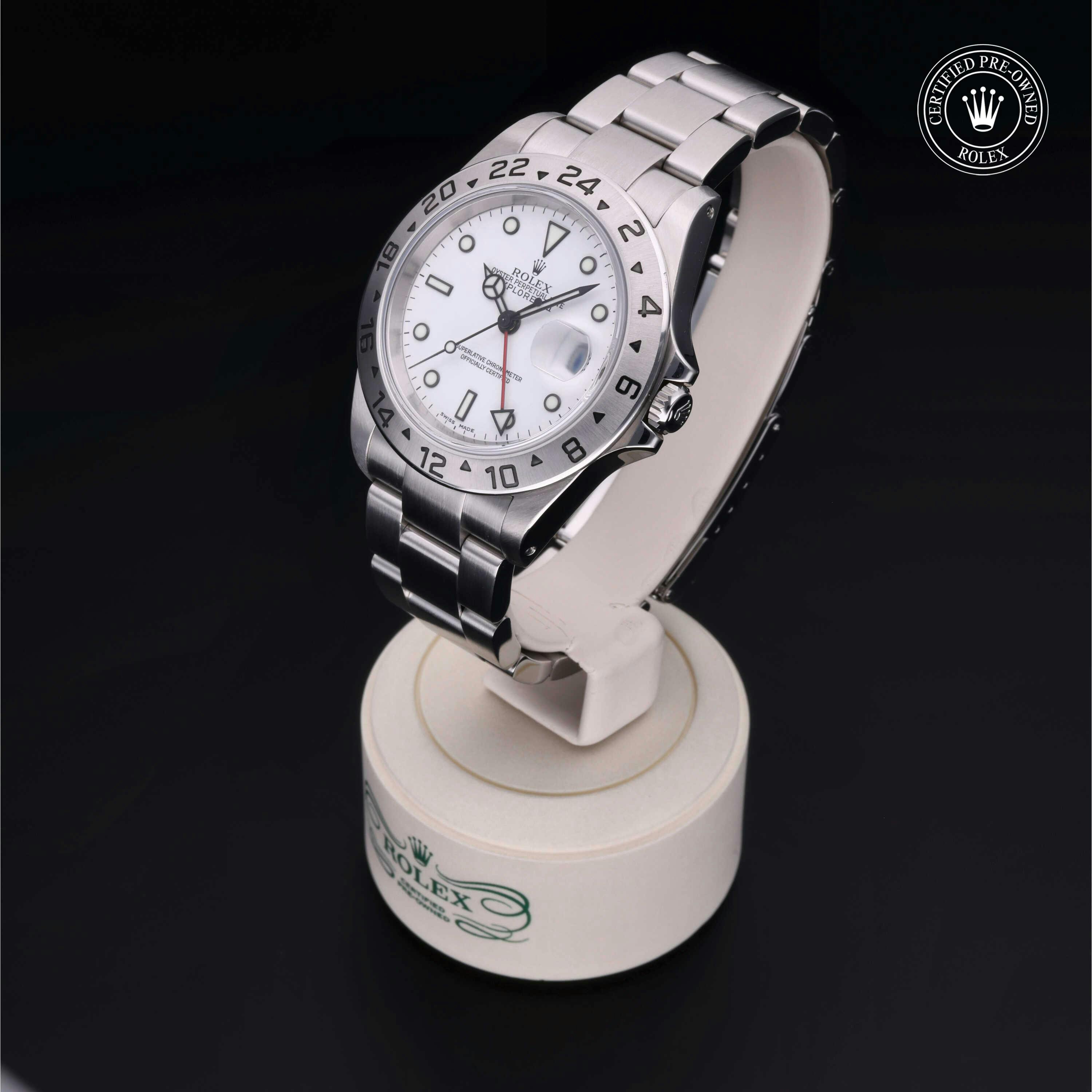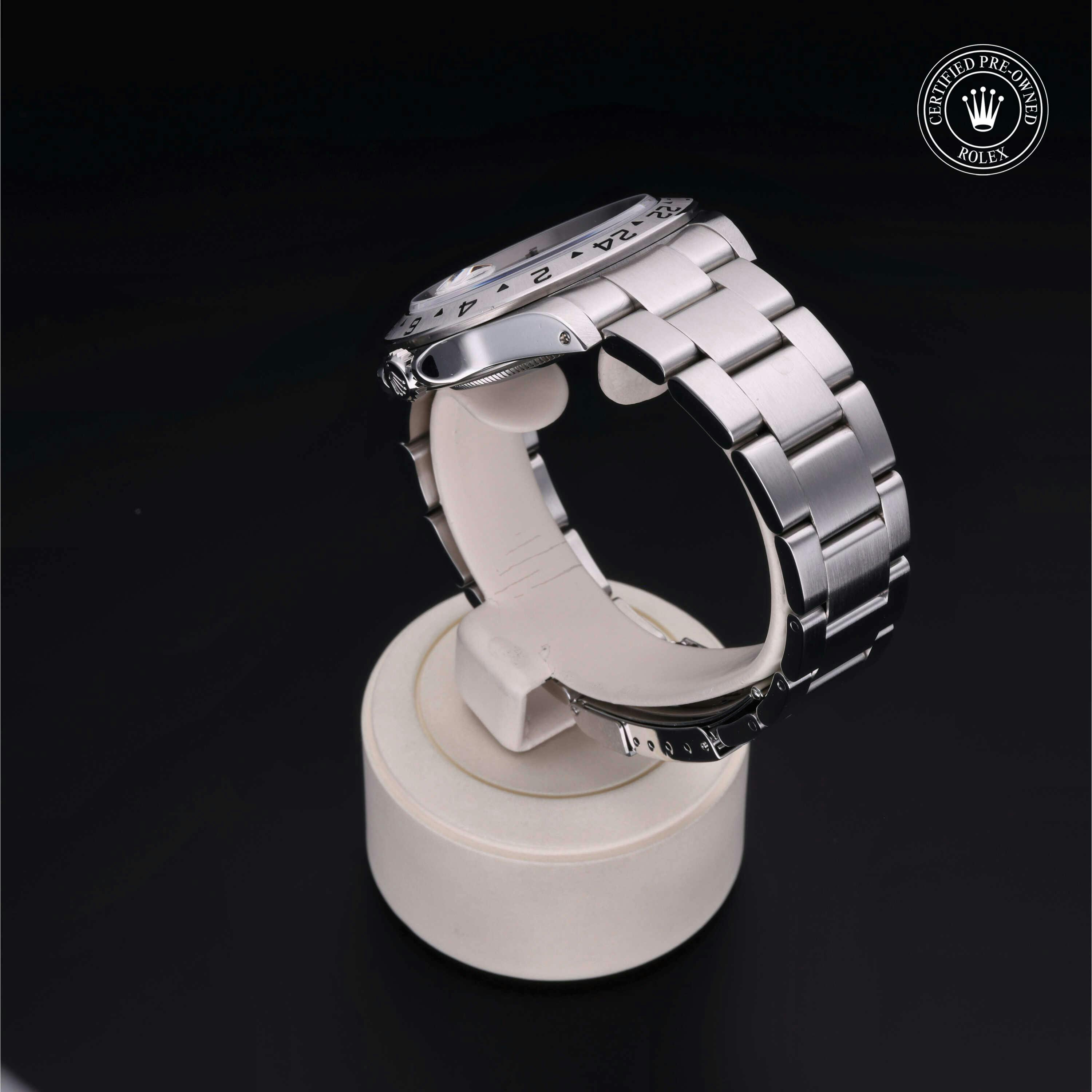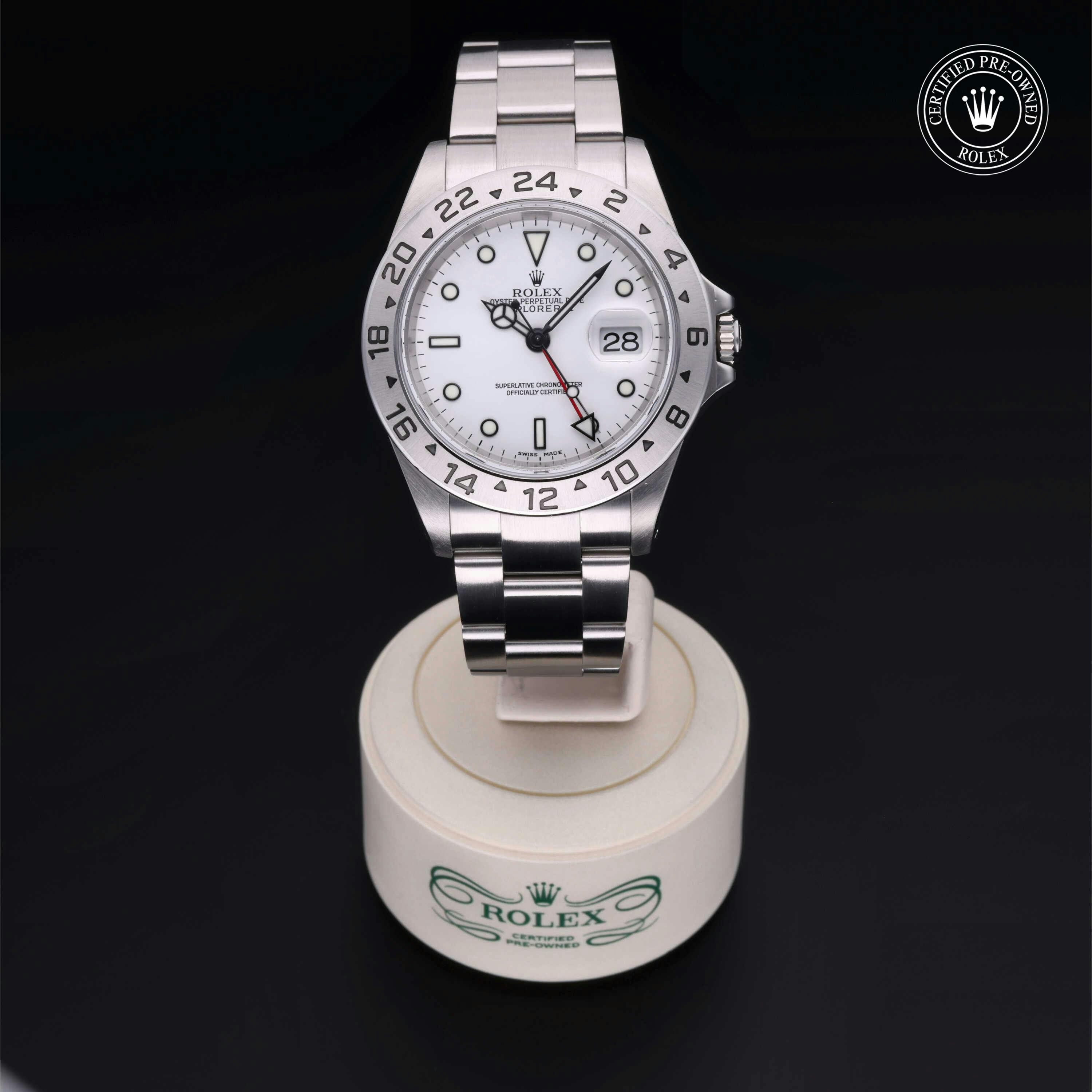 Rolex Certified Pre-Owned Explorer II (16570) self - winding automatic watch, features a 40mm stainless steel case and fixed bezel surrounding a white dial on a stainless steel oyster bracelet. Functions include hours, minutes, seconds, date and gmt/world time. This watch has received Rolex-authorized service and certification. It does not come with the original box or papers, but includes a custom Rolex Certified Pre-Owned hang tag, travel pouch and RCPO international warranty card.