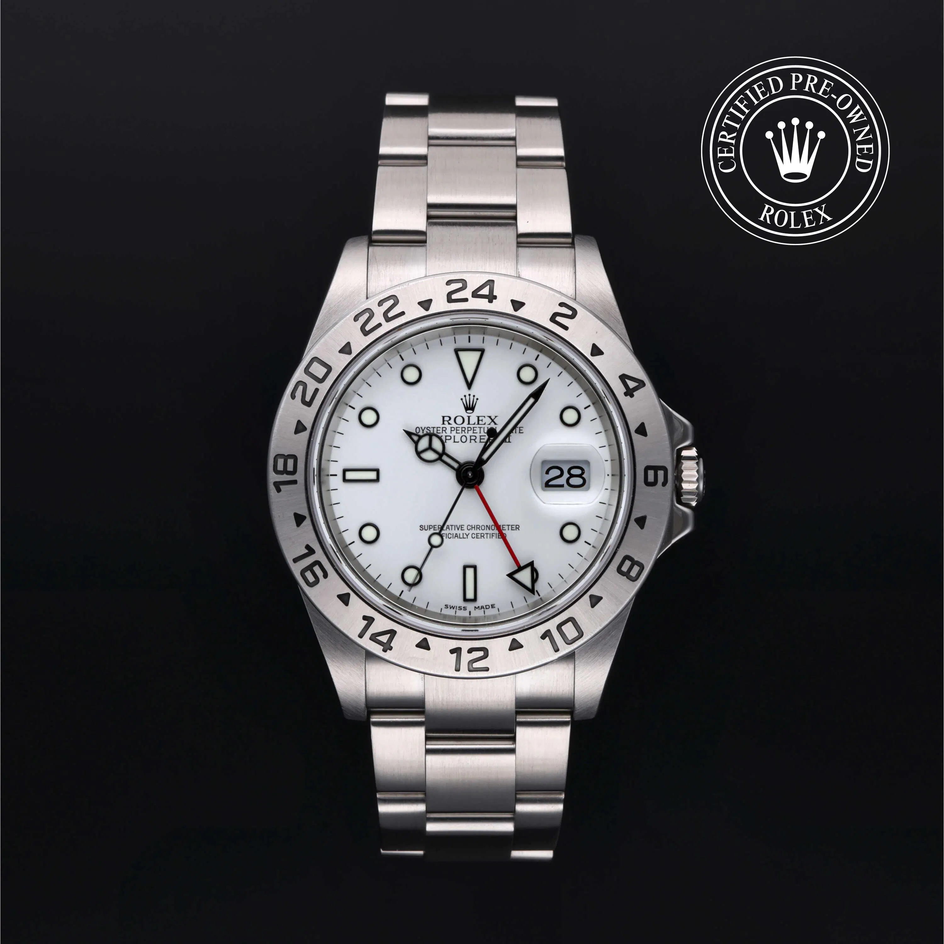 Rolex Certified Pre-Owned Explorer II (16570) self - winding automatic watch, features a 40mm stainless steel case and fixed bezel surrounding a white dial on a stainless steel oyster bracelet. Functions include hours, minutes, seconds, date and gmt/world time. This watch has received Rolex-authorized service and certification. It does not come with the original box or papers, but includes a custom Rolex Certified Pre-Owned hang tag, travel pouch and RCPO international warranty card.
