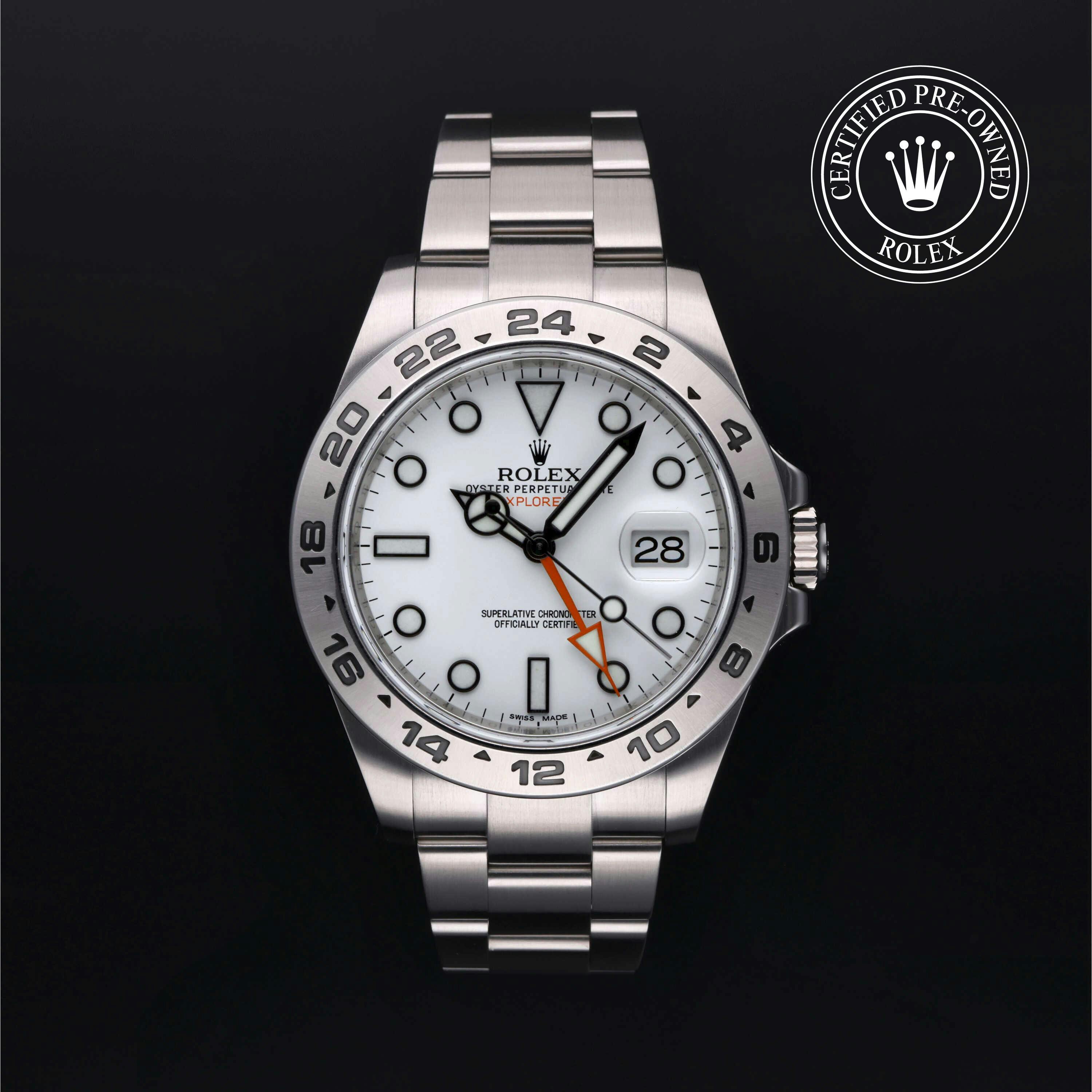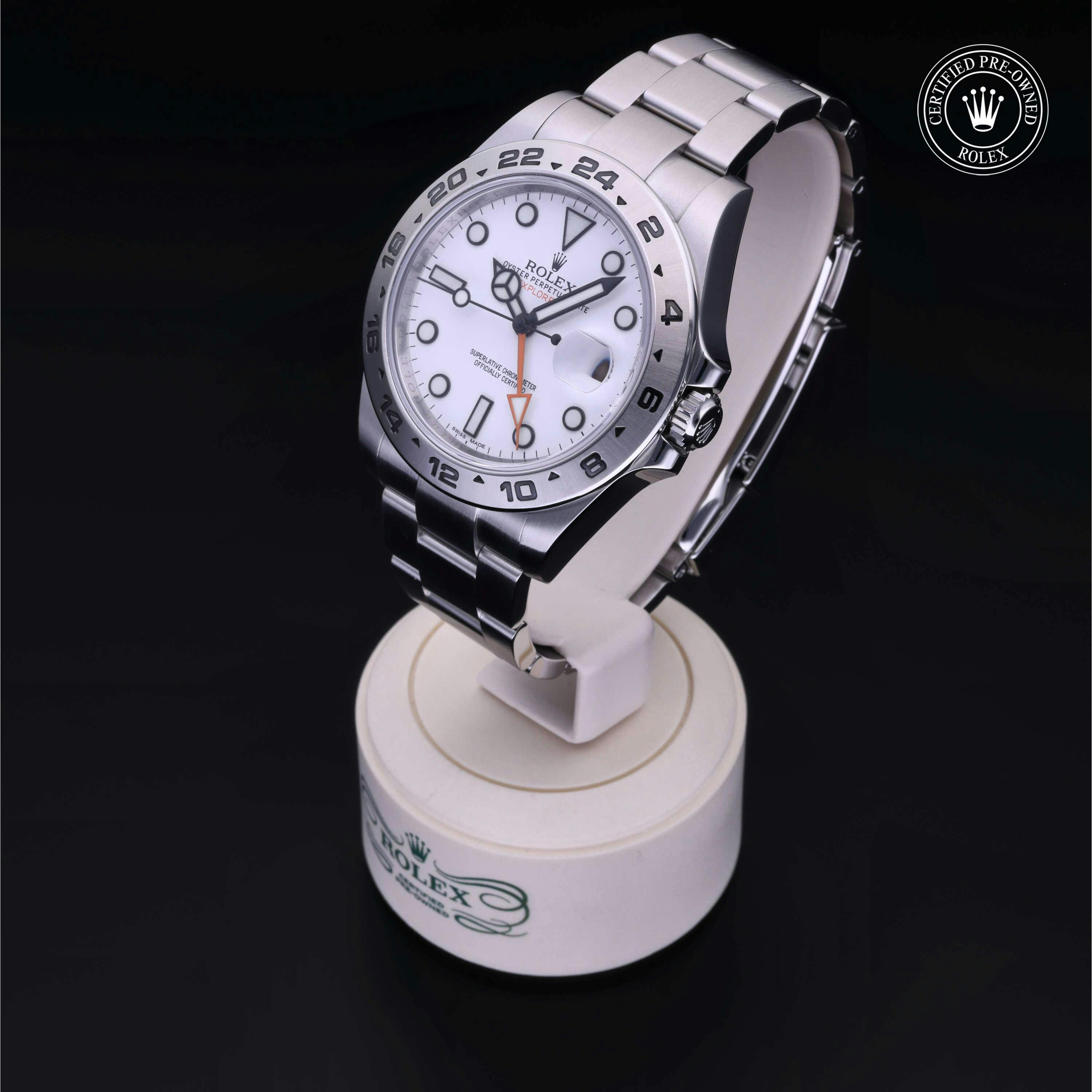 Rolex Certified Pre-Owned Explorer II (216570) self - winding automatic watch, features a 42mm stainless steel case and fixed bezel surrounding a white dial on a stainless steel oyster bracelet. Functions include hours, minutes, seconds, date and gmt/world time. This watch has received Rolex-authorized service and certification. It comes with the original papers, and includes a custom Rolex Certified Pre-Owned hang tag, travel pouch and RCPO international warranty card.