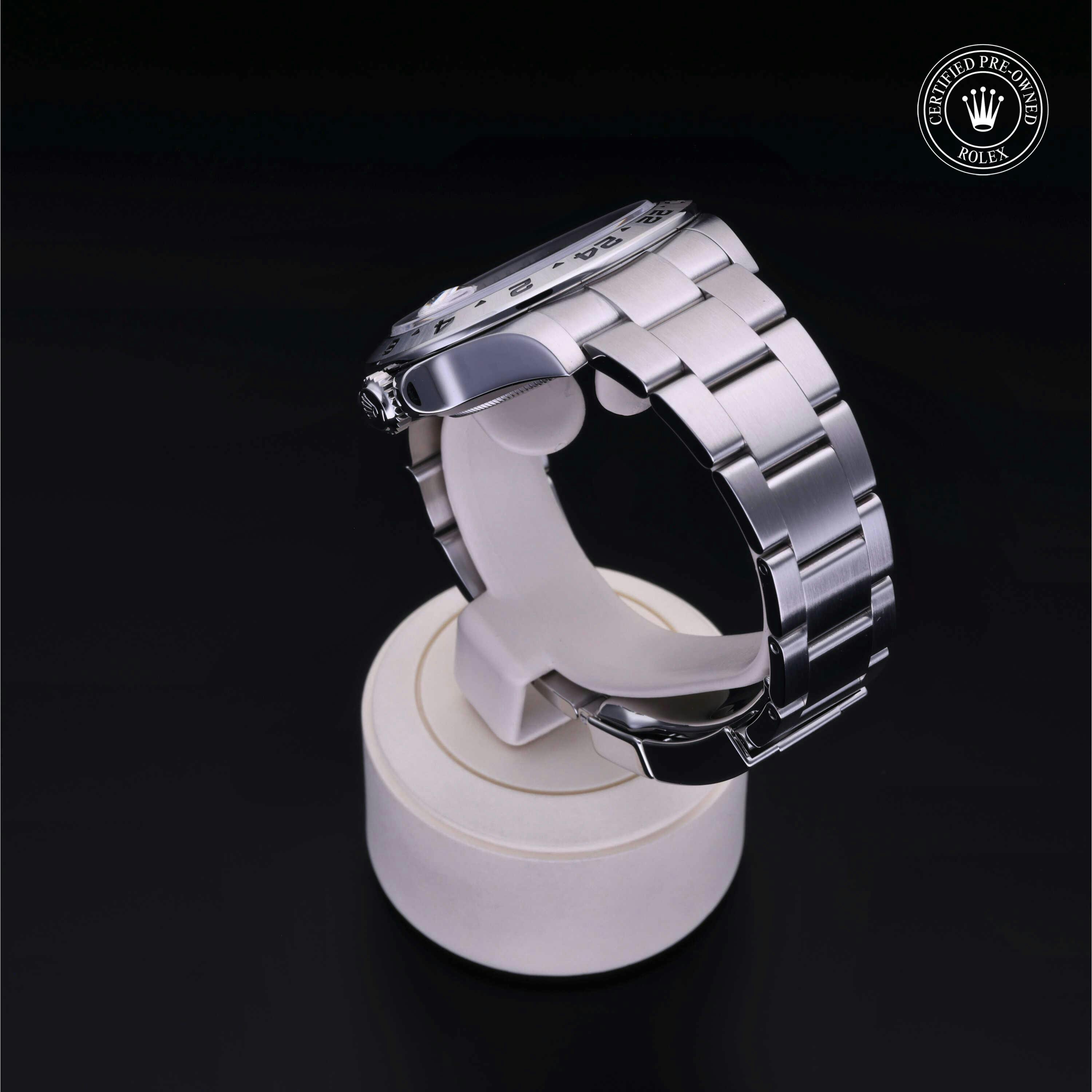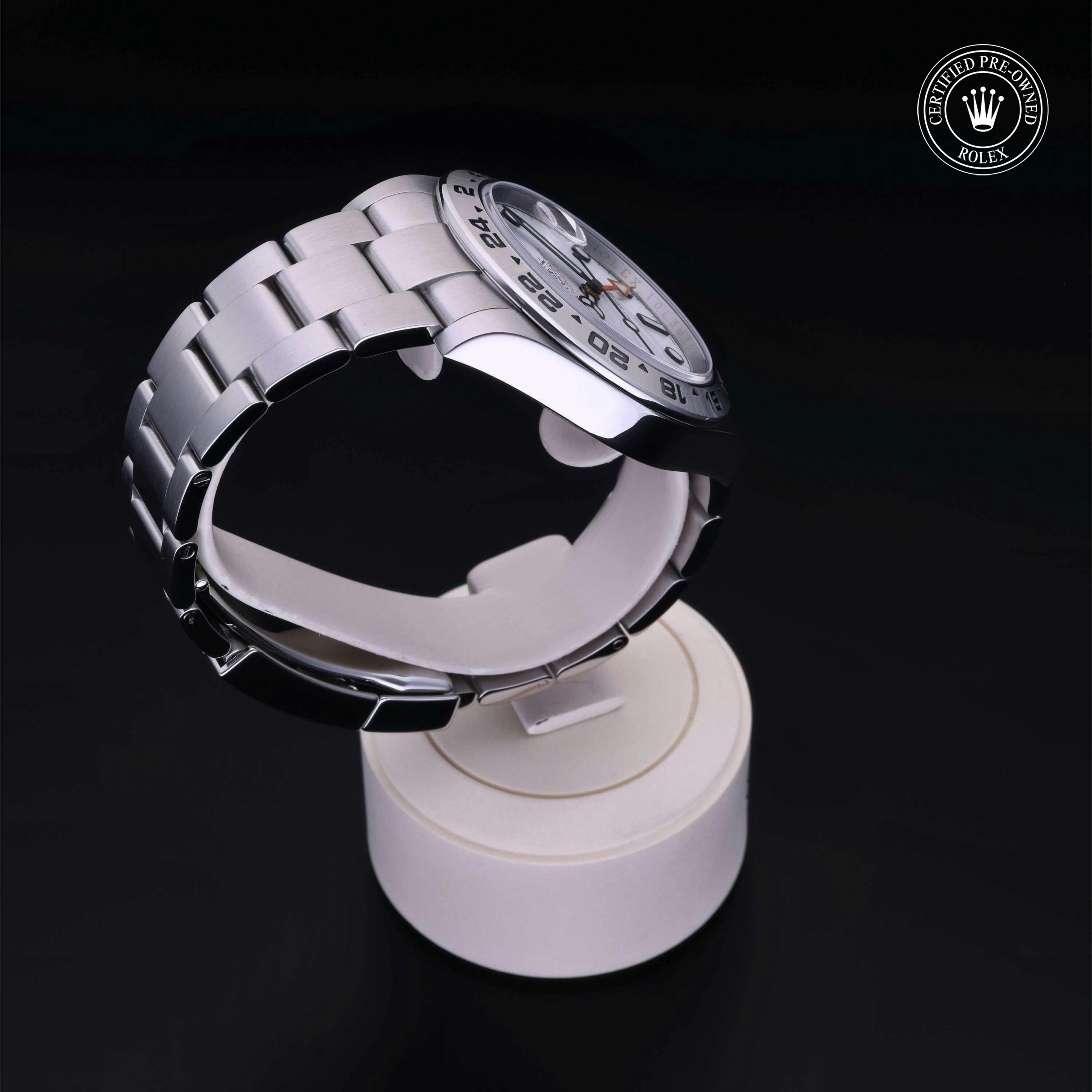 Rolex Certified Pre-Owned Explorer II (216570) self - winding automatic watch, features a 42mm stainless steel case and fixed bezel surrounding a white dial on a stainless steel oyster bracelet. Functions include hours, minutes, seconds, date and gmt/world time. This watch has received Rolex-authorized service and certification. It comes with the original papers, and includes a custom Rolex Certified Pre-Owned hang tag, travel pouch and RCPO international warranty card.