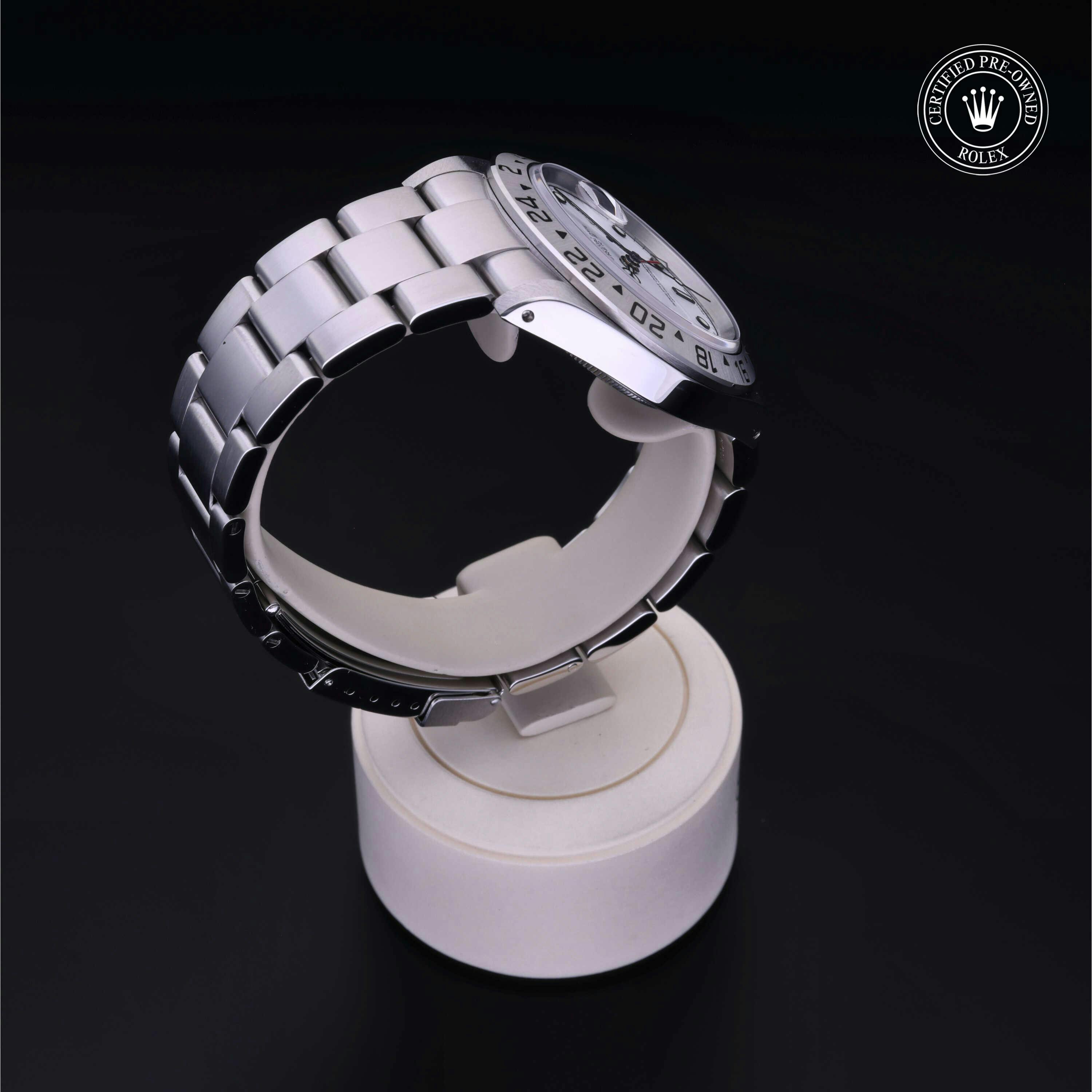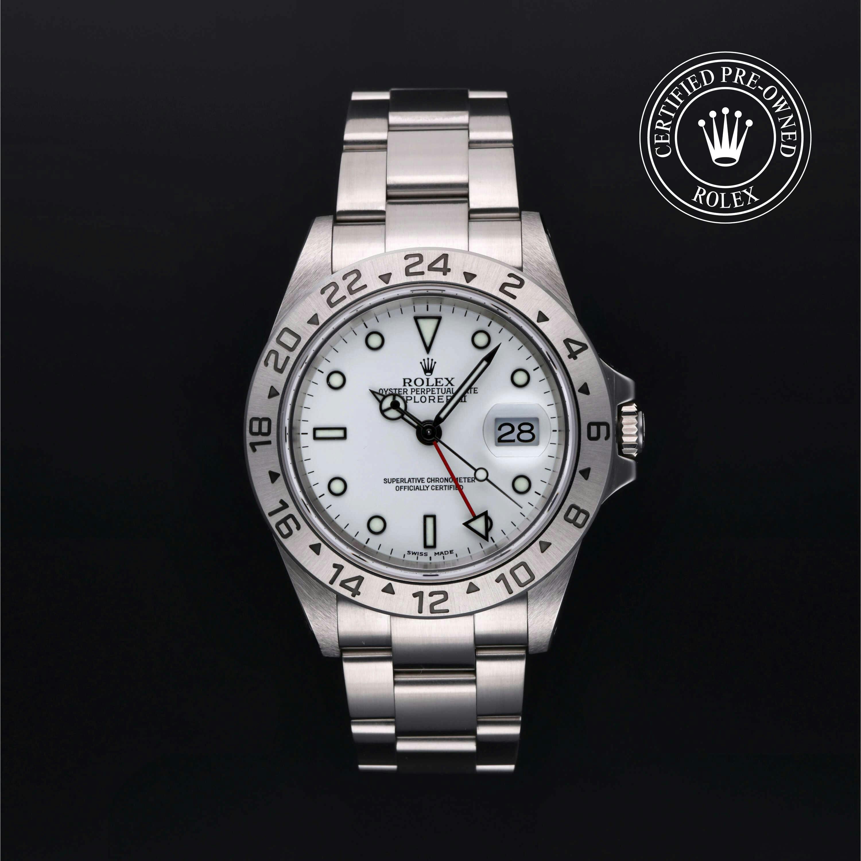 Rolex Certified Pre-Owned Explorer II (16570) self - winding automatic watch, features a 40mm stainless steel case with a fixed 24-hour bezel surrounding a white dial. The watch is secured on a stainless steel Oyster bracelet complete with a folding buckle. Functions include hours, minutes, seconds, date and gmt/world time. This watch has been serviced by an authorized service center and certified by Rolex. It does not come with the original box or papers, but includes a custom Rolex Certified Pre-Owned hang tag, travel pouch and international warranty card.
