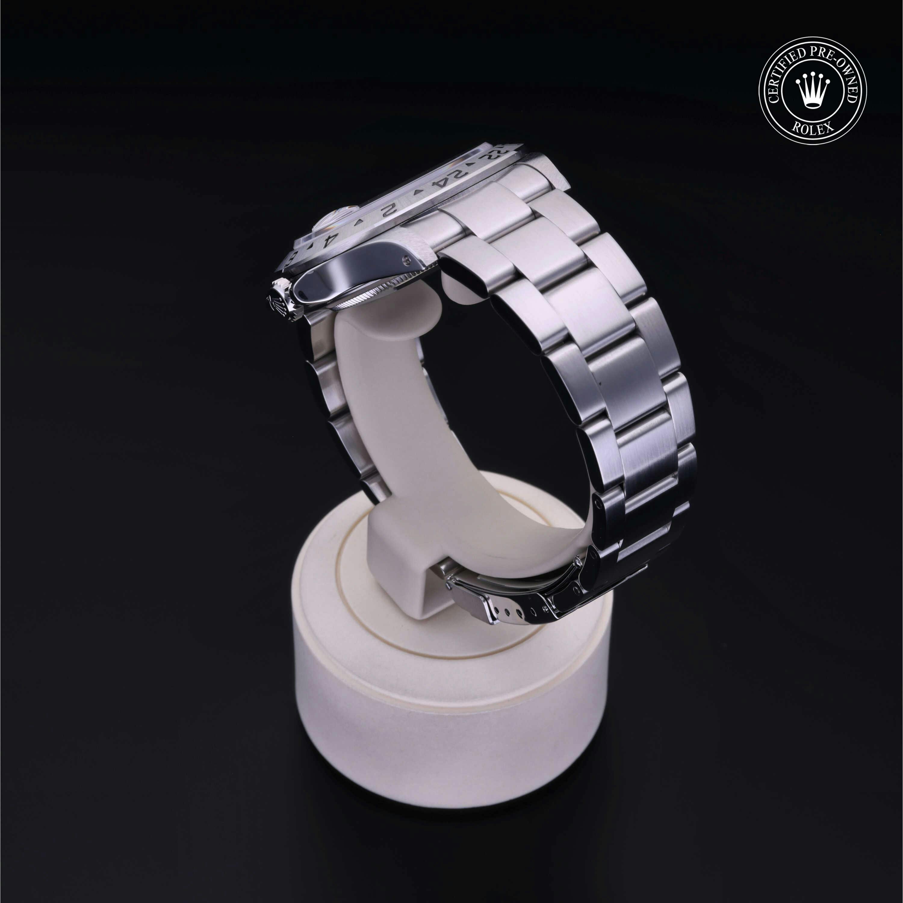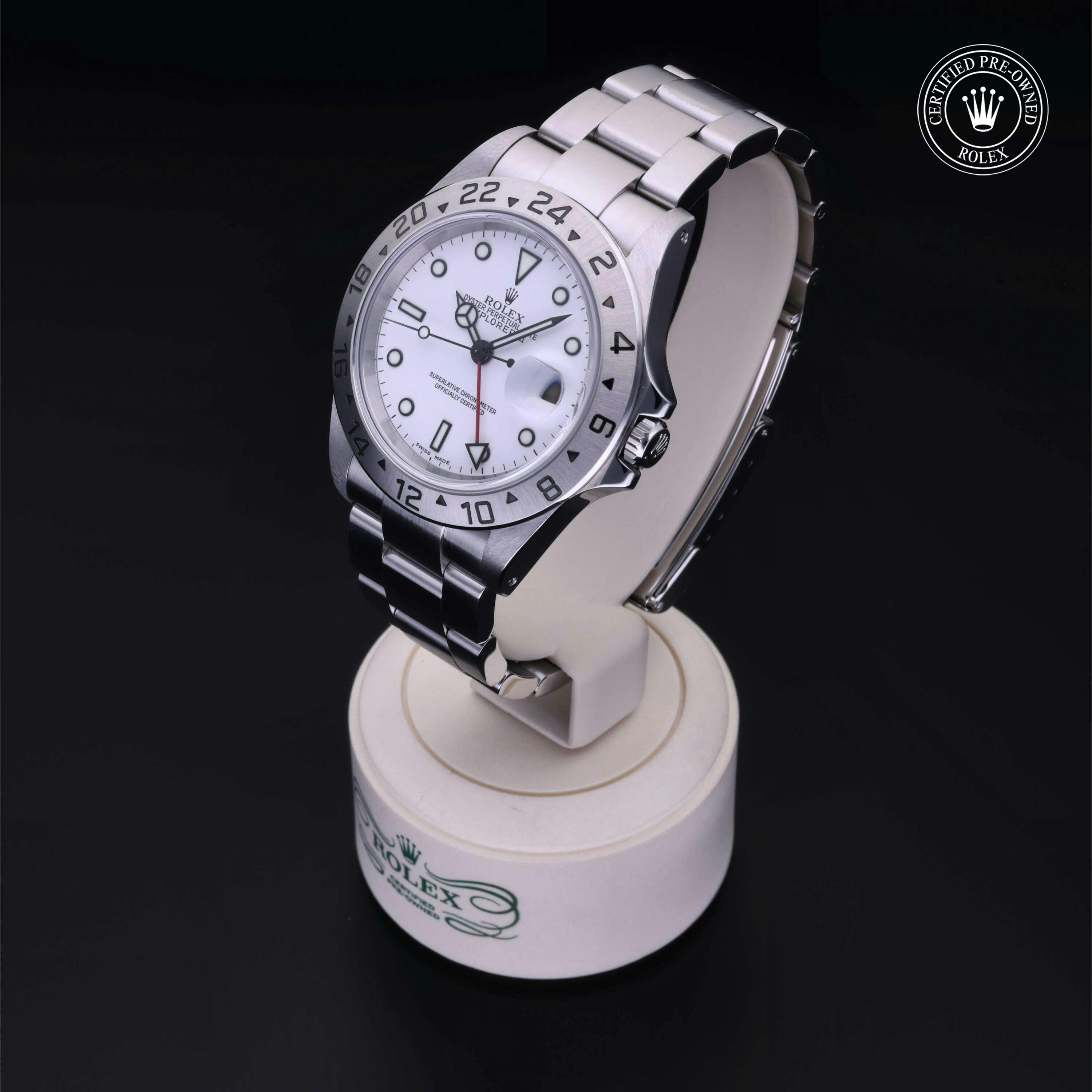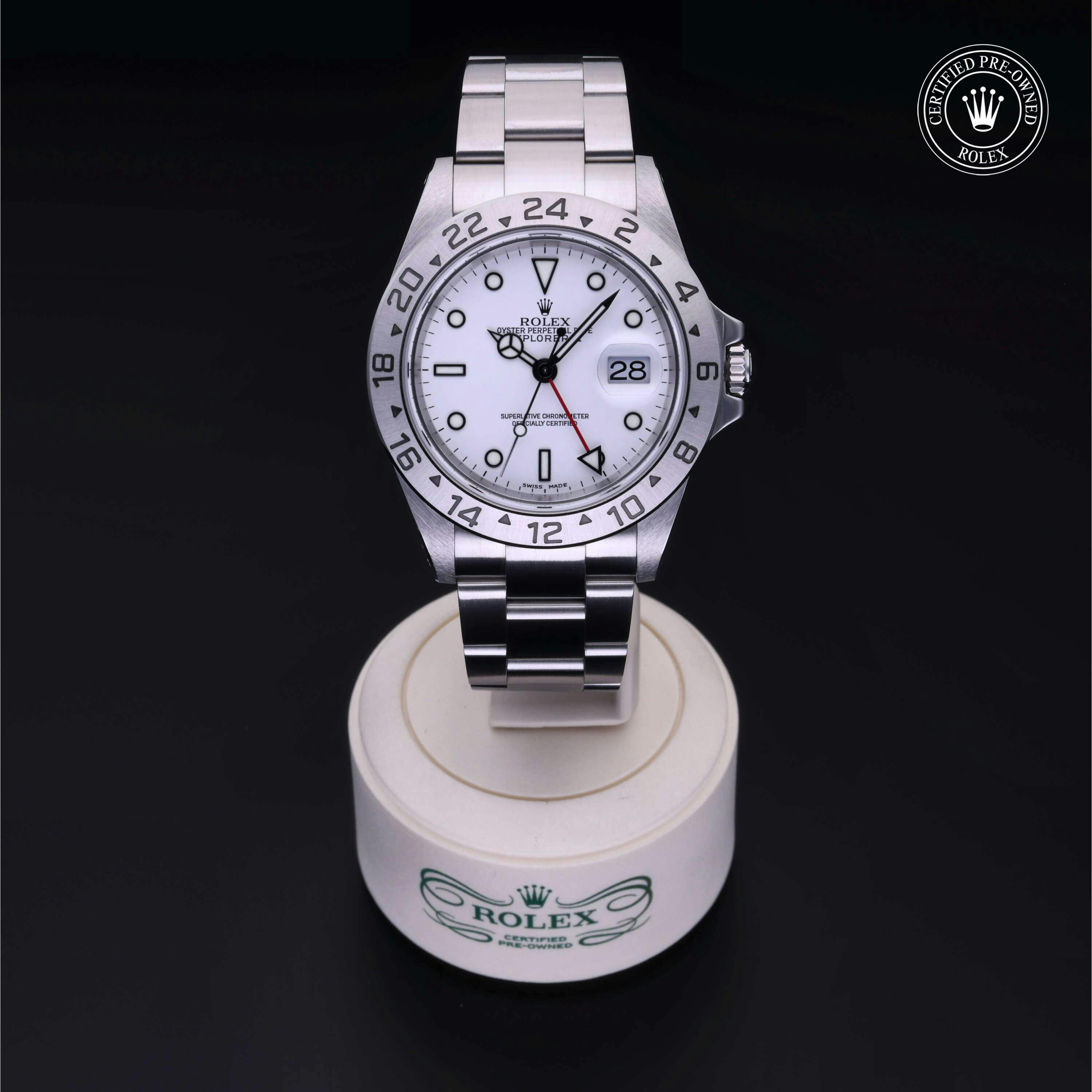 Rolex Certified Pre-Owned Explorer II (16570) self - winding automatic watch, features a 40mm stainless steel case with a fixed 24-hour bezel surrounding a white dial. The watch is secured on a stainless steel Oyster bracelet complete with a folding buckle. Functions include hours, minutes, seconds, date and gmt/world time. This watch has been serviced by an authorized service center and certified by Rolex. It does not come with the original box or papers, but includes a custom Rolex Certified Pre-Owned hang tag, travel pouch and international warranty card.