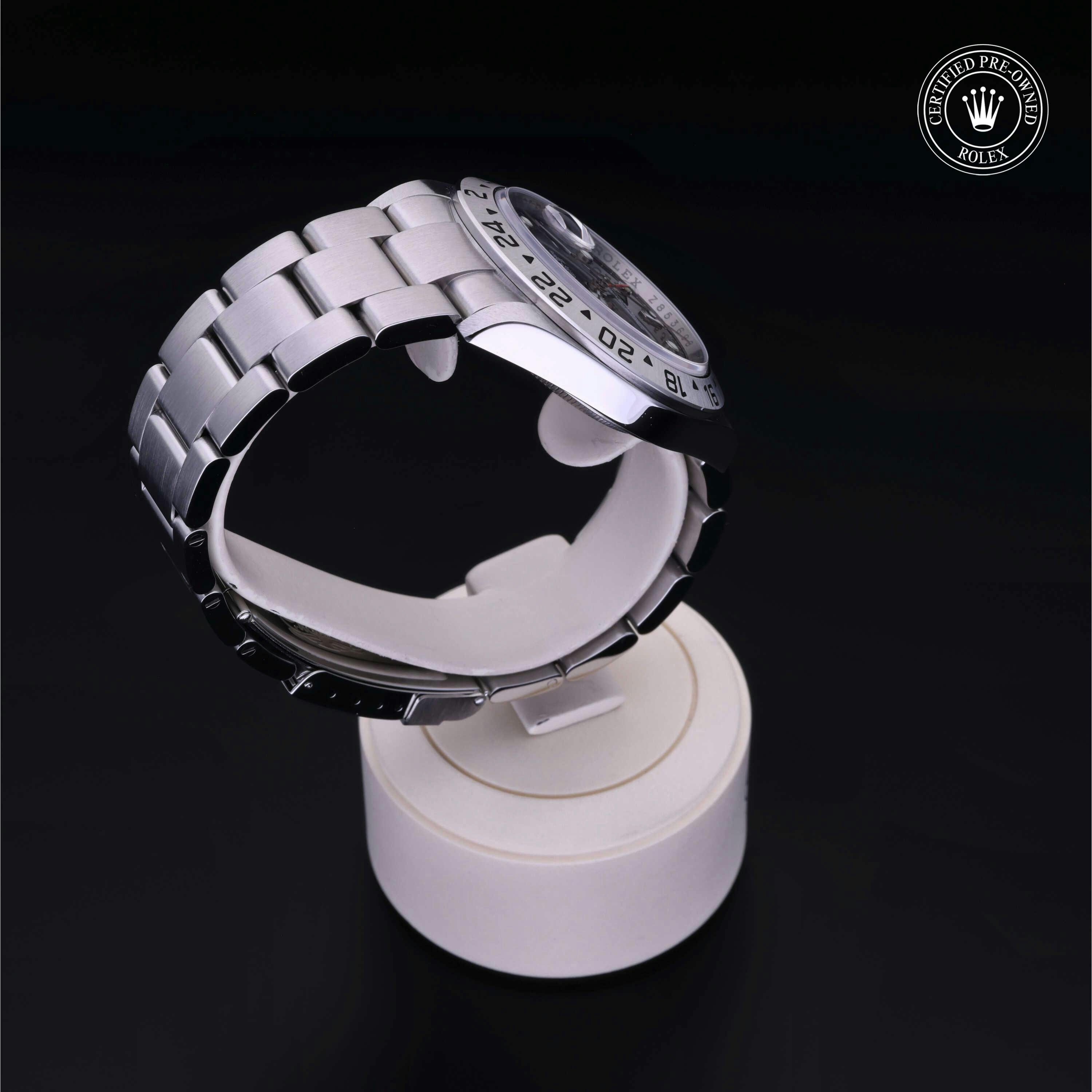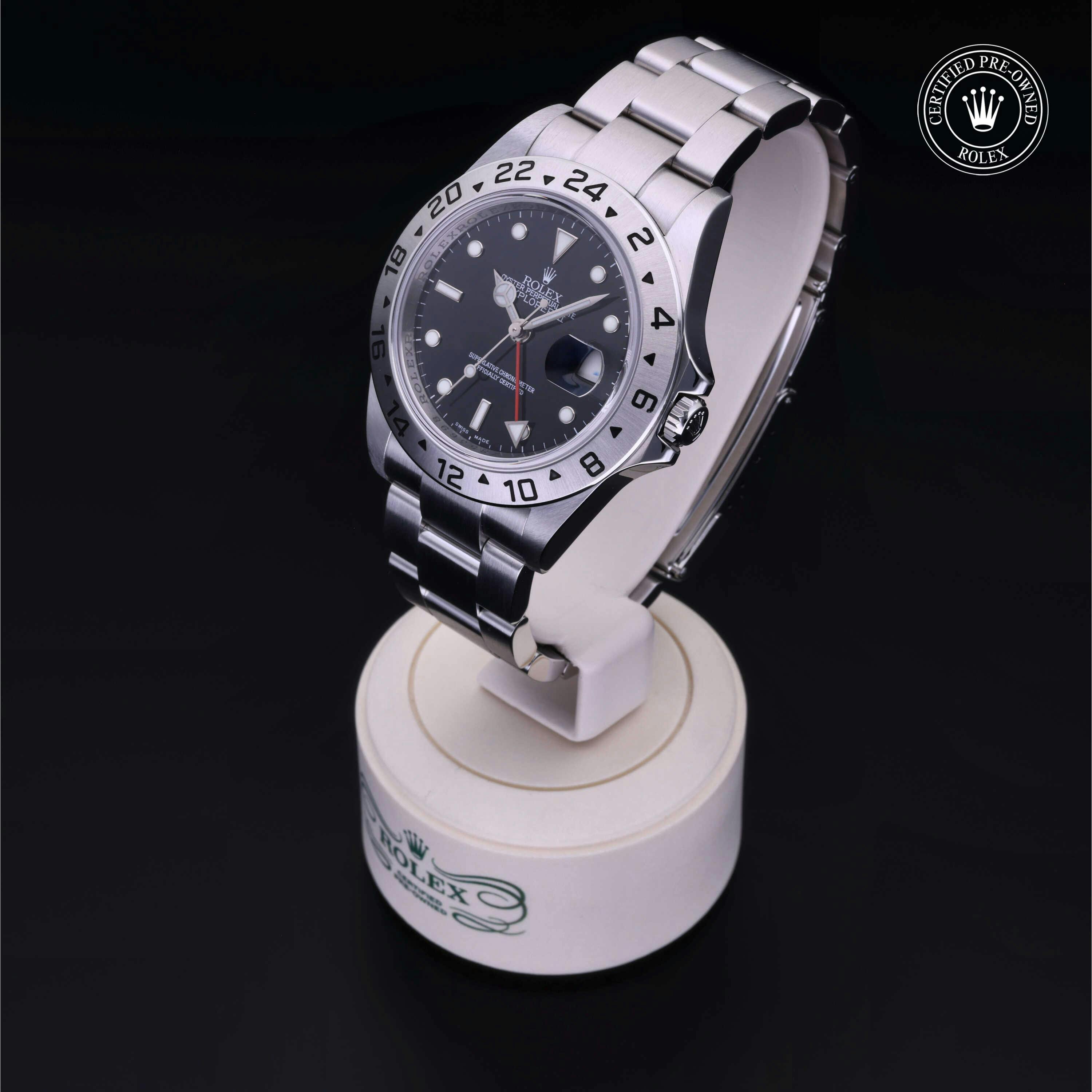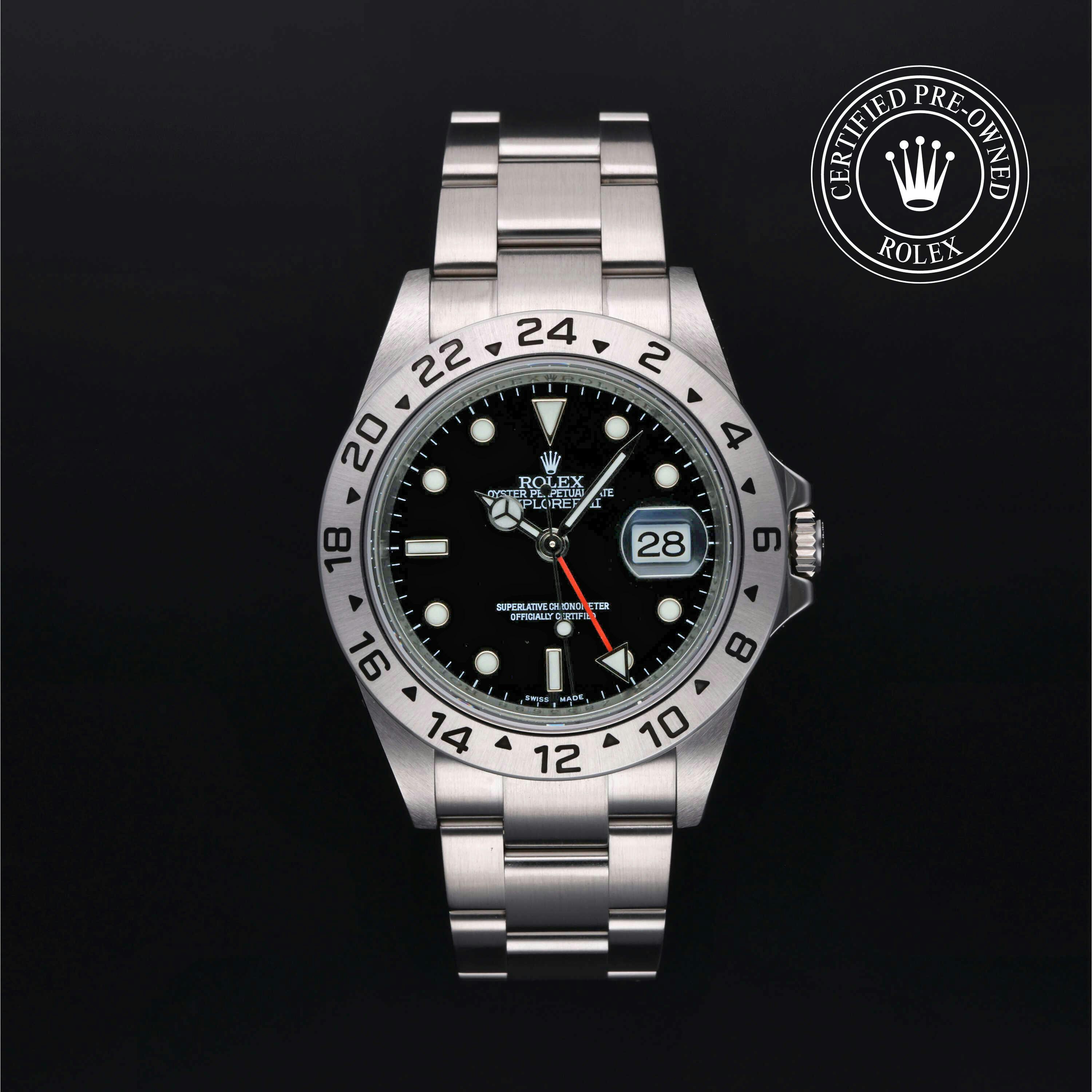 Rolex Certified Pre-Owned Explorer II (16570) self - winding automatic watch, features a 40mm stainless steel case and fixed bezel surrounding a black dial on a stainless steel oyster bracelet. Functions include hours, minutes, seconds, date and gmt/world time. This watch has received Rolex-authorized service and certification. It does not come with the original box or papers, but includes a custom Rolex Certified Pre-Owned hang tag, travel pouch and RCPO international warranty card.