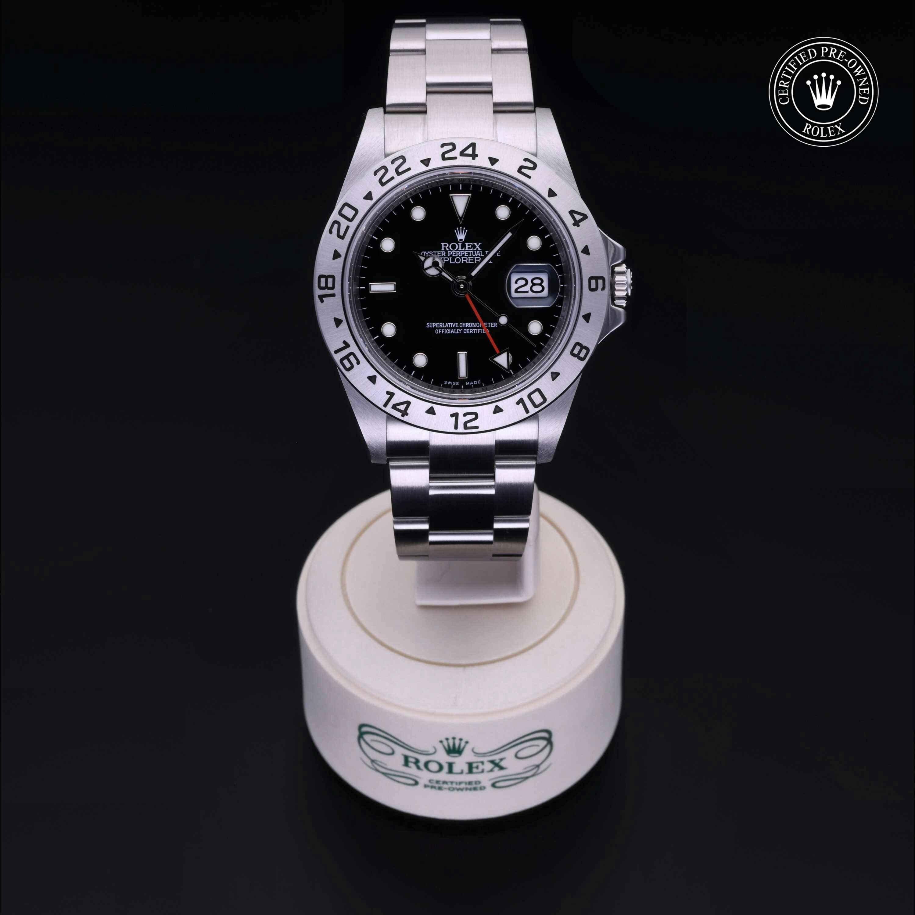 Rolex Certified Pre-Owned Explorer II (16570) self - winding automatic watch, features a 40mm stainless steel case and fixed bezel surrounding a black dial on a stainless steel oyster bracelet. Functions include hours, minutes, seconds, date and gmt/world time. This watch has received Rolex-authorized service and certification. It does not come with the original box or papers, but includes a custom Rolex Certified Pre-Owned hang tag, travel pouch and RCPO international warranty card.