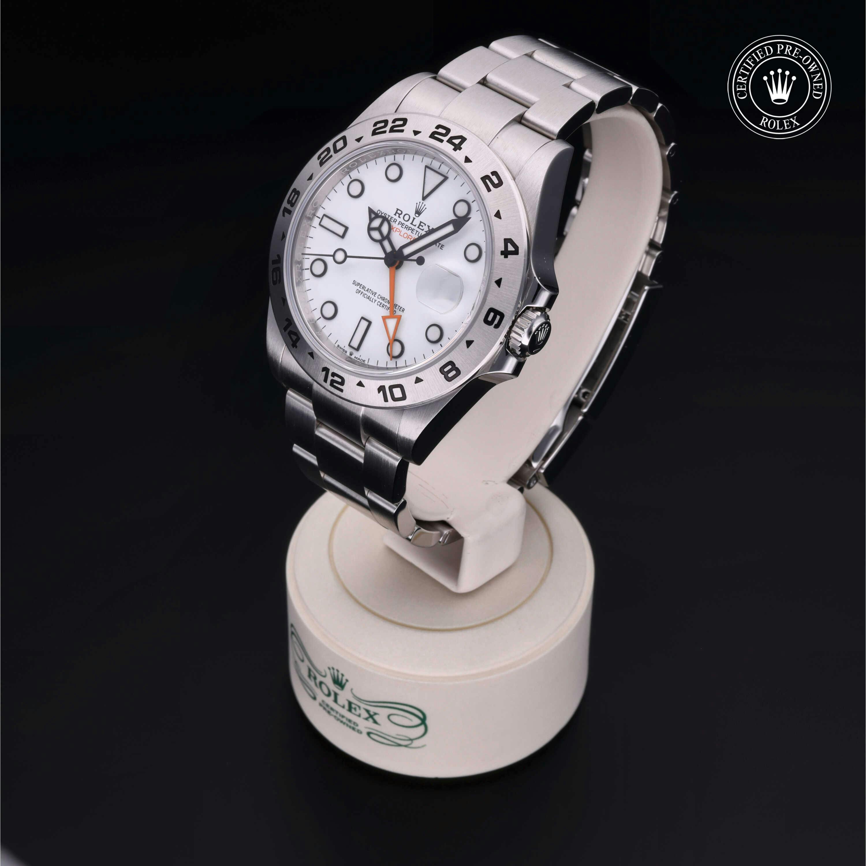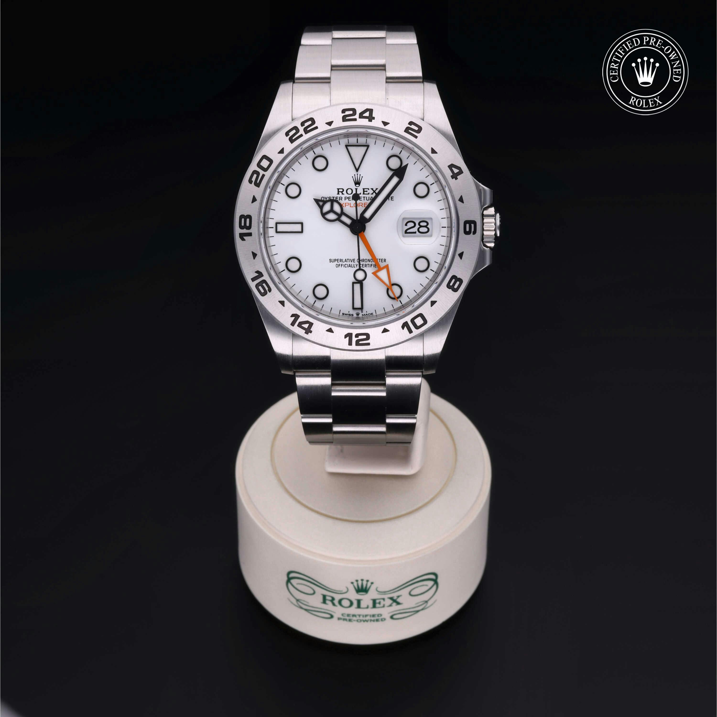 Rolex Certified Pre-Owned Explorer II (226570) self - winding automatic watch, features a 42mm stainless steel case and fixed bezel surrounding a white dial on a stainless steel oyster bracelet. Functions include hours, minutes, seconds, date and gmt/world time. This watch has received Rolex-authorized service and certification. It comes with the original box and papers, and includes a custom Rolex Certified Pre-Owned hang tag, travel pouch and RCPO international warranty card.