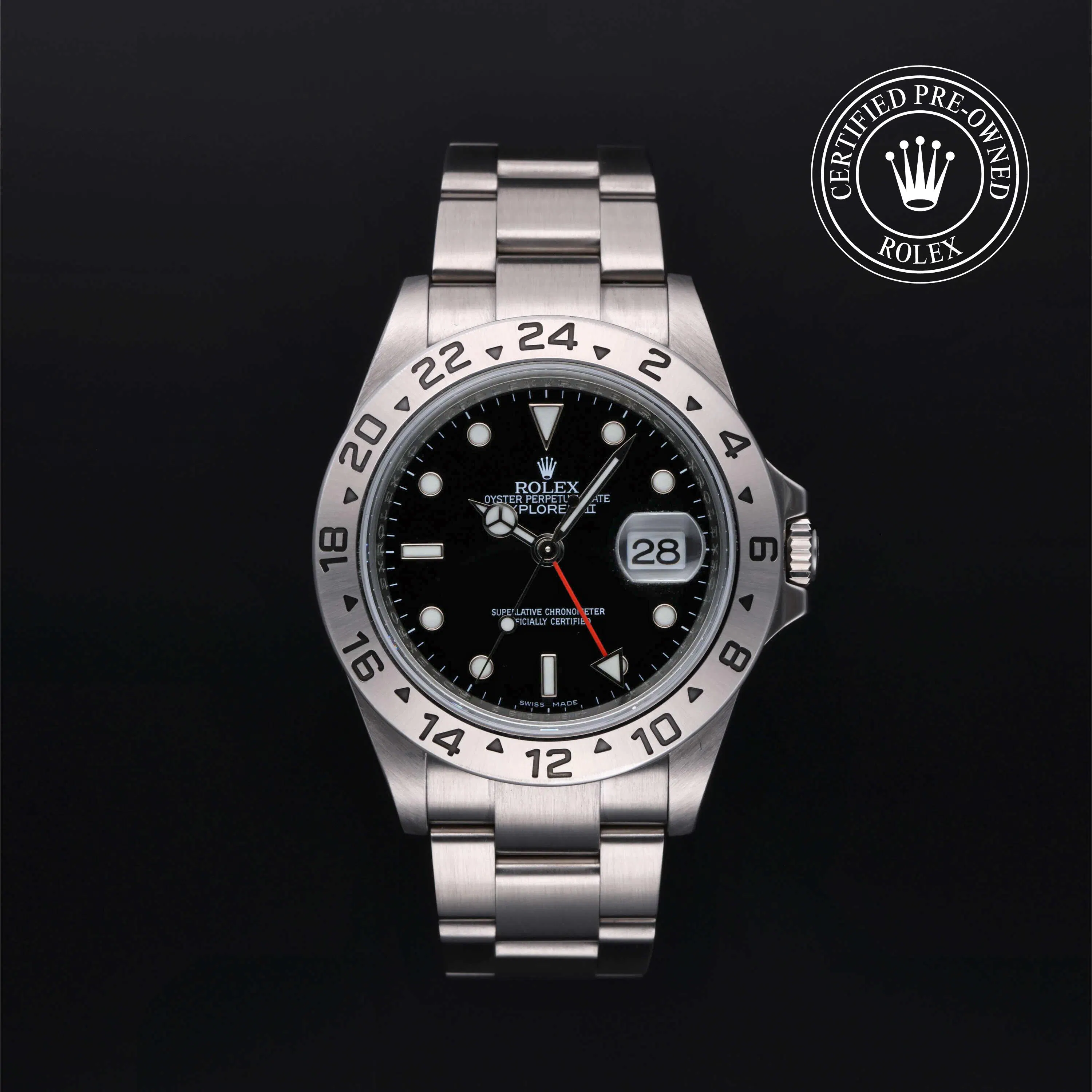 Rolex Certified Pre-Owned Explorer II (16570) self - winding automatic watch, features a 40mm stainless steel case with a fixed 24-hour graduated bezel surrounding a black dial on a stainless steel Oyster bracelet. Functions include hours, minutes, seconds, date and gmt/world time. This watch has received Rolex-authorized service and certification. It comes with the original box and papers, and includes a custom Rolex Certified Pre-Owned hang tag, travel pouch and RCPO international warranty card.
