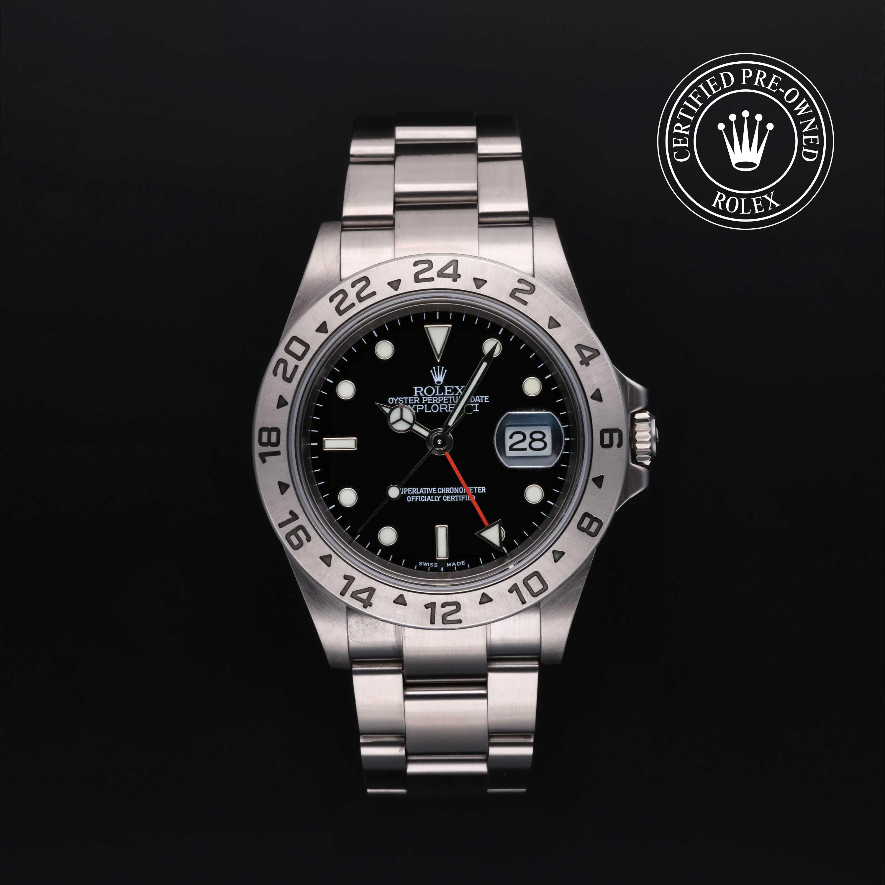 Rolex Certified Pre-Owned Explorer II (16570) self - winding automatic watch, features a 40mm stainless steel case with a fixed 24-hour bezel surrounding a black dial. The watch is secured on a stainless steel Oyster bracelet complete with a folding buckle. Functions include hours, minutes, seconds, date and gmt/world time. This watch has been serviced by an authorized service center and certified by Rolex. It does not come with the original box or papers, but includes a custom Rolex Certified Pre-Owned hang tag, travel pouch and international warranty card.