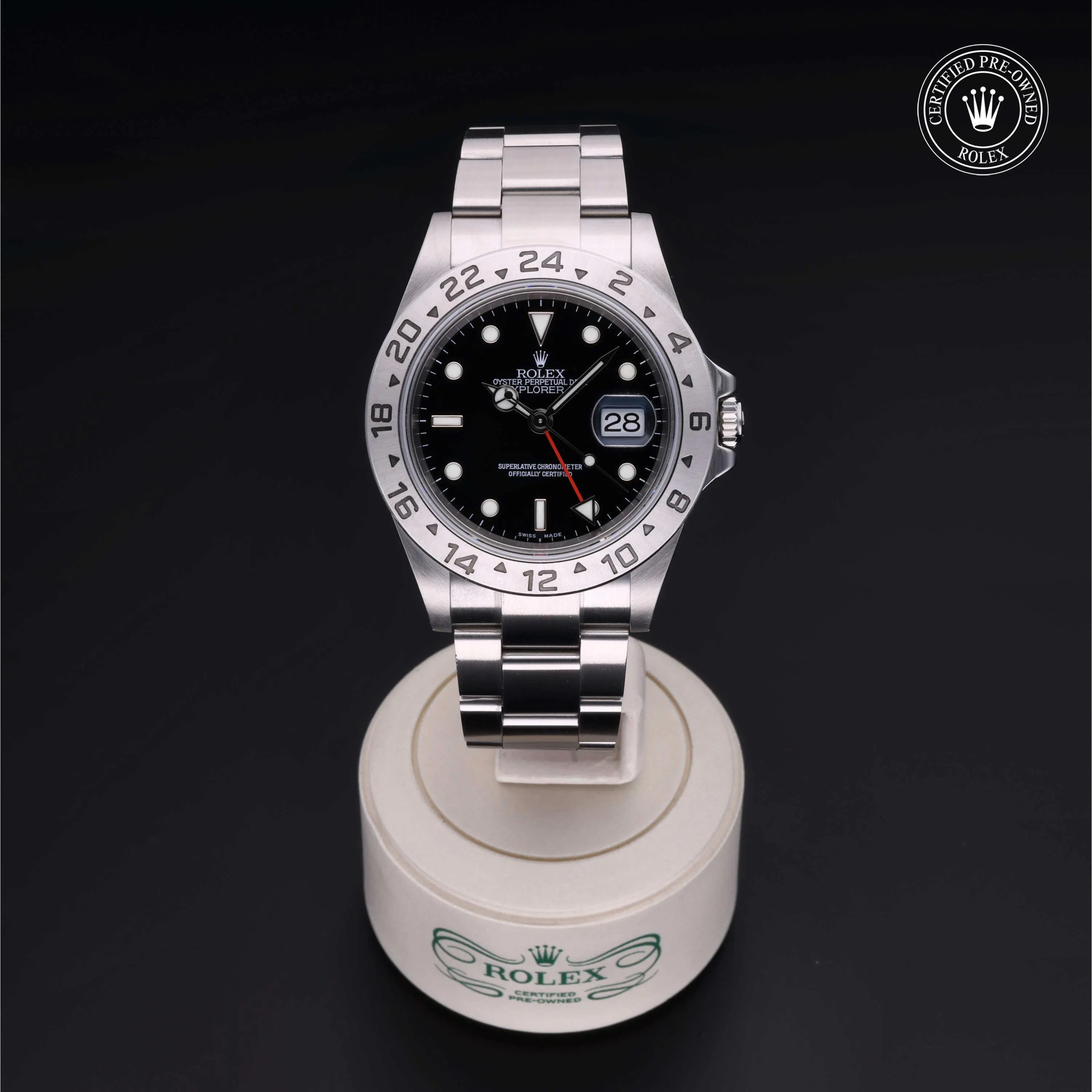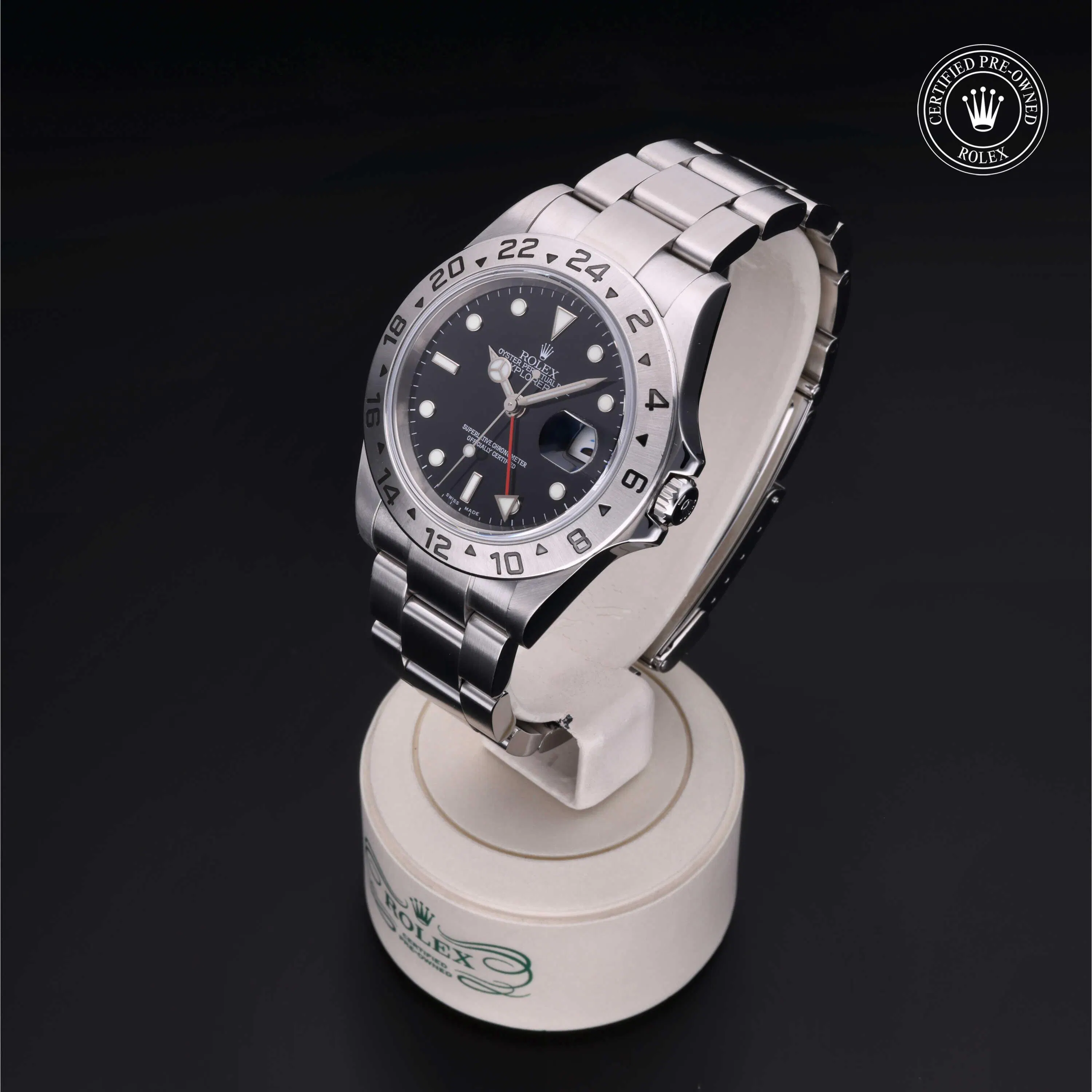 Rolex Certified Pre-Owned Explorer II (16570) self - winding automatic watch, features a 40mm stainless steel case with a fixed 24-hour bezel surrounding a black dial. The watch is secured on a stainless steel Oyster bracelet complete with a folding buckle. Functions include hours, minutes, seconds, date and gmt/world time. This watch has been serviced by an authorized service center and certified by Rolex. It does not come with the original box or papers, but includes a custom Rolex Certified Pre-Owned hang tag, travel pouch and international warranty card.