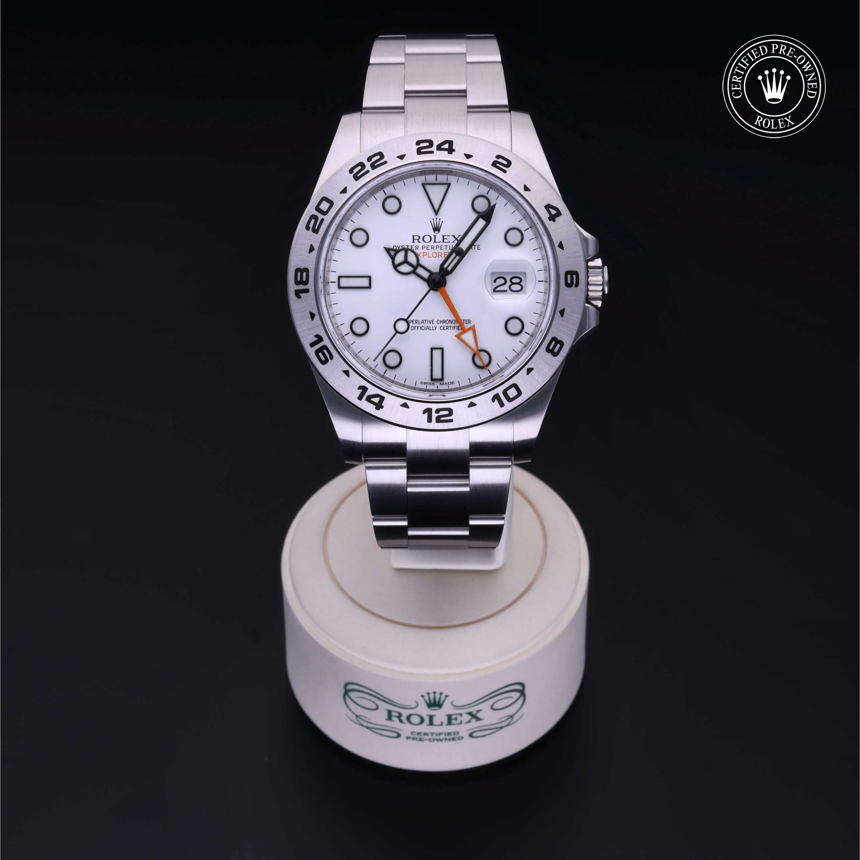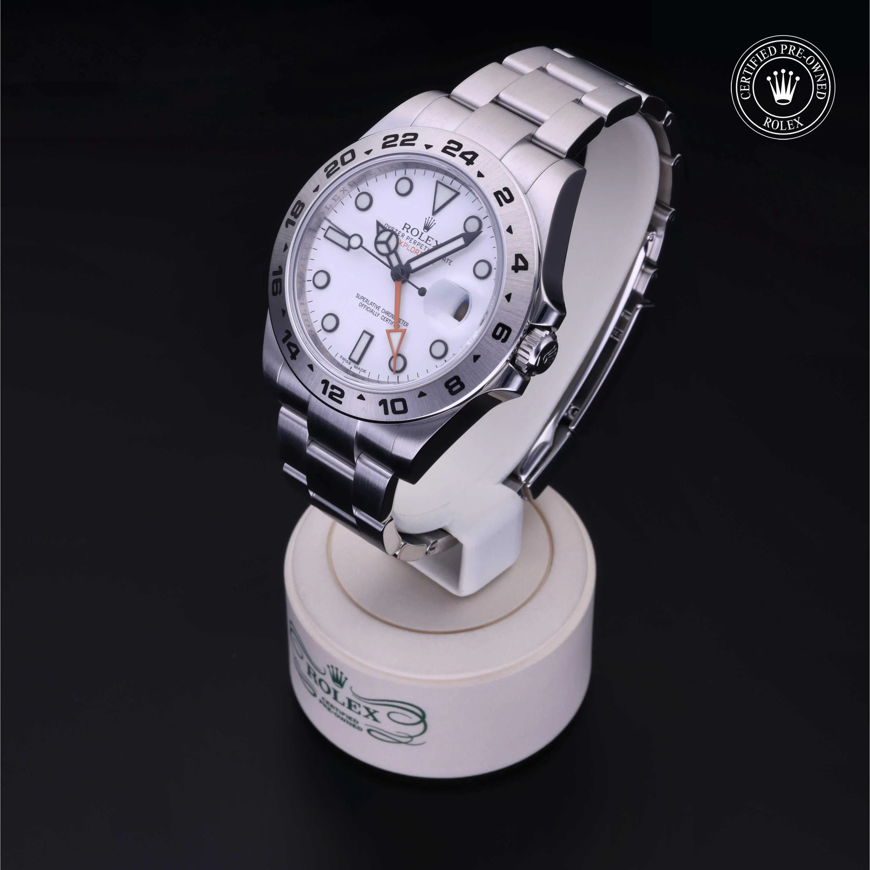 Rolex Certified Pre-Owned Explorer II (216570) self - winding automatic watch, features a 42mm stainless steel case with a fixed 24-hour bezel surrounding a white dial. The watch is secured on a stainless steel Oyster bracelet complete with a folding buckle. Functions include hours, minutes, seconds, date and gmt/world time. This watch has been serviced by an authorized service center and certified by Rolex. It does not come with the original box or papers, but includes a custom Rolex Certified Pre-Owned hang tag, travel pouch and international warranty card.