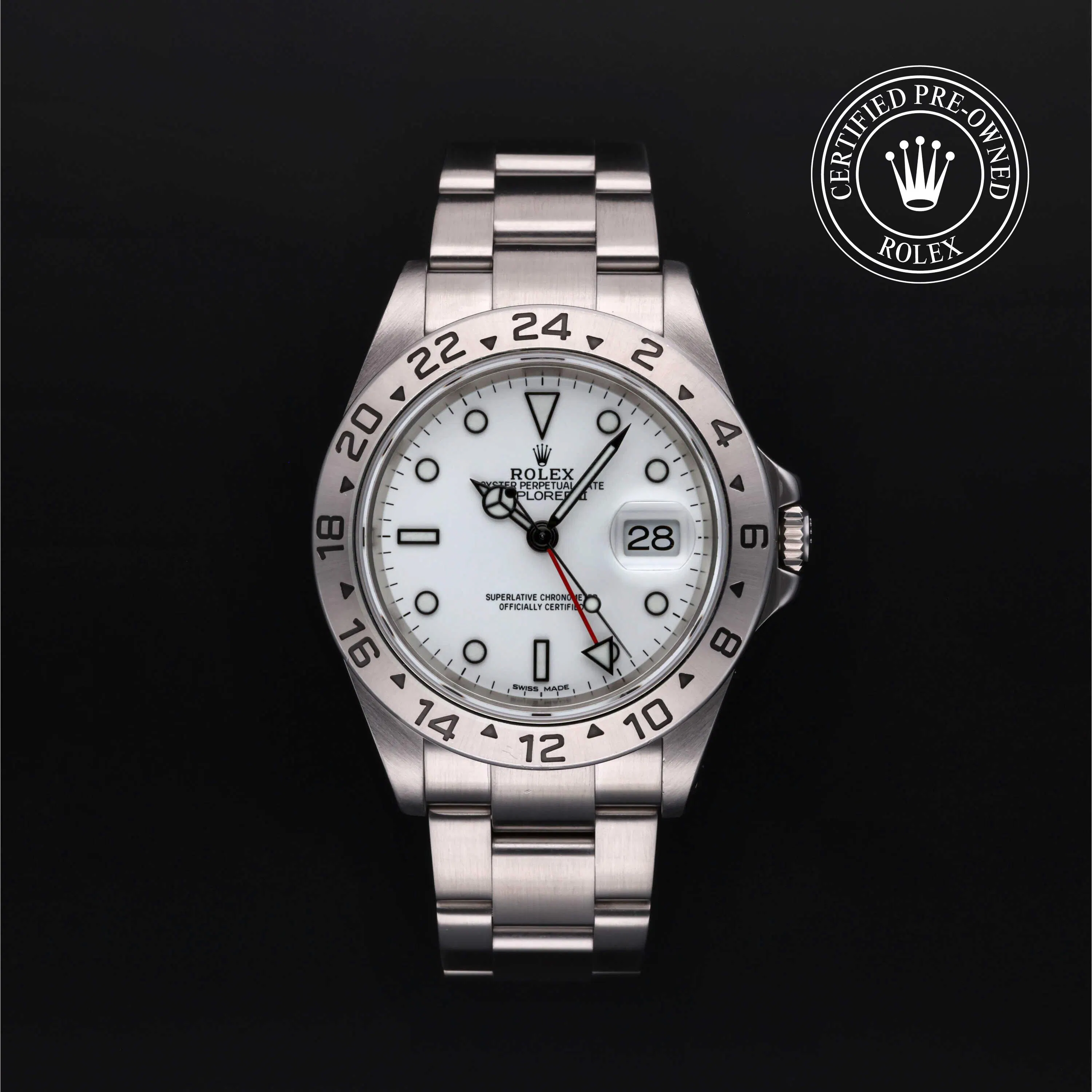 Rolex Certified Pre-Owned Explorer II (16570) self - winding automatic watch, features a 40mm stainless steel case with a fixed 24-hour graduated bezel surrounding a white dial. The watch is secured on a stainless steel Oyster bracelet complete with a folding buckle. Functions include hours, minutes, seconds, date and gmt/world time. This watch has received Rolex-authorized service and certification. It does not come with the original box or papers, but includes a custom Rolex Certified Pre-Owned hang tag, travel pouch and RCPO international warranty card.