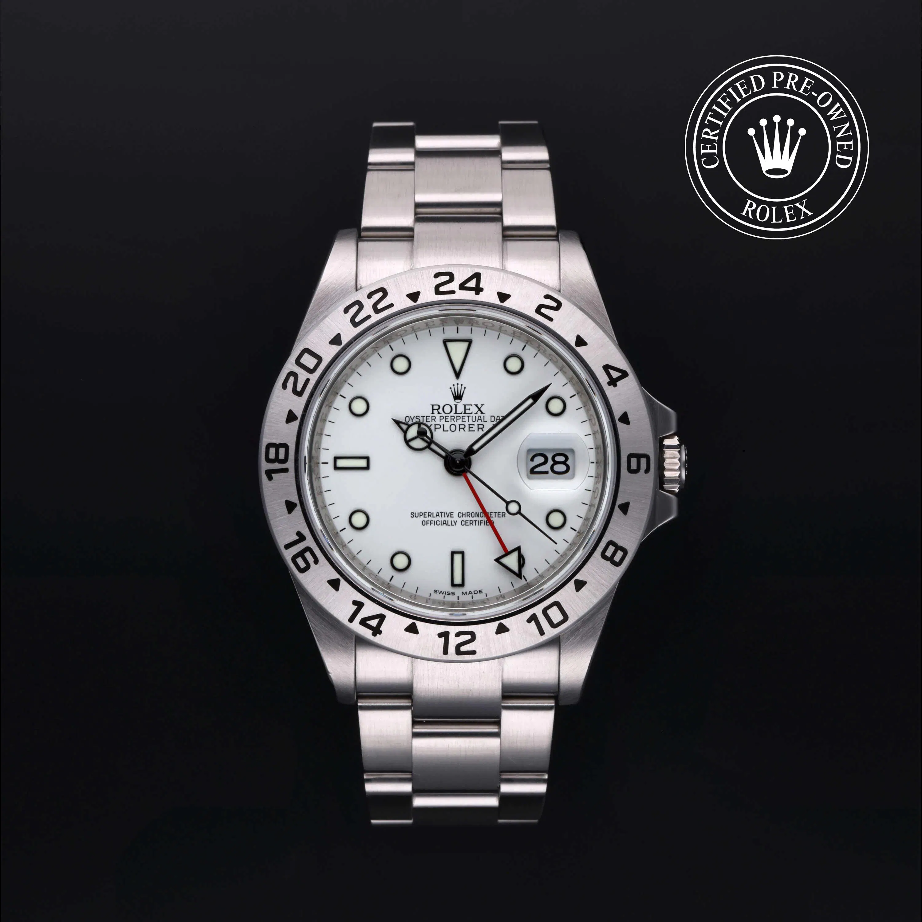 Rolex Certified Pre-Owned Explorer II (16570) self - winding automatic watch, features a 40mm stainless steel case with a fixed 24 hour graduated bezel surrounding a white dial on a stainless steel Oyster bracelet. Functions include hours, minutes, seconds, date and gmt/world time. This watch has received Rolex-authorized service and certification. It does not come with the original box or papers, but includes a custom Rolex Certified Pre-Owned hang tag, travel pouch and RCPO international warranty card.