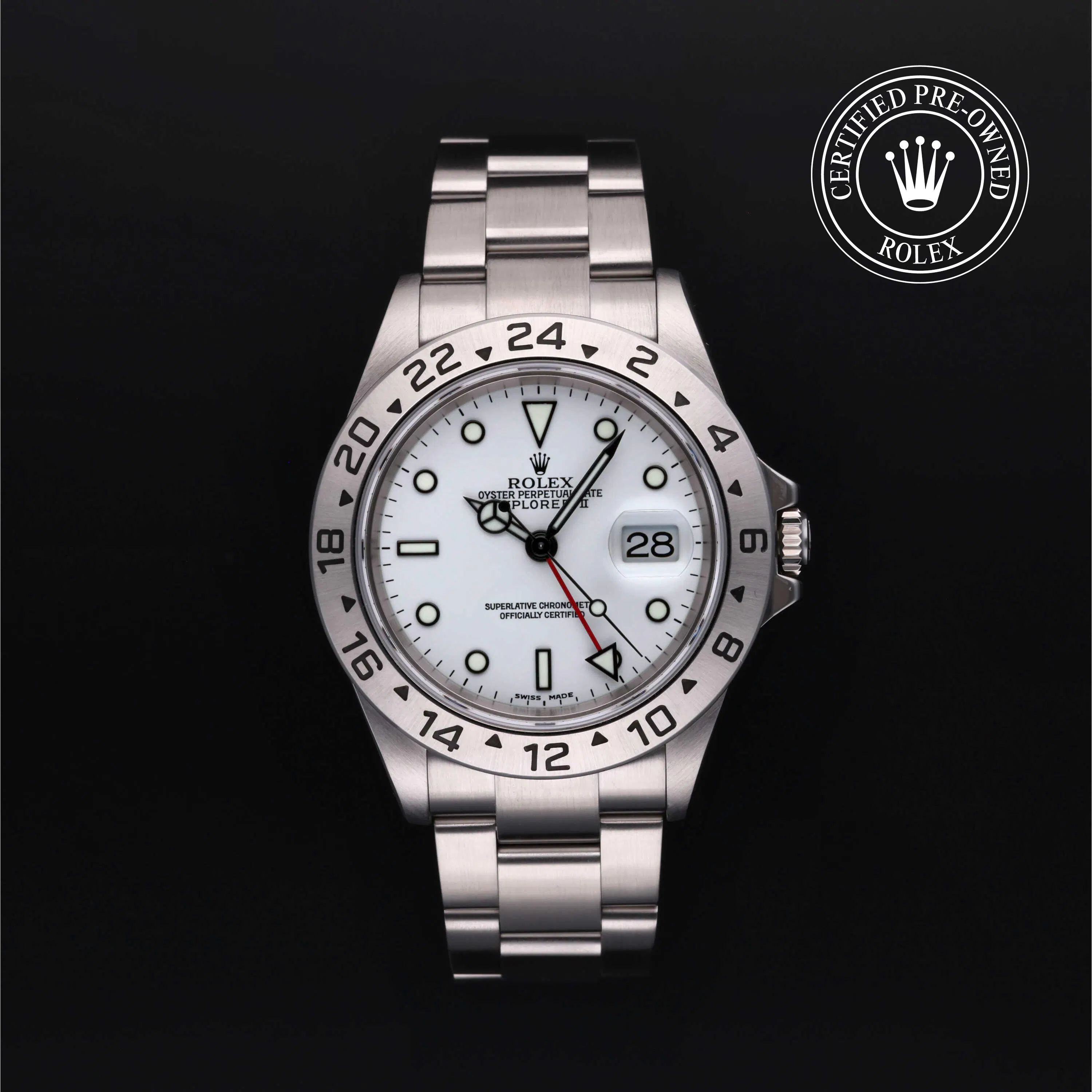 Rolex Certified Pre-Owned Explorer II (16570) self - winding automatic watch, features a 40mm stainless steel case with a fixed 24 hour graduated bezel surrounding a white dial on a stainless steel Oyster bracelet. Functions include hours, minutes, seconds, date and gmt/world time. This watch has received Rolex-authorized service and certification. It comes with the original papers, and includes a custom Rolex Certified Pre-Owned hang tag, travel pouch and RCPO international warranty card.