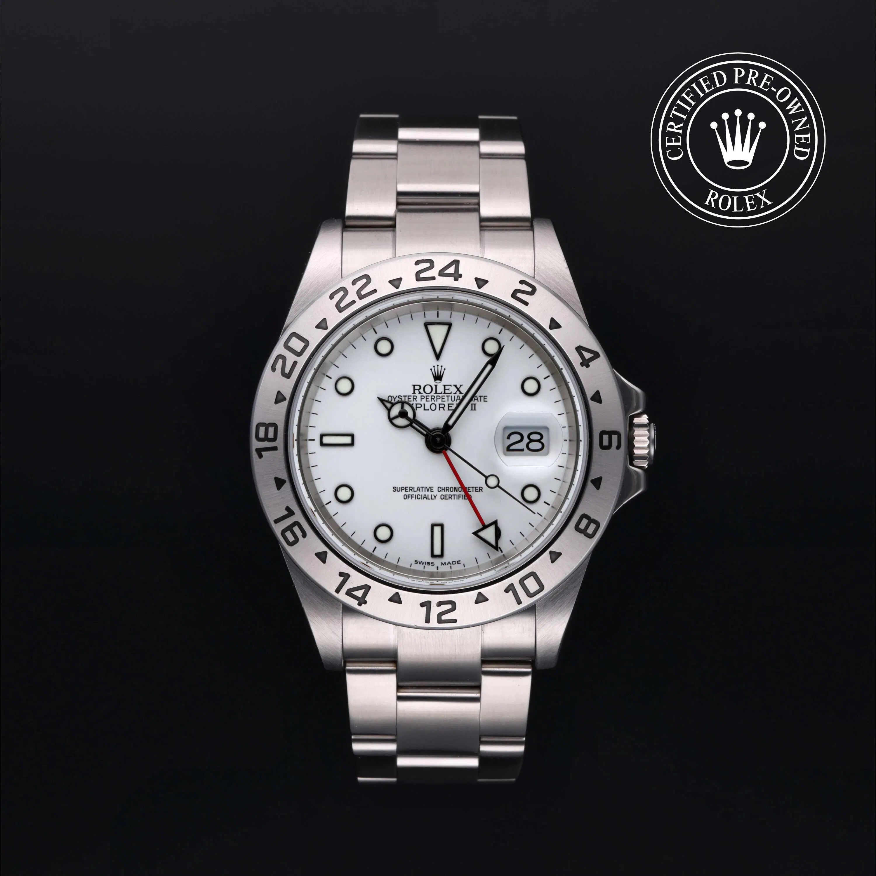 Rolex Certified Pre-Owned Explorer II (16570) self - winding automatic watch, features a 40mm stainless steel case with a fixed 24 hour graduated bezel surrounding a white dial on a stainless steel Oyster bracelet. Functions include hours, minutes, seconds, date and gmt/world time. This watch has received Rolex-authorized service and certification. It comes with the original papers, and includes a custom Rolex Certified Pre-Owned hang tag, travel pouch and RCPO international warranty card.