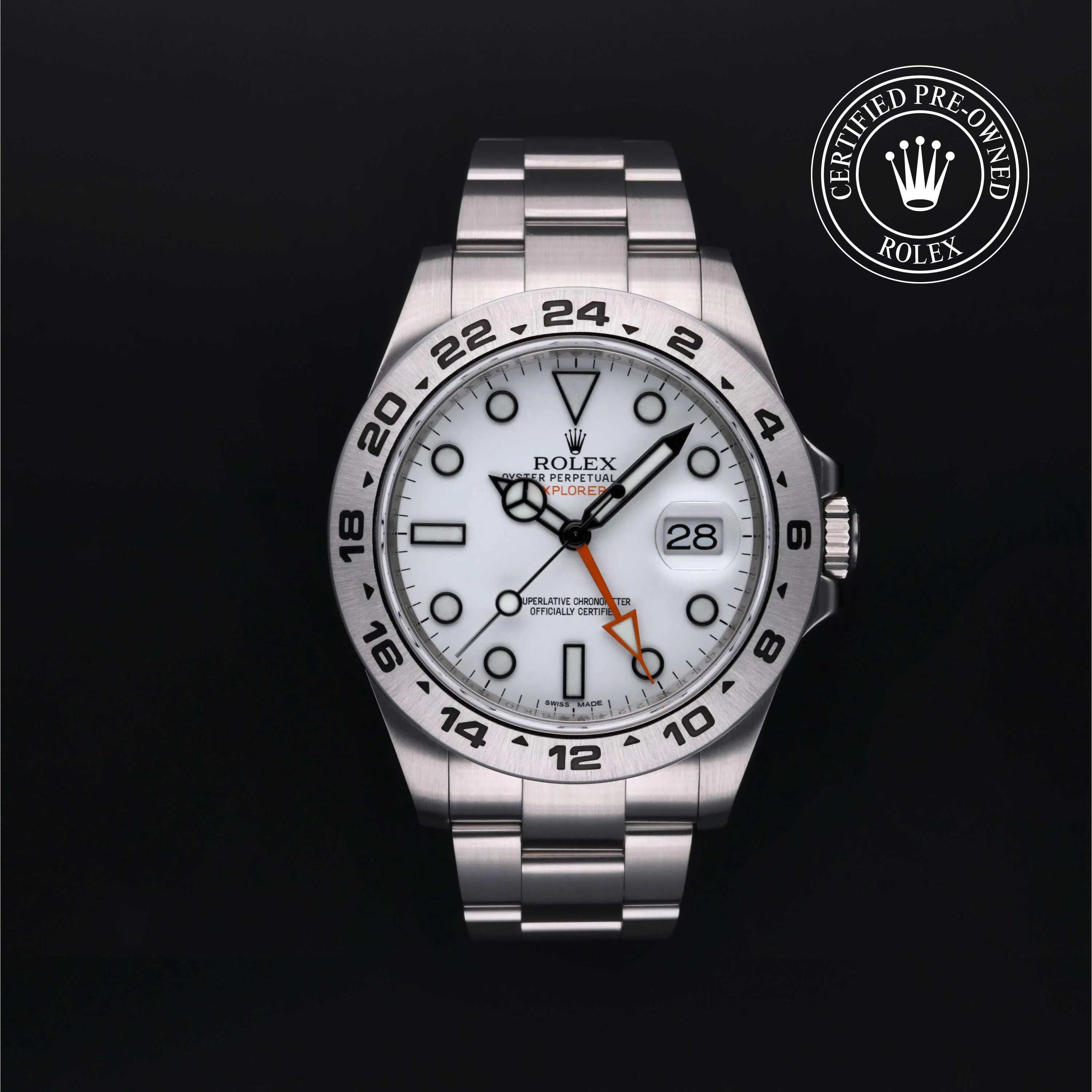 Rolex Certified Pre-Owned Explorer II (216570) self - winding automatic watch, features a 42mm stainless steel case with a fixed, 24 hour graduated bezel surrounding a white dial on a stainless steel Oyster bracelet. Functions include hours, minutes, seconds, date and gmt/world time. This watch has received Rolex-authorized service and certification. It comes with the original papers, and includes a custom Rolex Certified Pre-Owned hang tag, travel pouch and RCPO international warranty card.