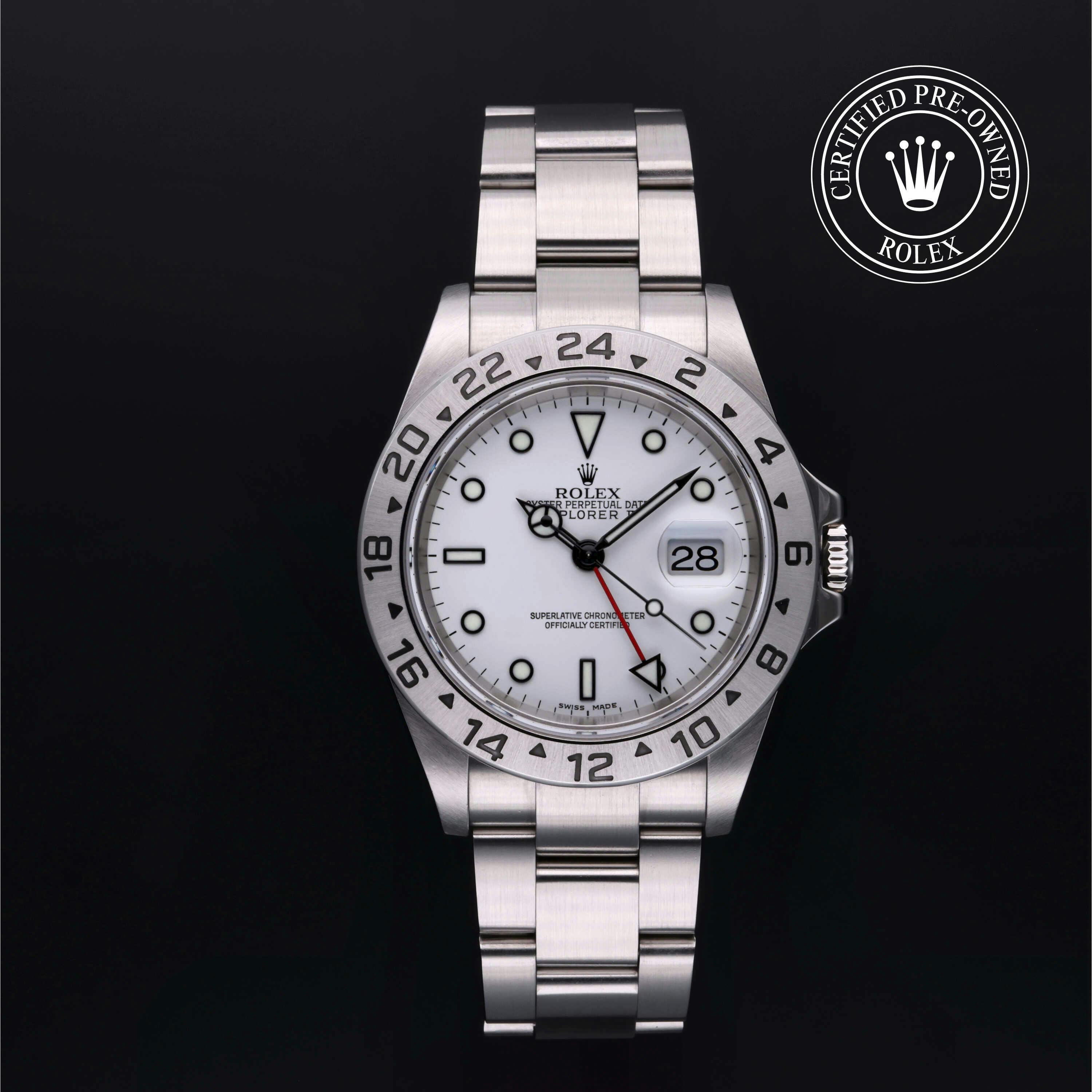 Explore our collection of Rolex Certified Pre-Owned Explorer II watches at The 1916 Company. The Rolex Explorer II is known for its orange or red fourth hand, a 24-hour bezel, and stainless steel Oyster bracelet -- a perfect companion for adventure seekers and expedition takers. Explorer II models feature a fixed Oystersteel bezel, luminous plots circling the dial, a date display at 3 o'clock, and the well-loved brightly colored 24-hour hand.