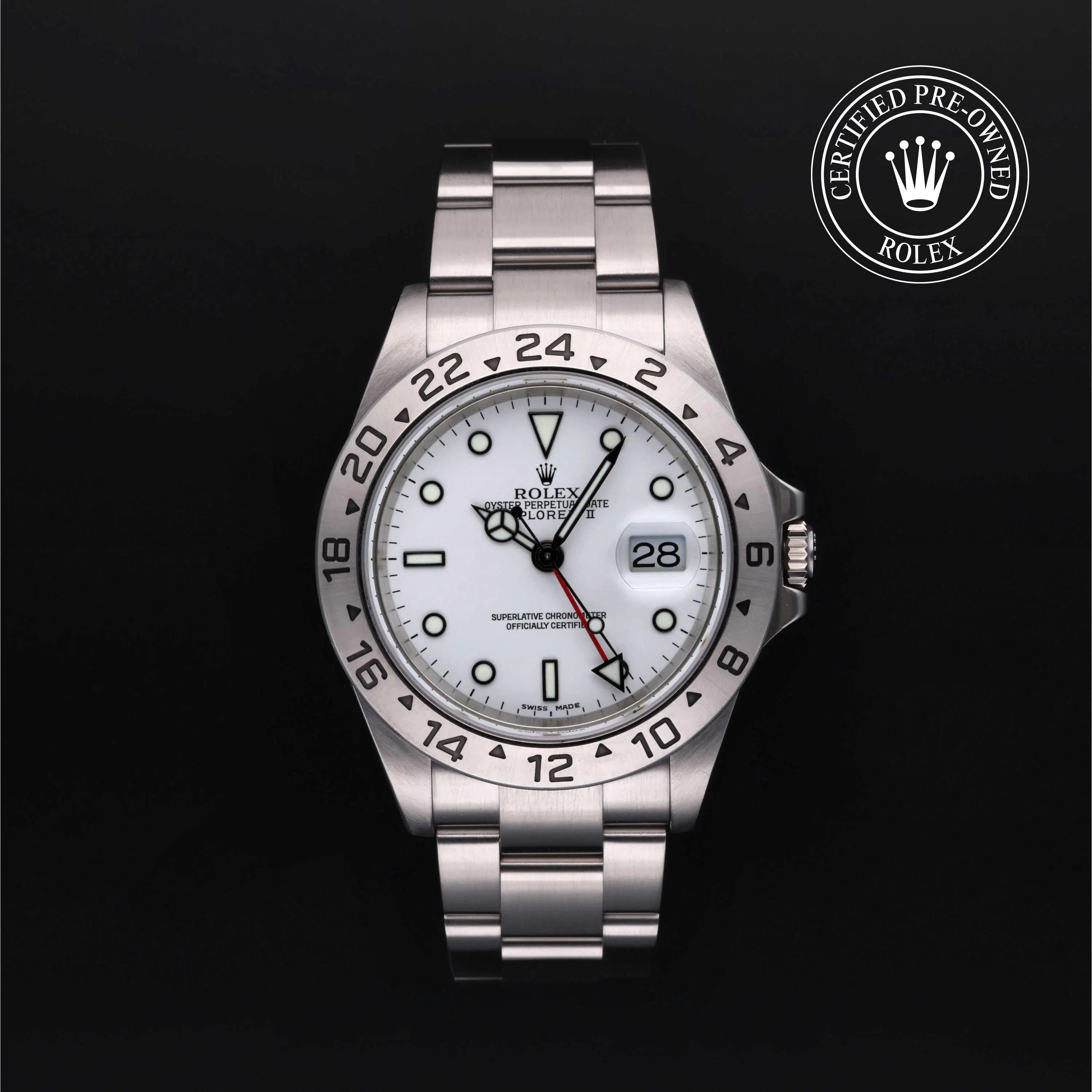 Explore our collection of Rolex Certified Pre-Owned Explorer II watches at The 1916 Company. The Rolex Explorer II is known for its orange or red fourth hand, a 24-hour bezel, and stainless steel Oyster bracelet -- a perfect companion for adventure seekers and expedition takers. Explorer II models feature a fixed Oystersteel bezel, luminous plots circling the dial, a date display at 3 o'clock, and the well-loved brightly colored 24-hour hand.