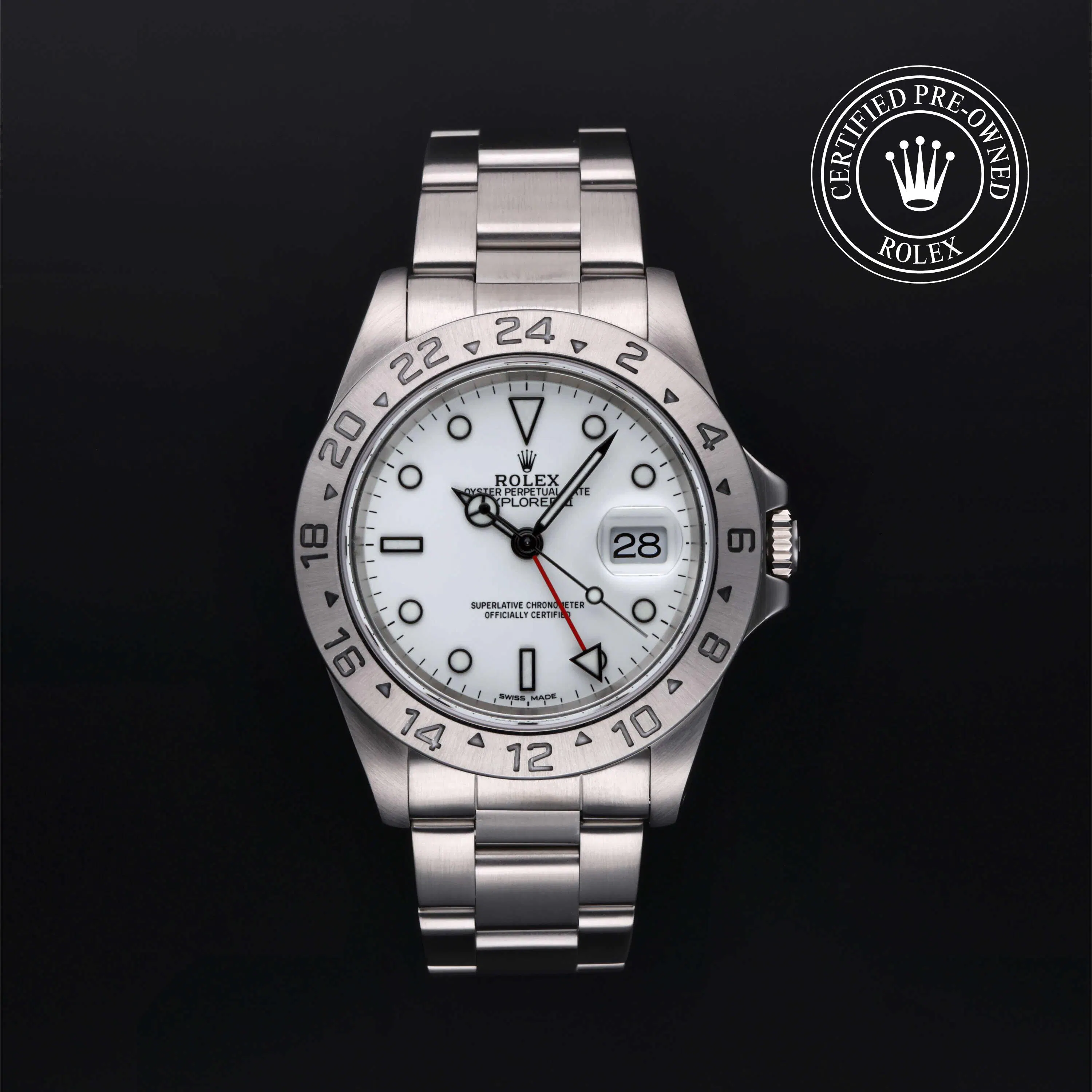 Explore our collection of Rolex Certified Pre-Owned Explorer II watches at The 1916 Company. The Rolex Explorer II is known for its orange or red fourth hand, a 24-hour bezel, and stainless steel Oyster bracelet -- a perfect companion for adventure seekers and expedition takers. Explorer II models feature a fixed Oystersteel bezel, luminous plots circling the dial, a date display at 3 o'clock, and the well-loved brightly colored 24-hour hand.