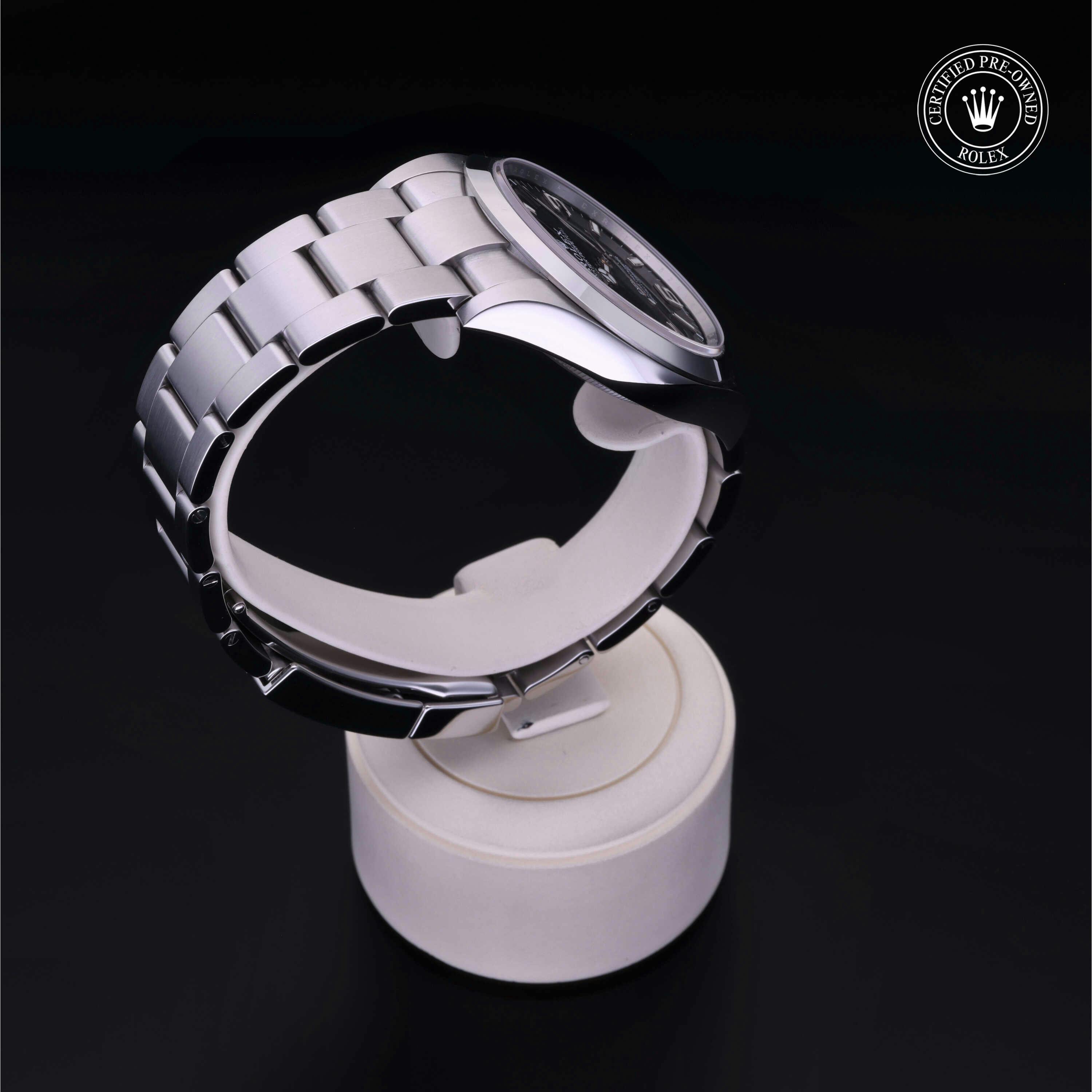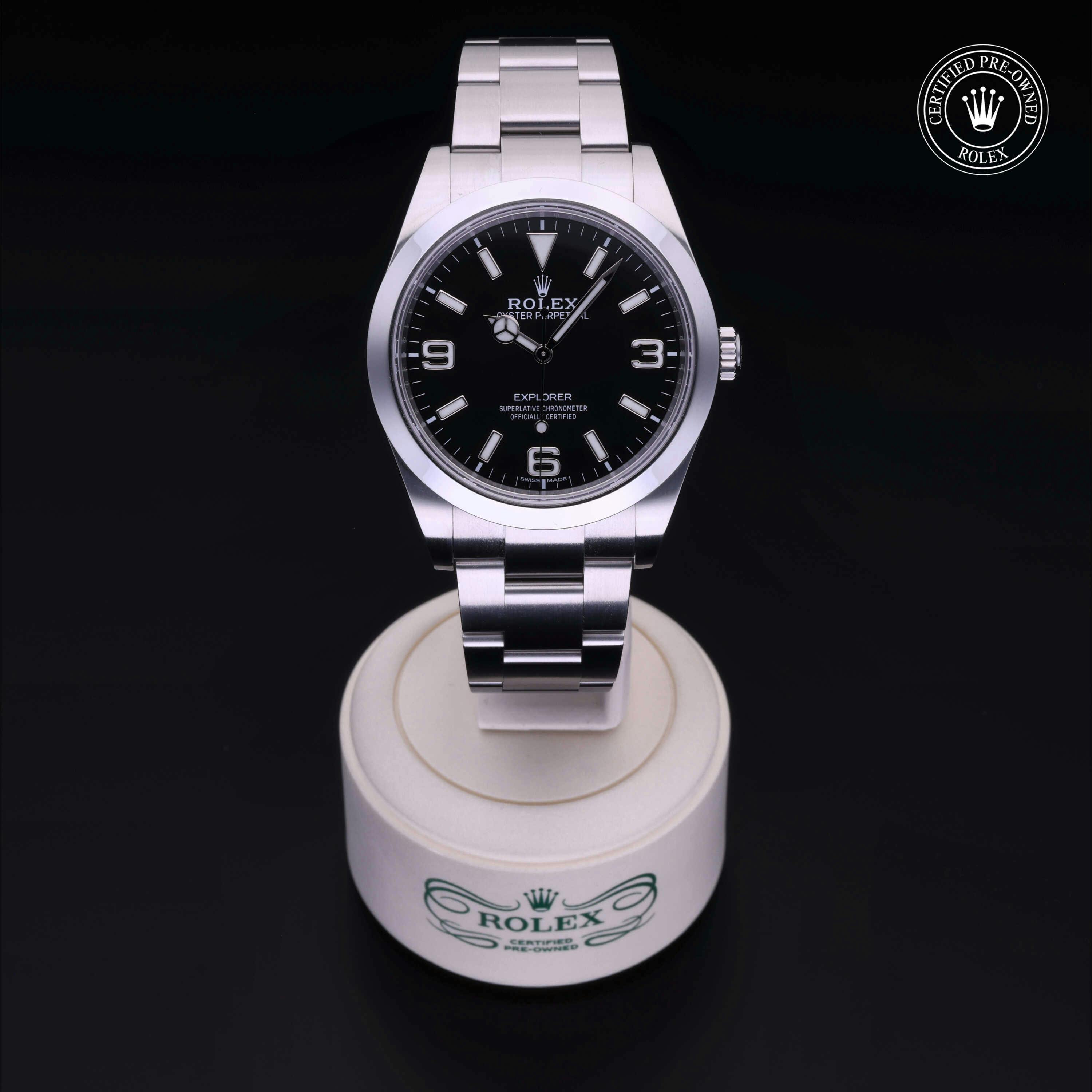 Rolex Certified Pre-Owned Explorer (214270) self-winding automatic watch, features a 39mm stainless steel case and smooth bezel surrounding a black dial on a stainless steel oyster bracelet. Functions include hours, minutes and seconds. This watch has received Rolex-authorized service and certification. It comes with the original box and papers, and includes a custom Rolex Certified Pre-Owned hang tag, travel pouch and RCPO international warranty card.