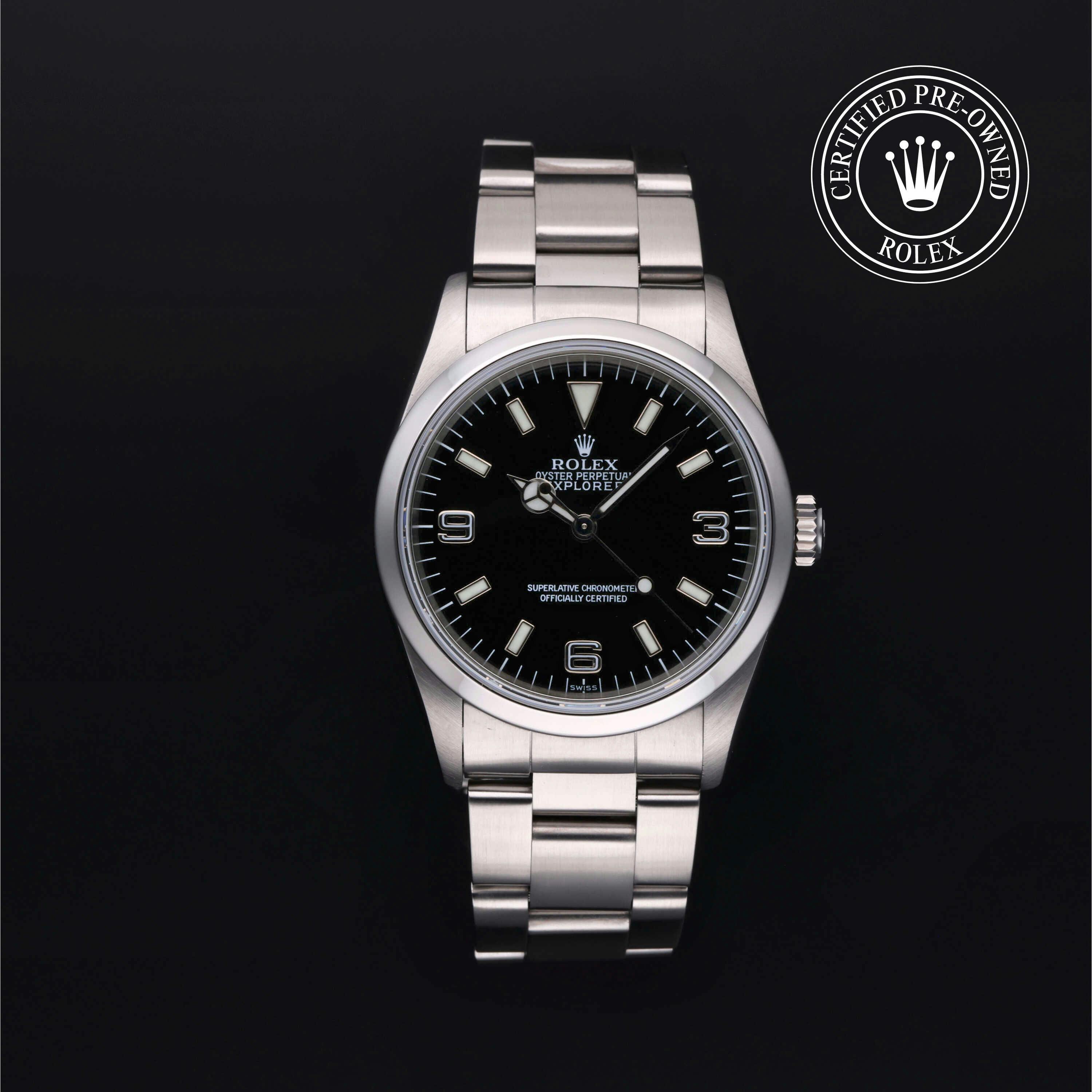 Rolex Certified Pre-Owned Explorer (14270) self - winding automatic watch, features a 36mm stainless steel case and smooth bezel surrounding a black dial on a stainless steel oyster bracelet. Functions include hours, minutes and seconds. This watch has received Rolex-authorized service and certification. It does not come with the original box or papers, but includes a custom Rolex Certified Pre-Owned hang tag, travel pouch and RCPO international warranty card.