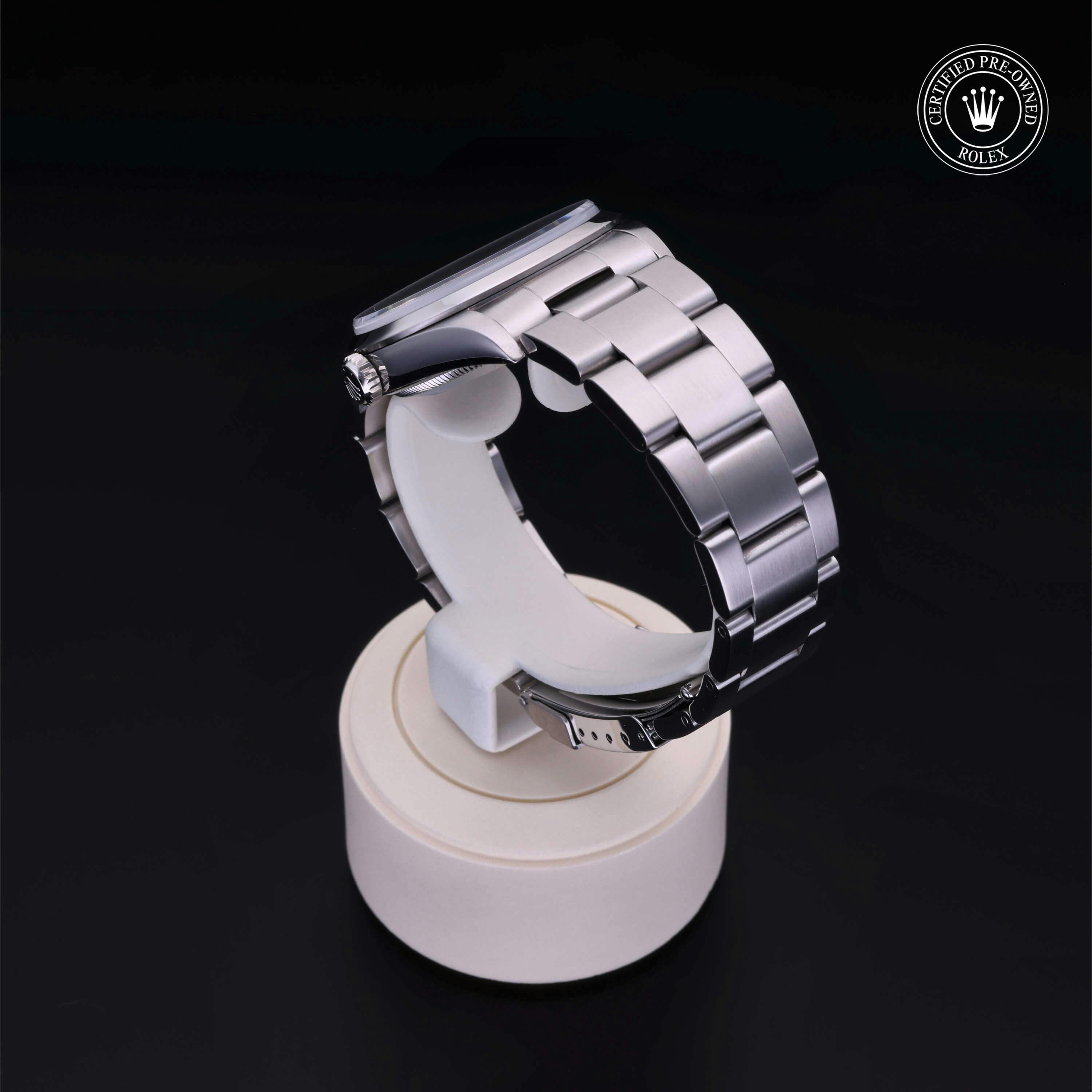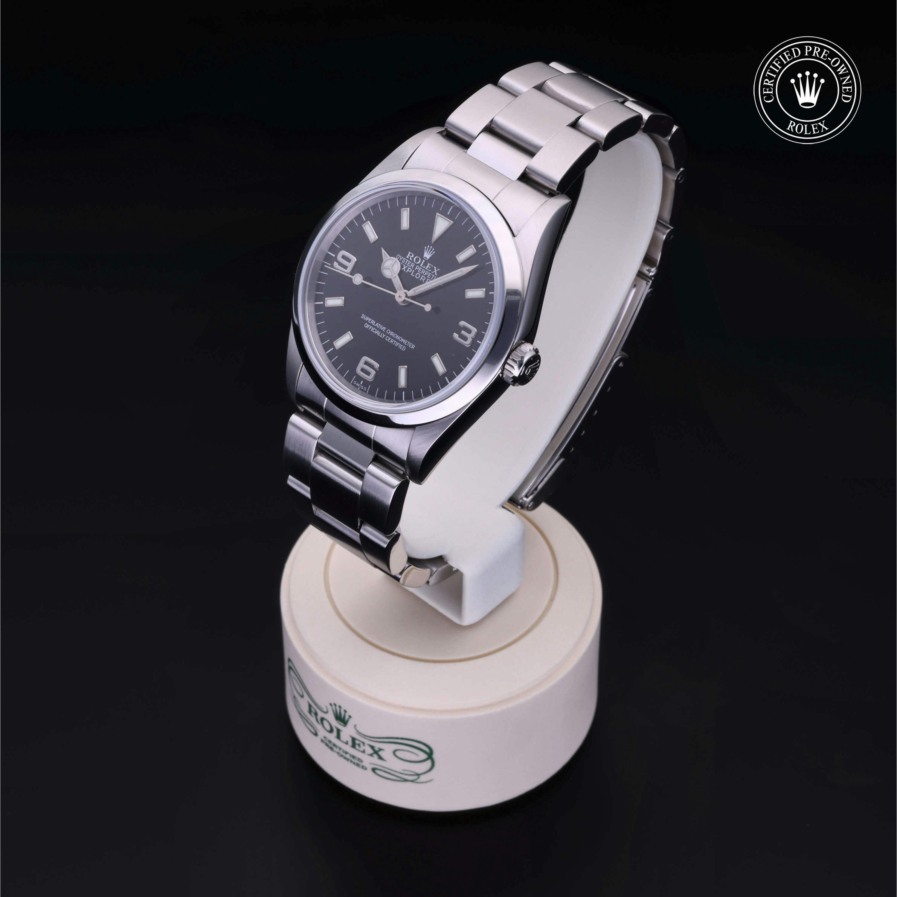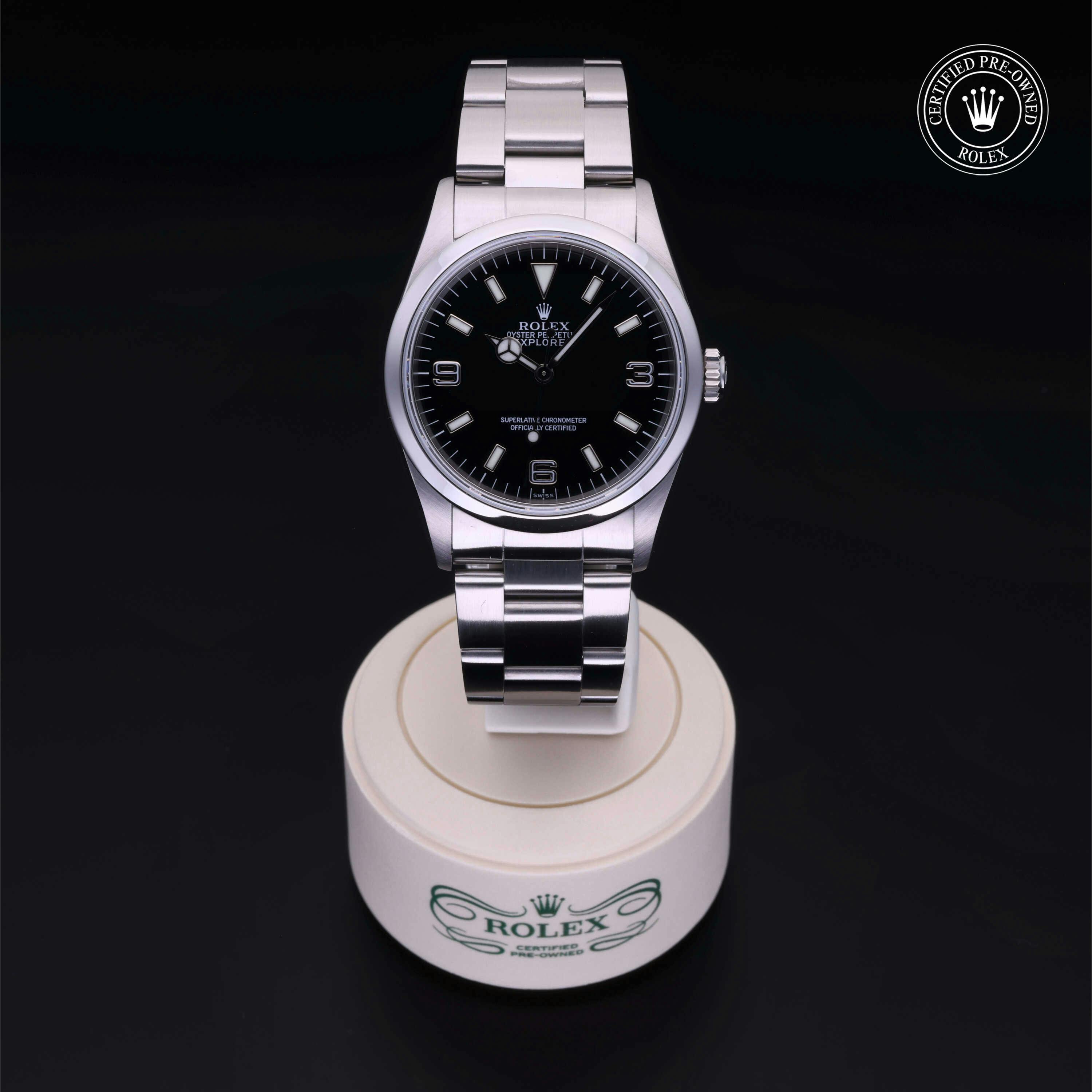 Rolex Certified Pre-Owned Explorer (14270) self - winding automatic watch, features a 36mm stainless steel case and smooth bezel surrounding a black dial on a stainless steel oyster bracelet. Functions include hours, minutes and seconds. This watch has received Rolex-authorized service and certification. It does not come with the original box or papers, but includes a custom Rolex Certified Pre-Owned hang tag, travel pouch and RCPO international warranty card.