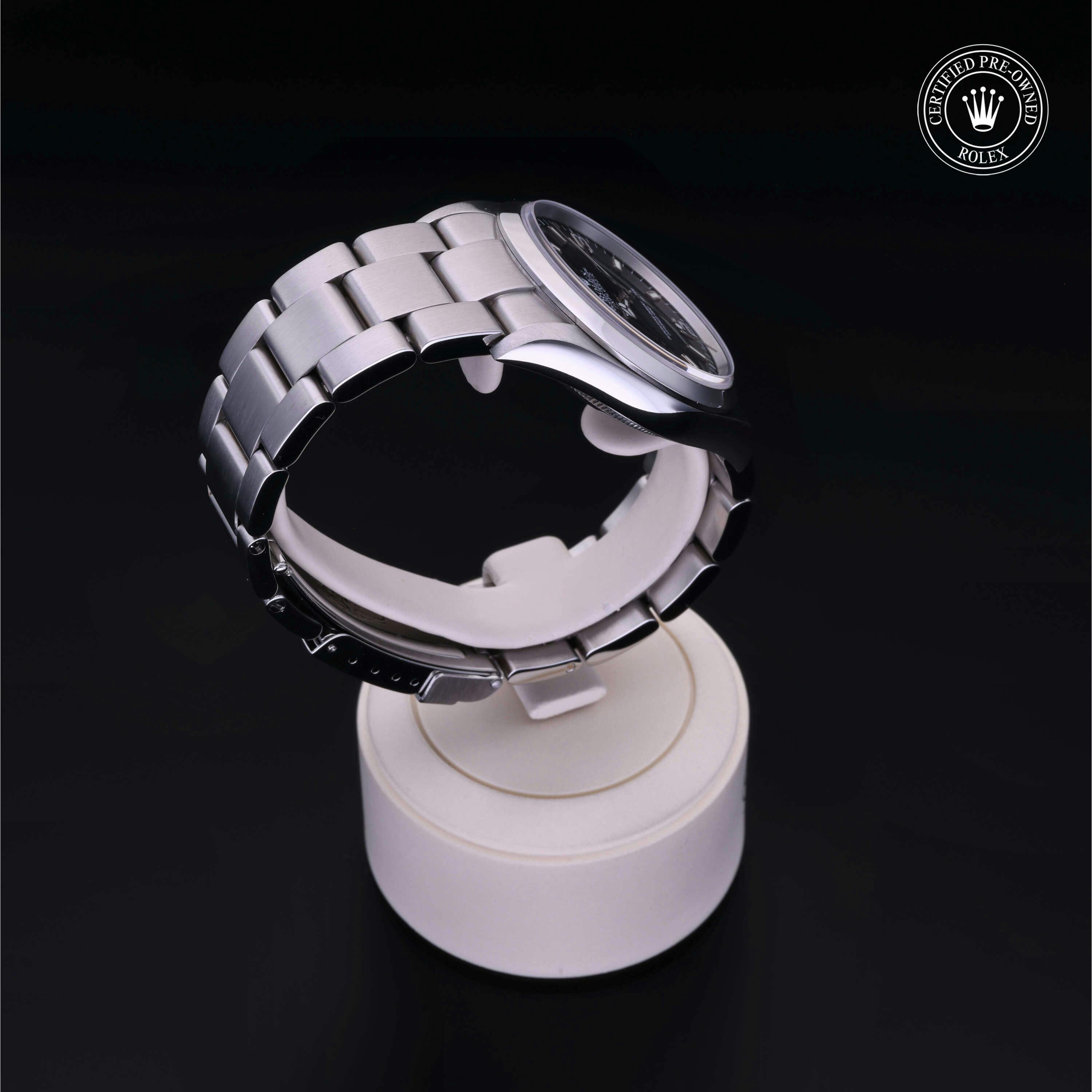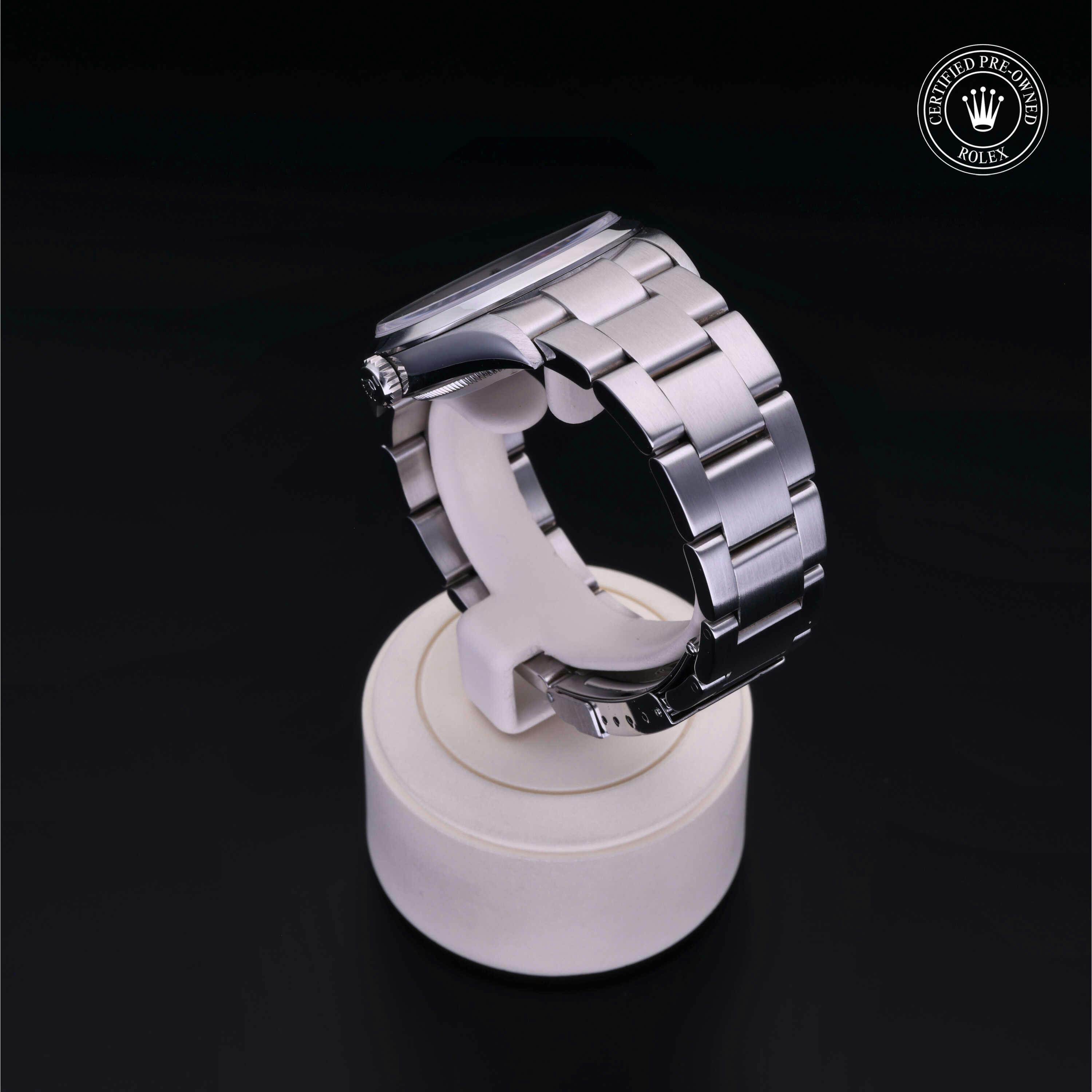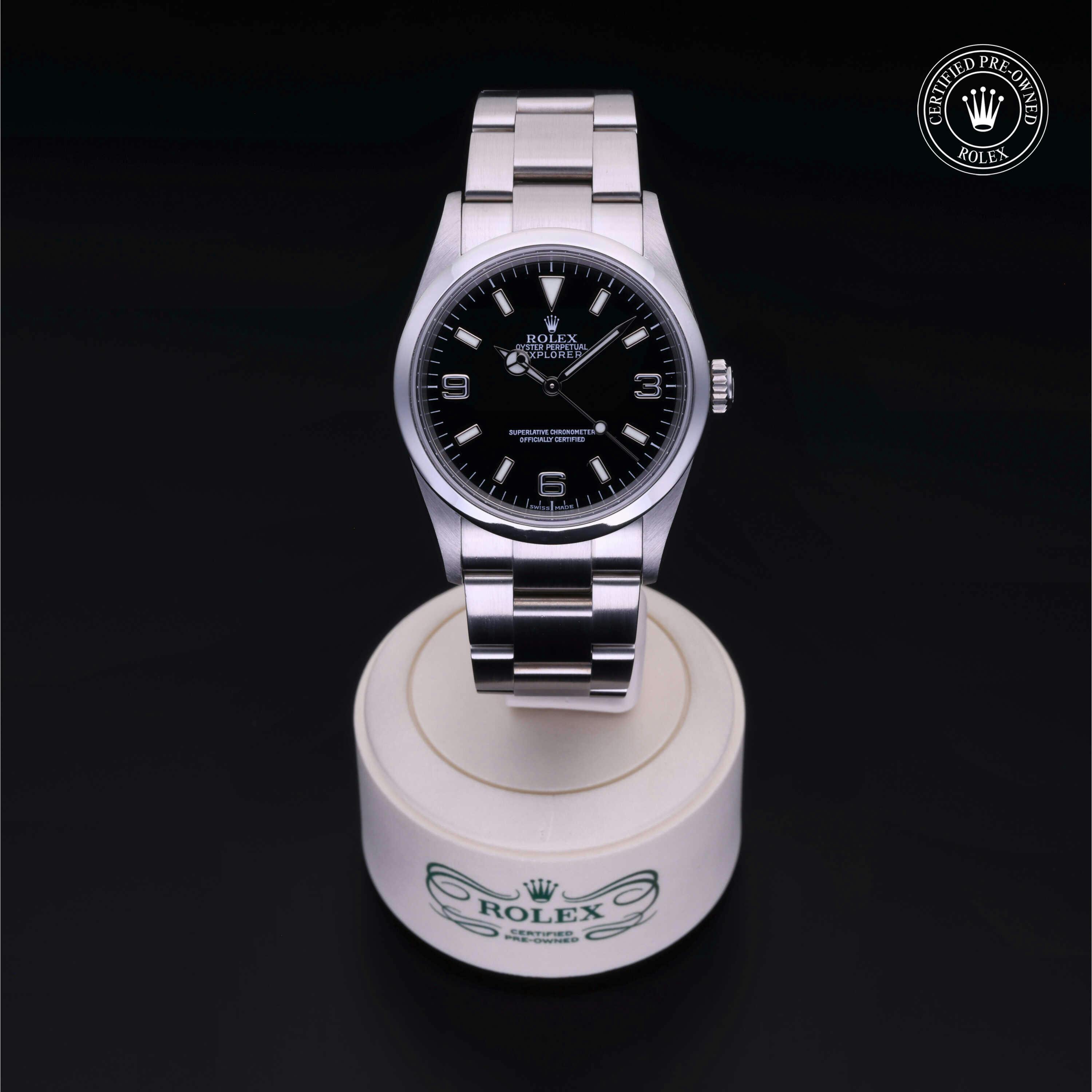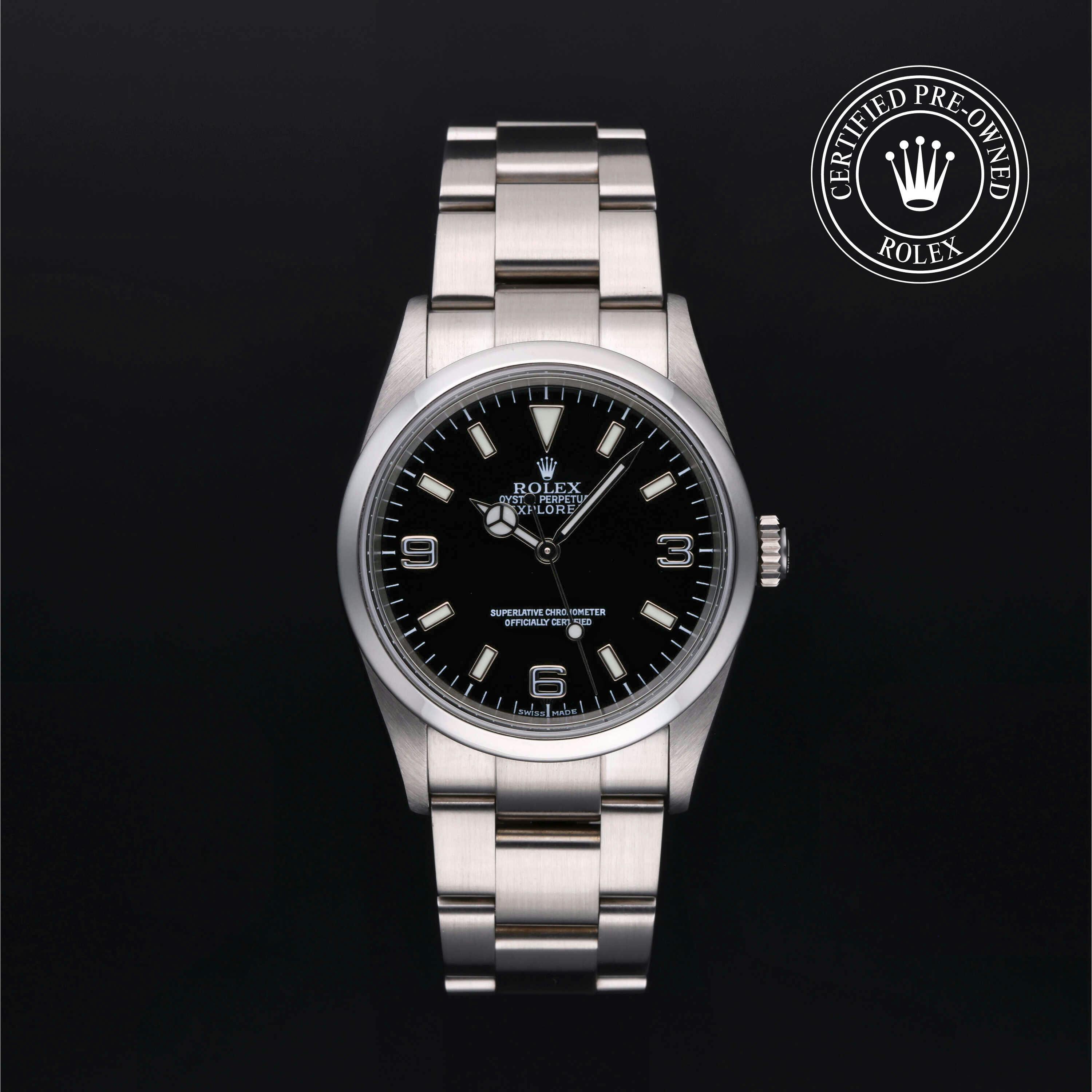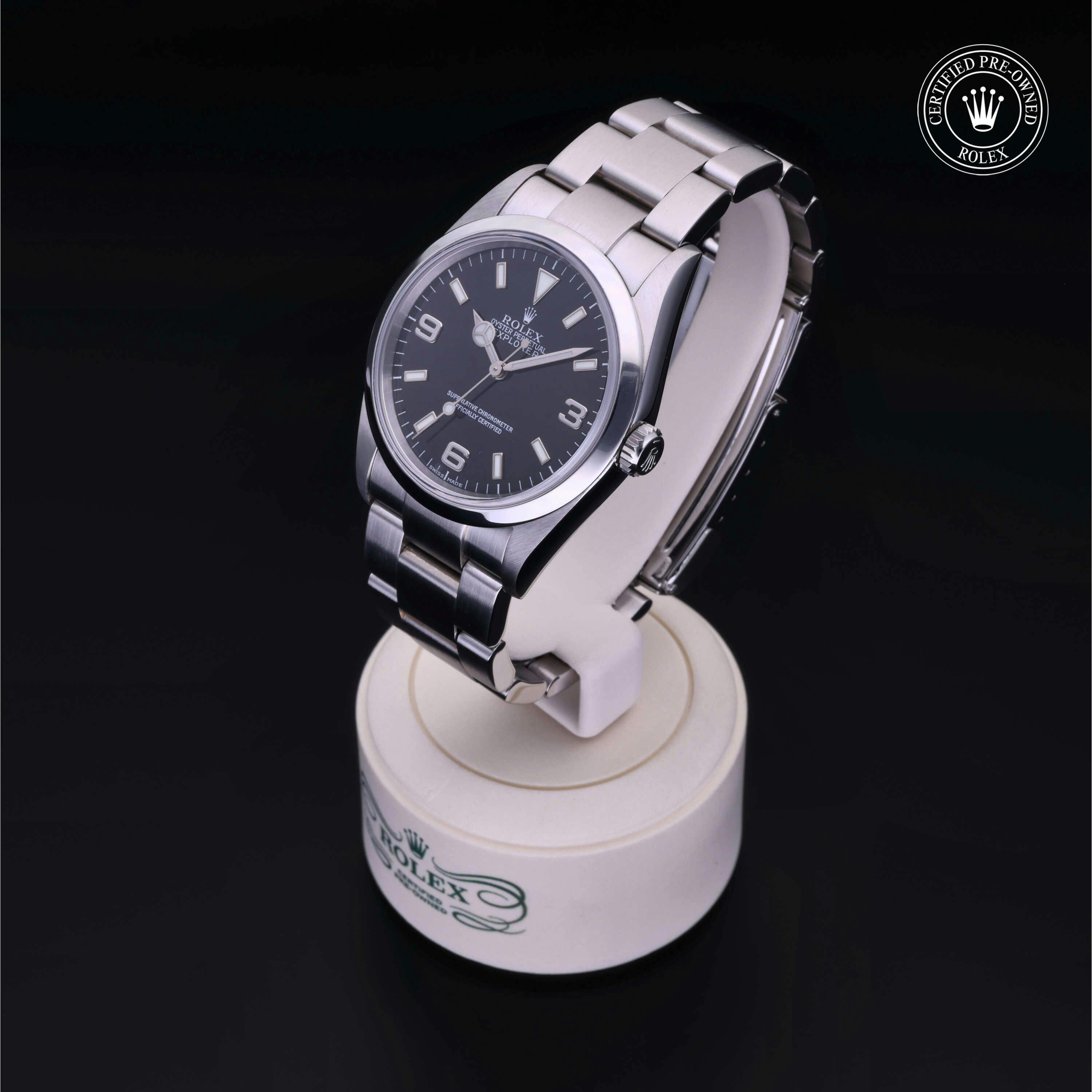 Rolex Certified Pre-Owned Explorer (114270) self - winding automatic watch, features a 36mm stainless steel case and smooth bezel surrounding a black dial on a stainless steel oyster bracelet. Functions include hours, minutes and seconds. This watch has received Rolex-authorized service and certification. It does not come with the original box or papers, but includes a custom Rolex Certified Pre-Owned hang tag, travel pouch and RCPO international warranty card.