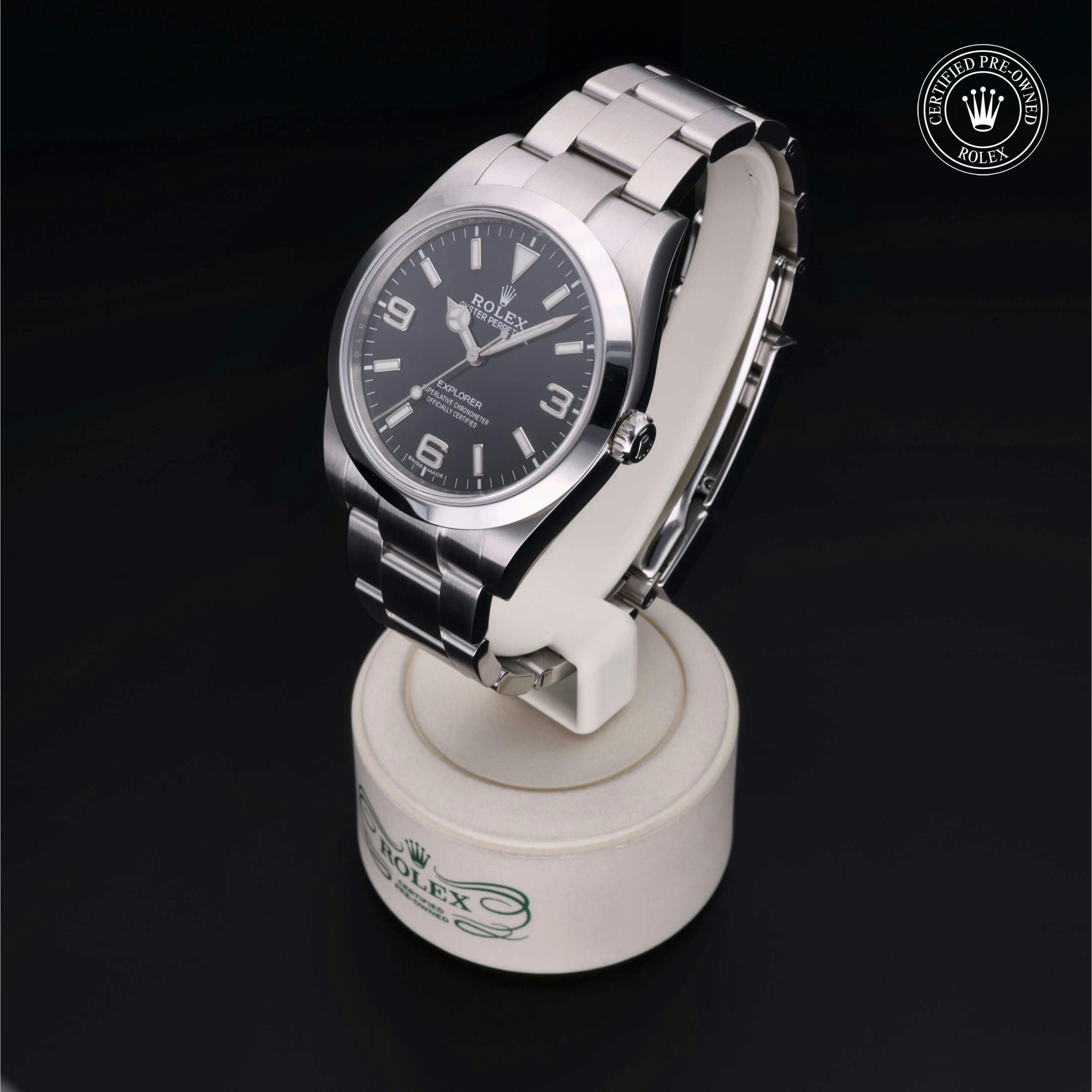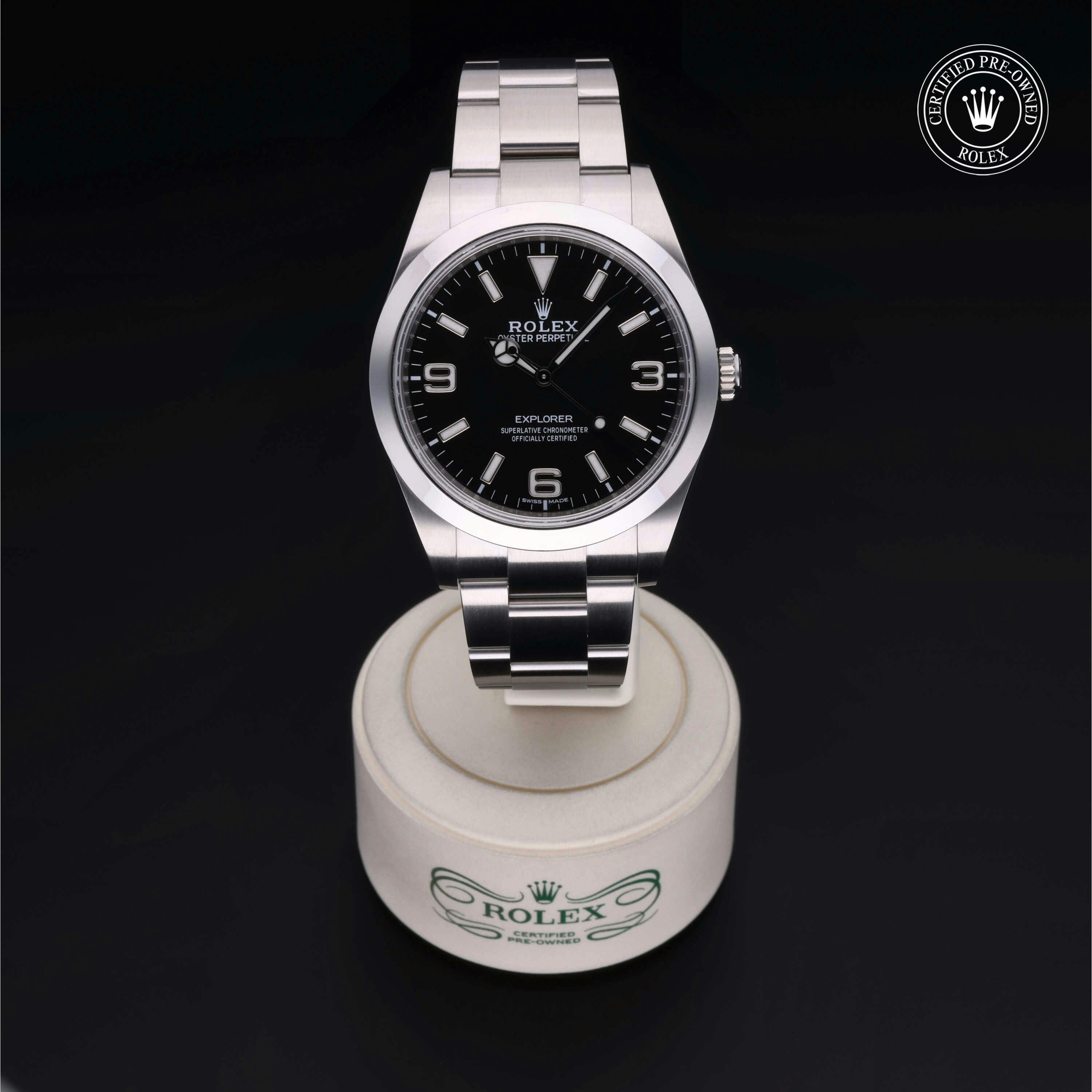Rolex Certified Pre-Owned Explorer (214270) self - winding automatic watch, features a 39mm stainless steel case and smooth bezel surrounding a black dial on a stainless steel oyster bracelet. Functions include hours, minutes and seconds. This watch has received Rolex-authorized service and certification. It does not come with the original box or papers, but includes a custom Rolex Certified Pre-Owned hang tag, travel pouch and RCPO international warranty card.
