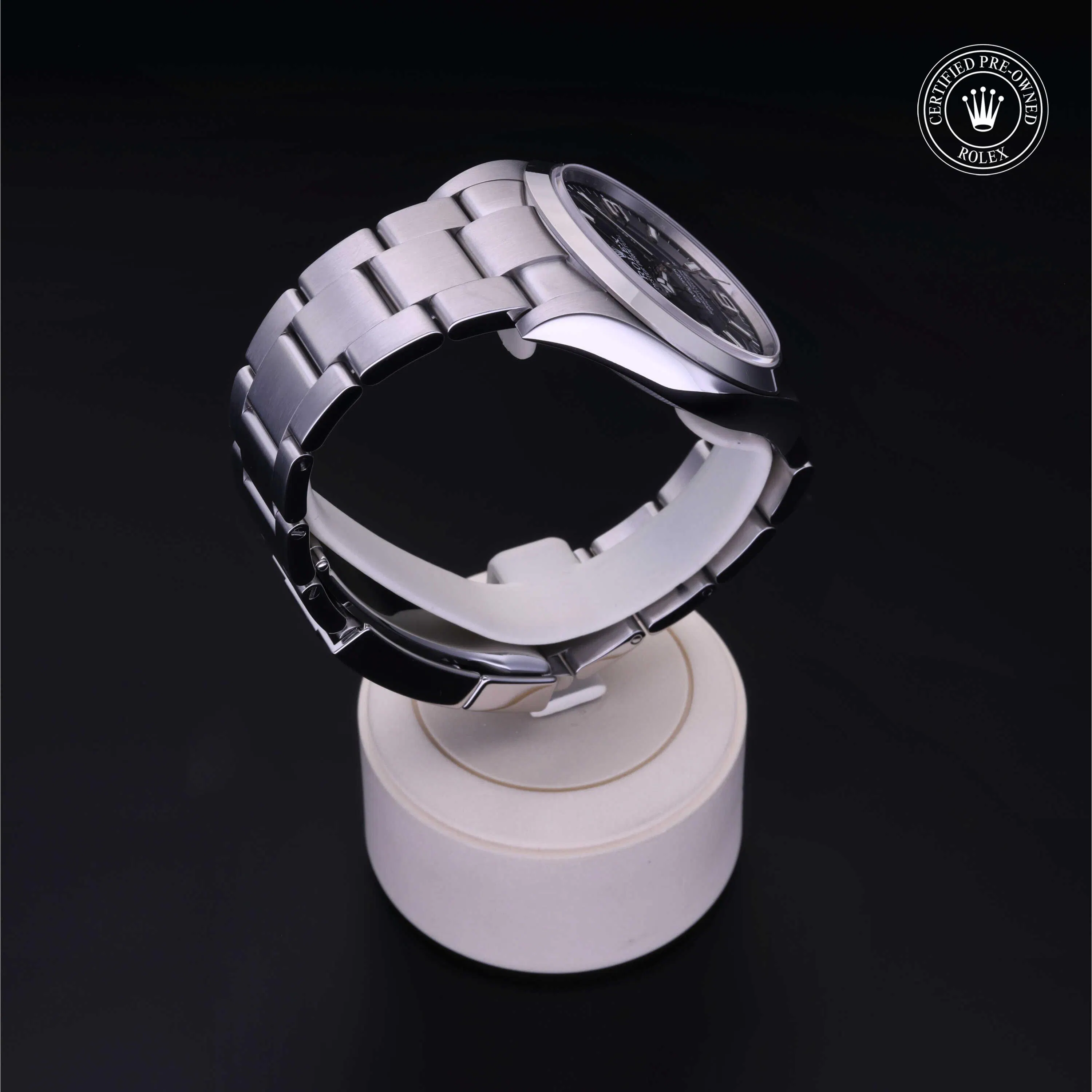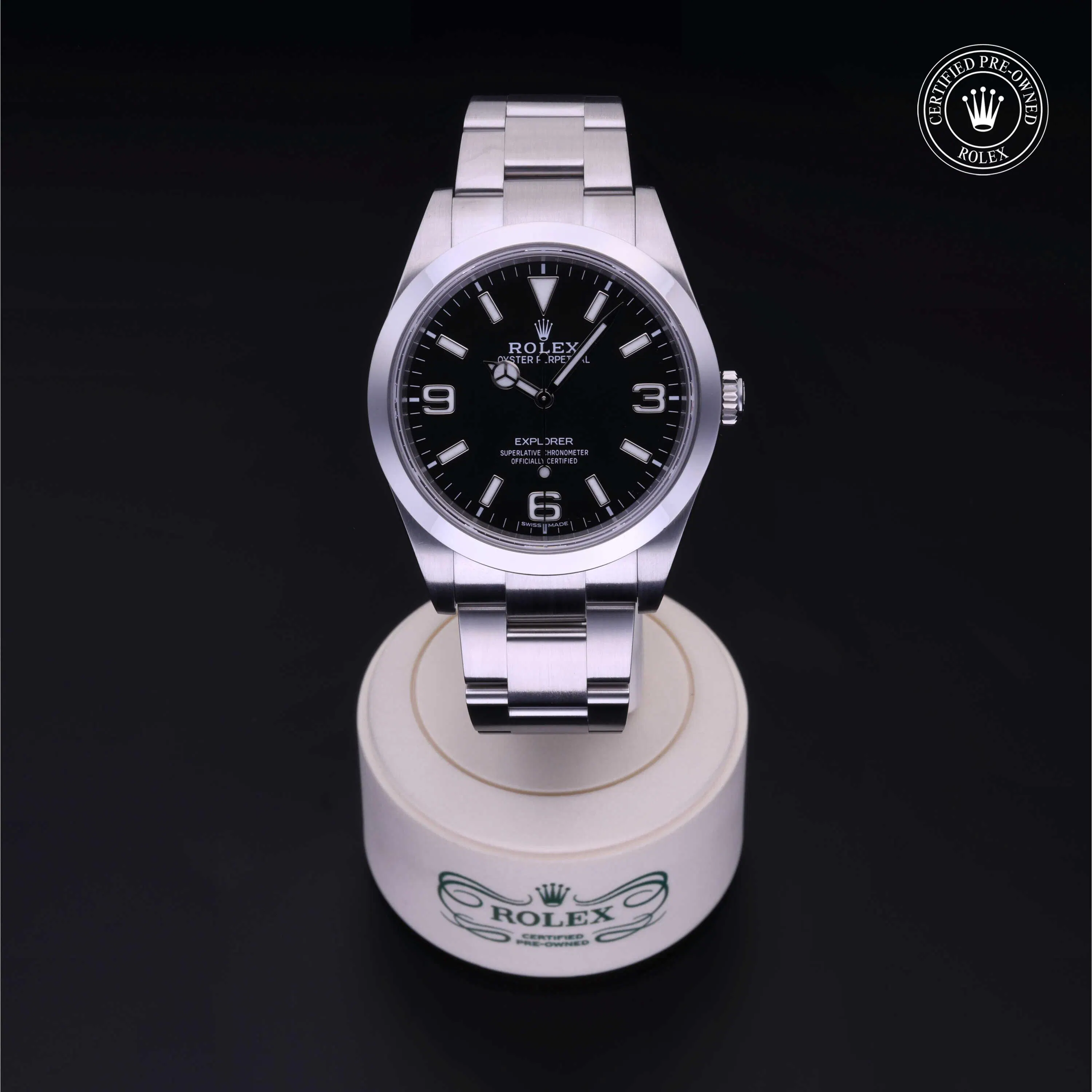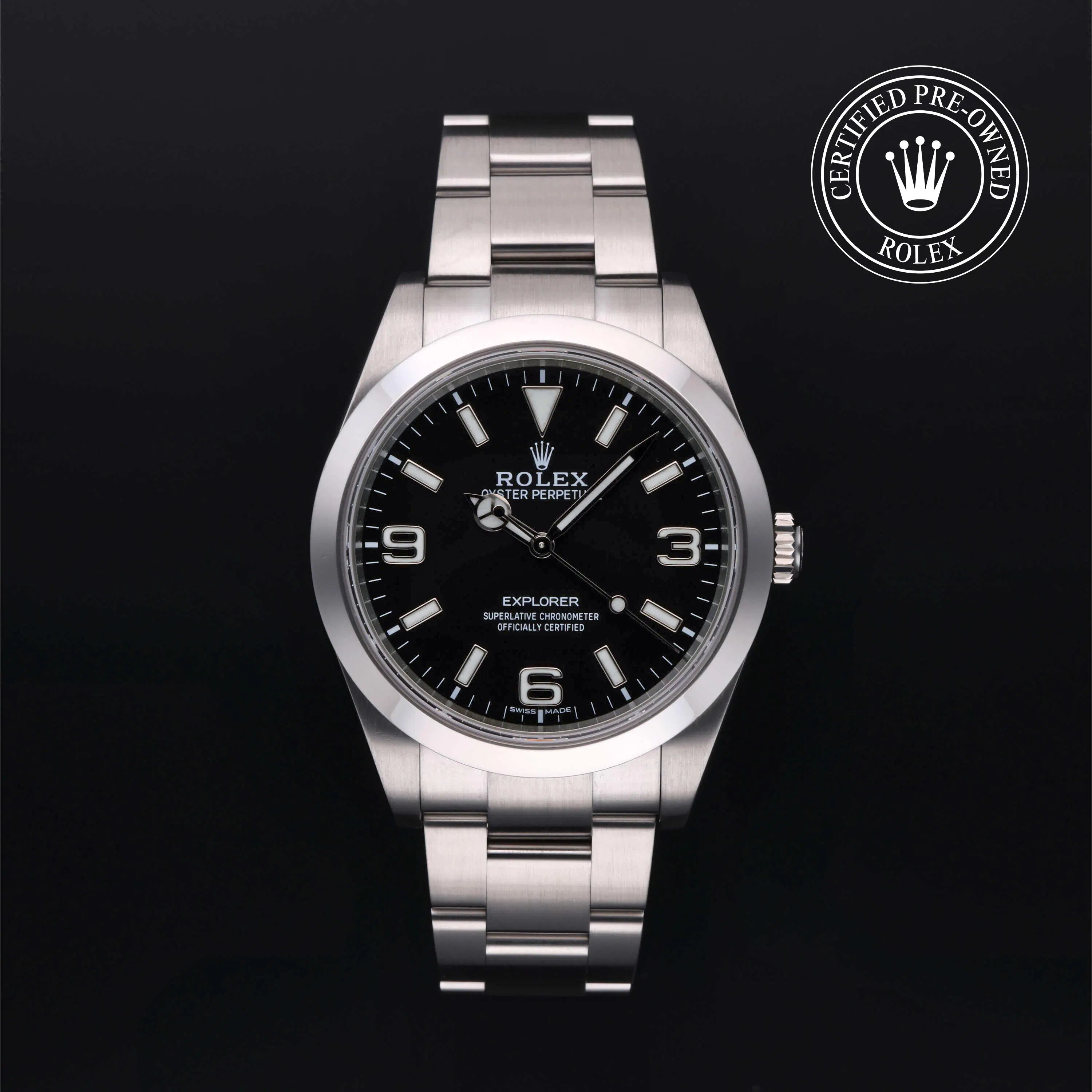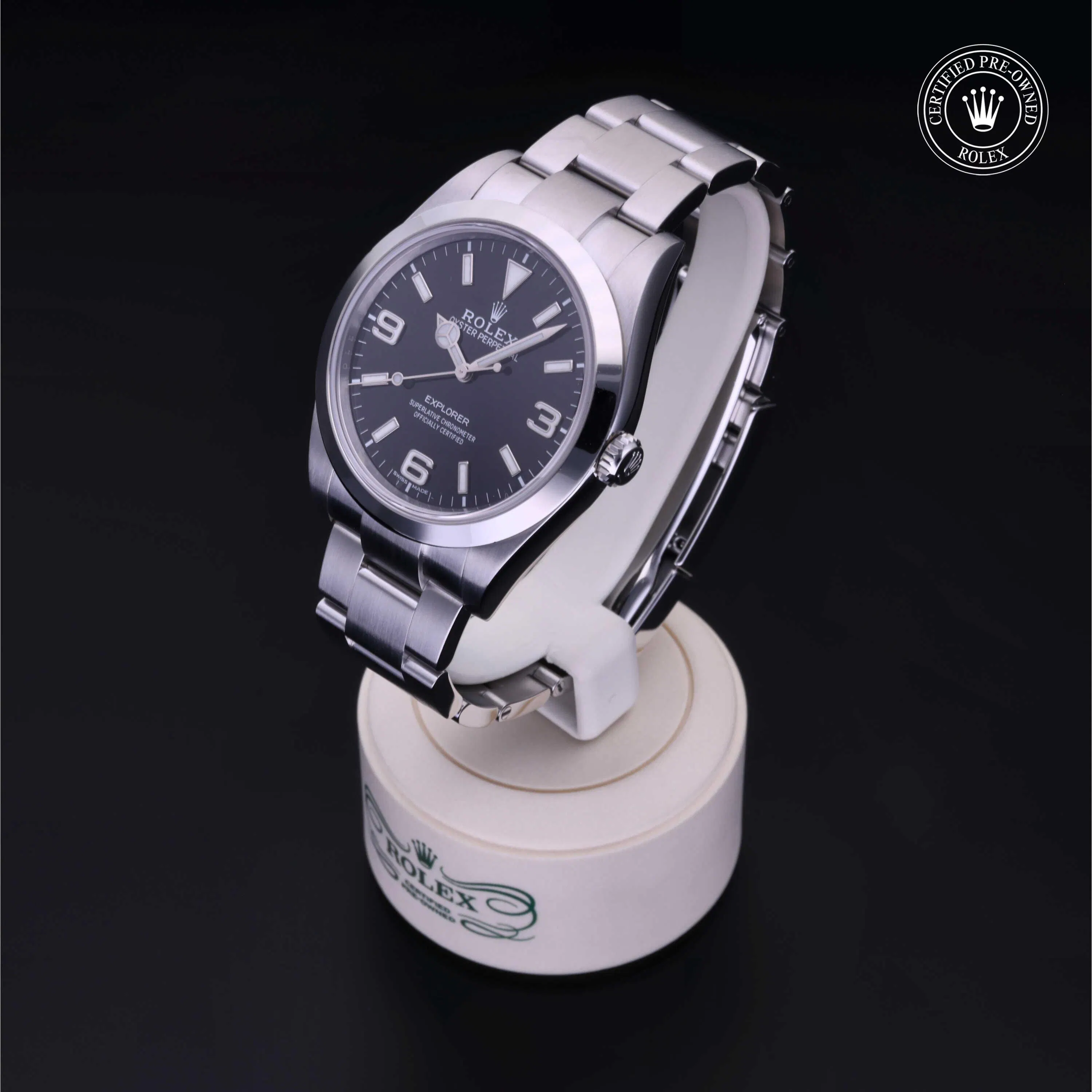Rolex Certified Pre-Owned Explorer (214270) self - winding automatic watch, features a 39mm stainless steel case and smooth bezel surrounding a black dial on a stainless steel oyster bracelet. Functions include hours, minutes and seconds. This watch has received Rolex-authorized service and certification. It comes with the original box and papers, and includes a custom Rolex Certified Pre-Owned hang tag, travel pouch and RCPO international warranty card.