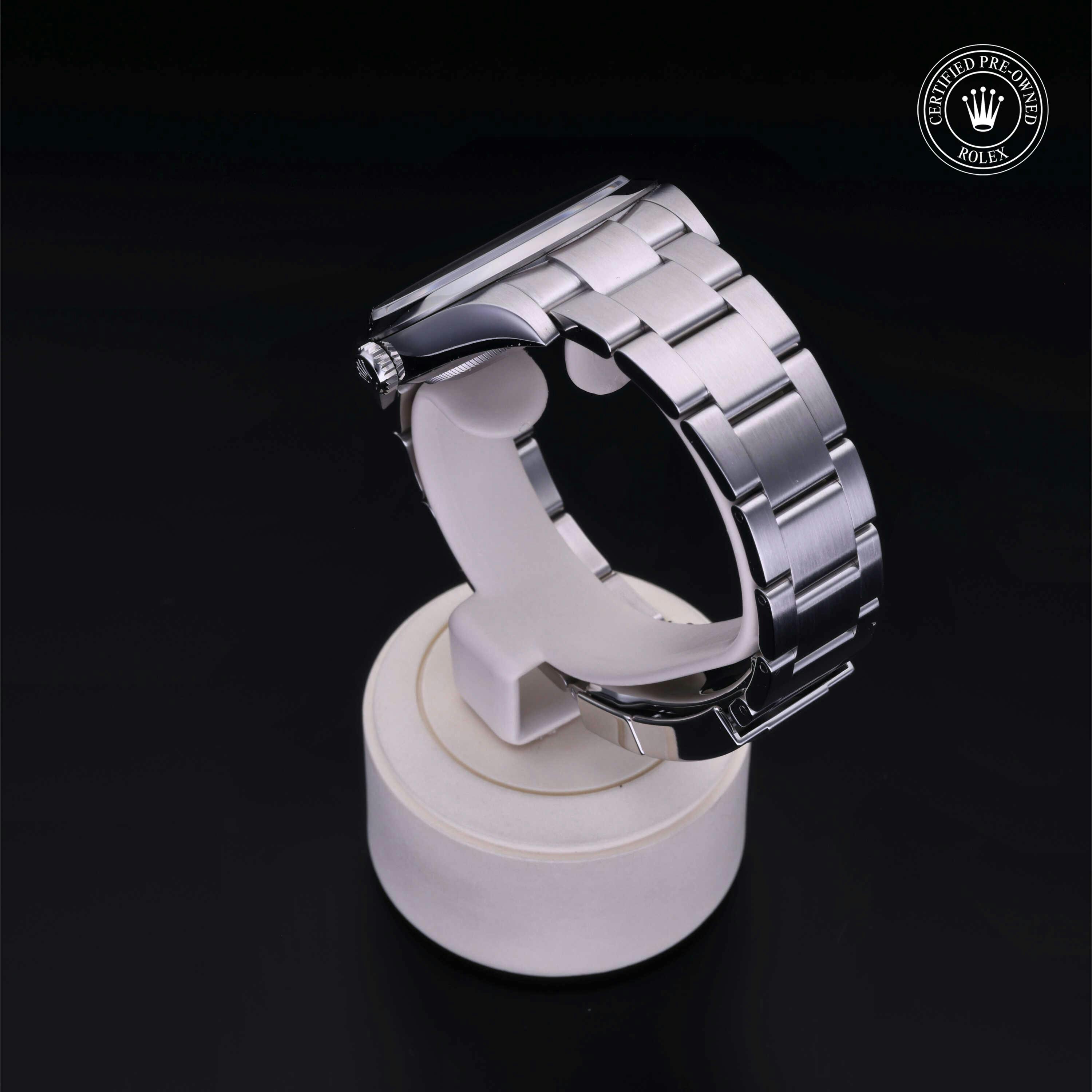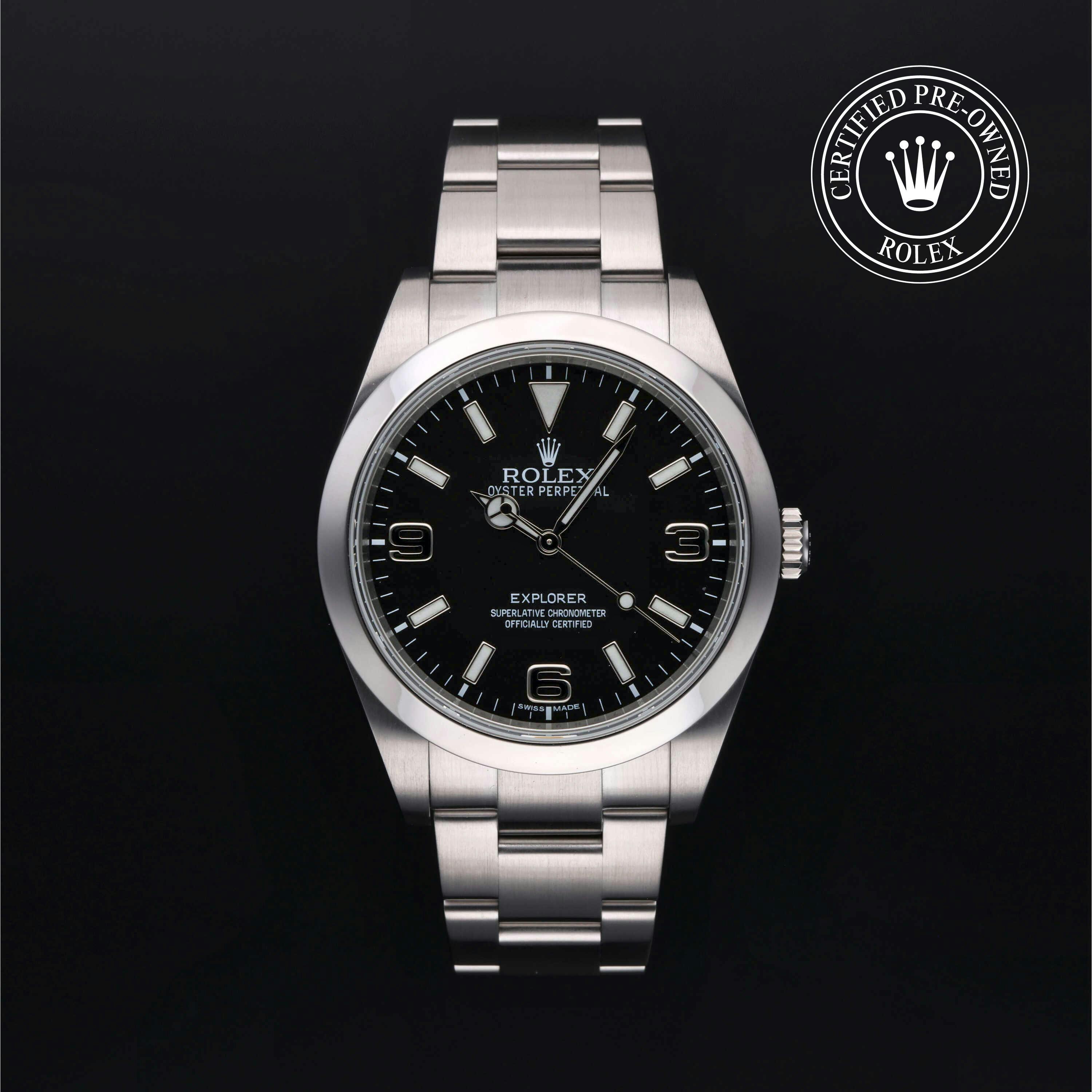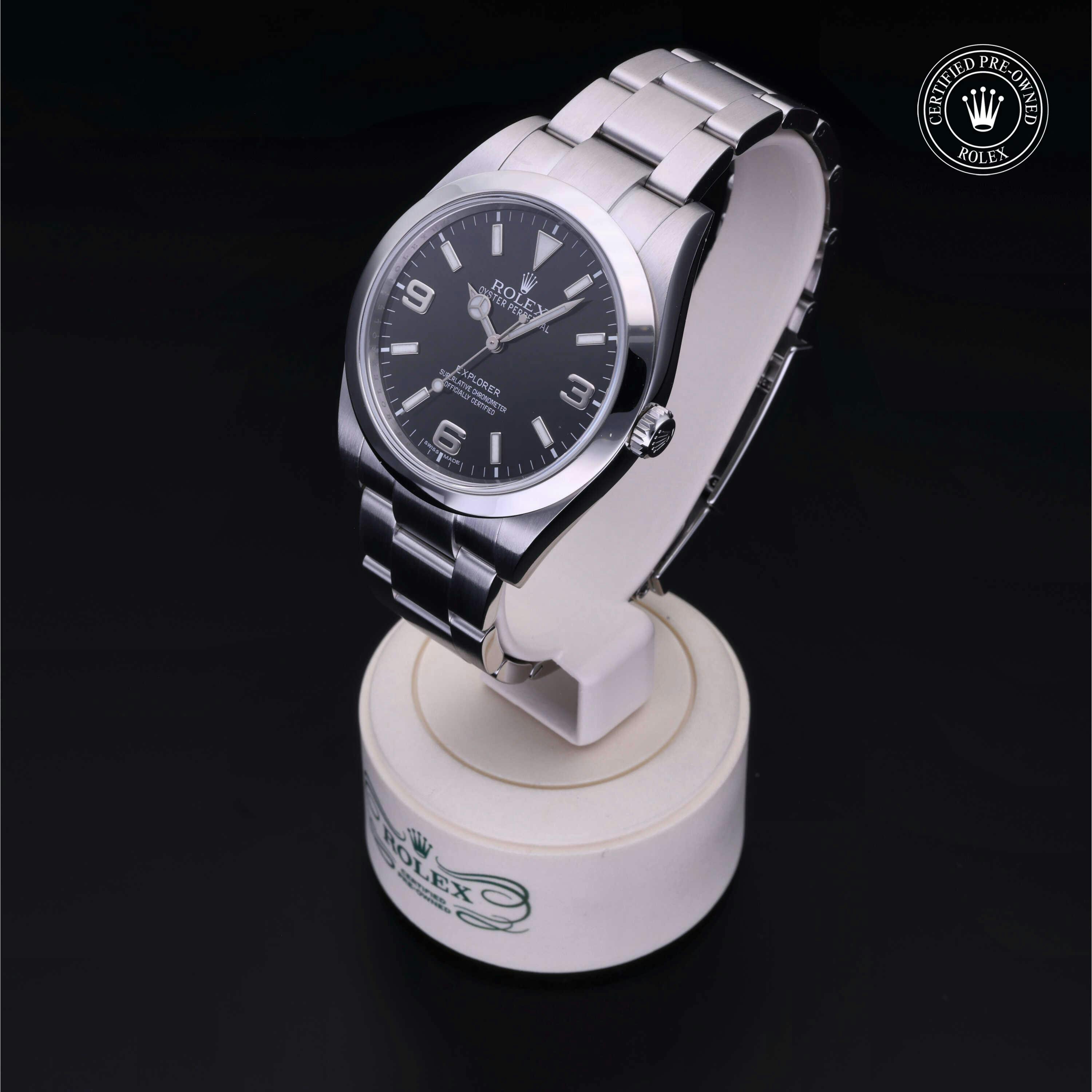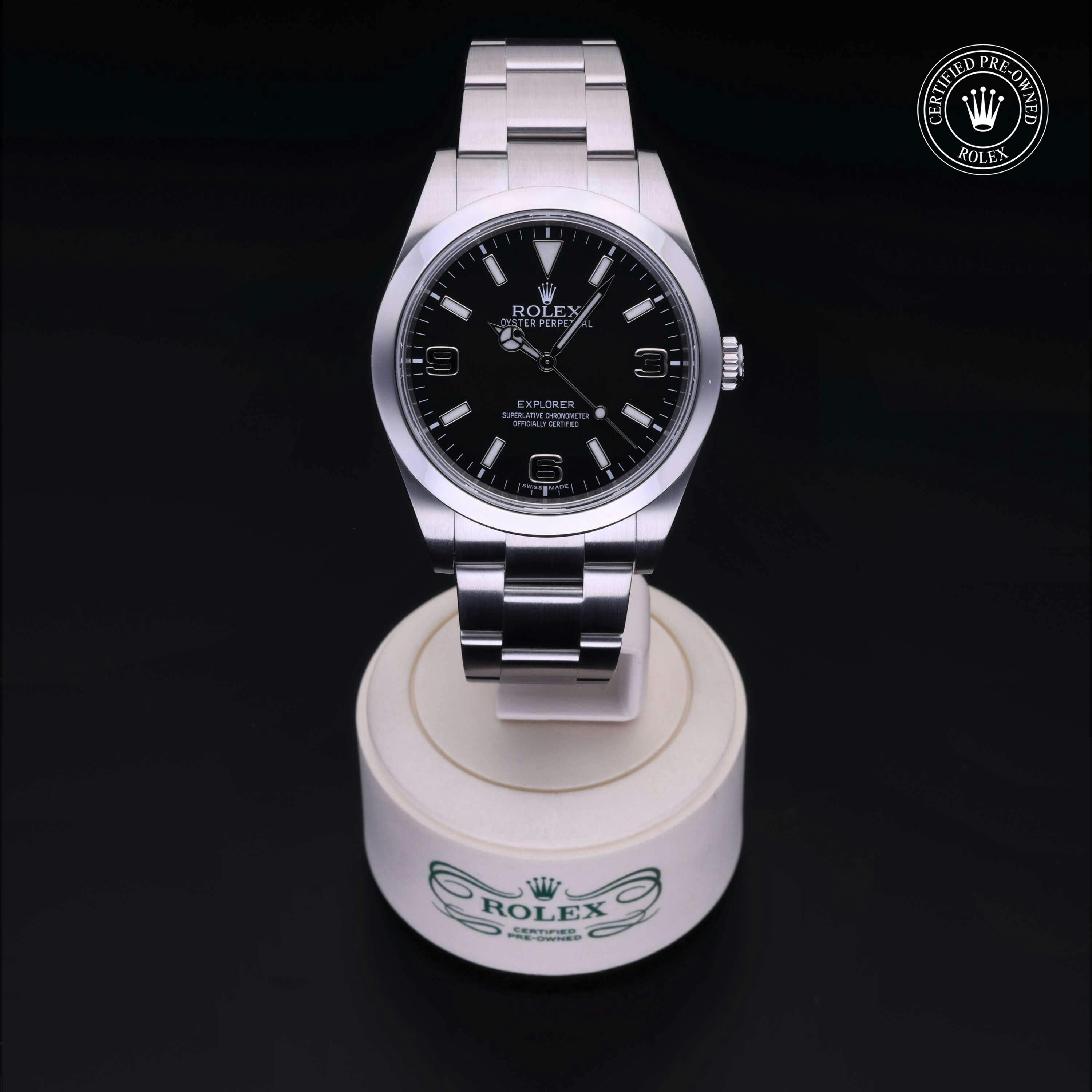 Rolex Certified Pre-Owned Explorer (214270) self - winding automatic watch, features a 39mm stainless steel case and smooth bezel surrounding a black dial on a stainless steel oyster bracelet. Functions include hours, minutes and seconds. This watch has received Rolex-authorized service and certification. It comes with the original papers, and includes a custom Rolex Certified Pre-Owned hang tag, travel pouch and RCPO international warranty card.