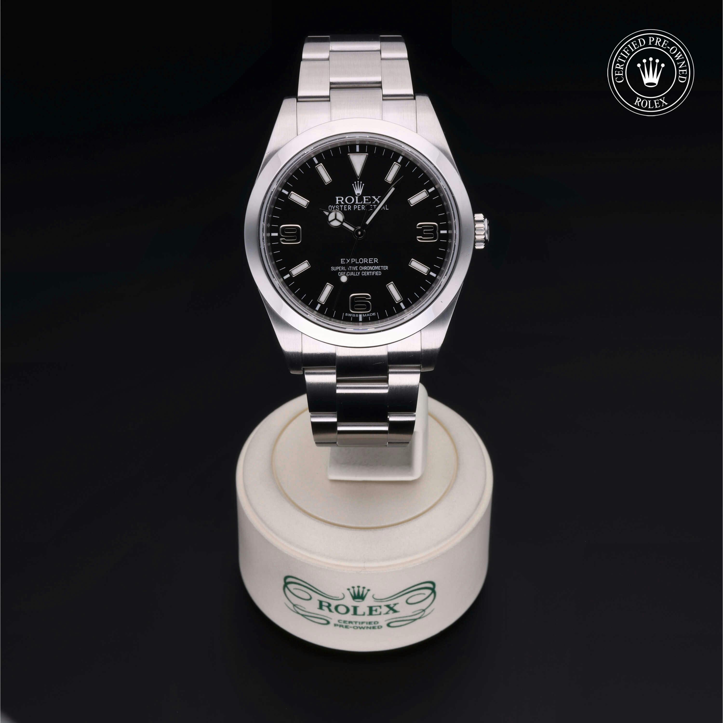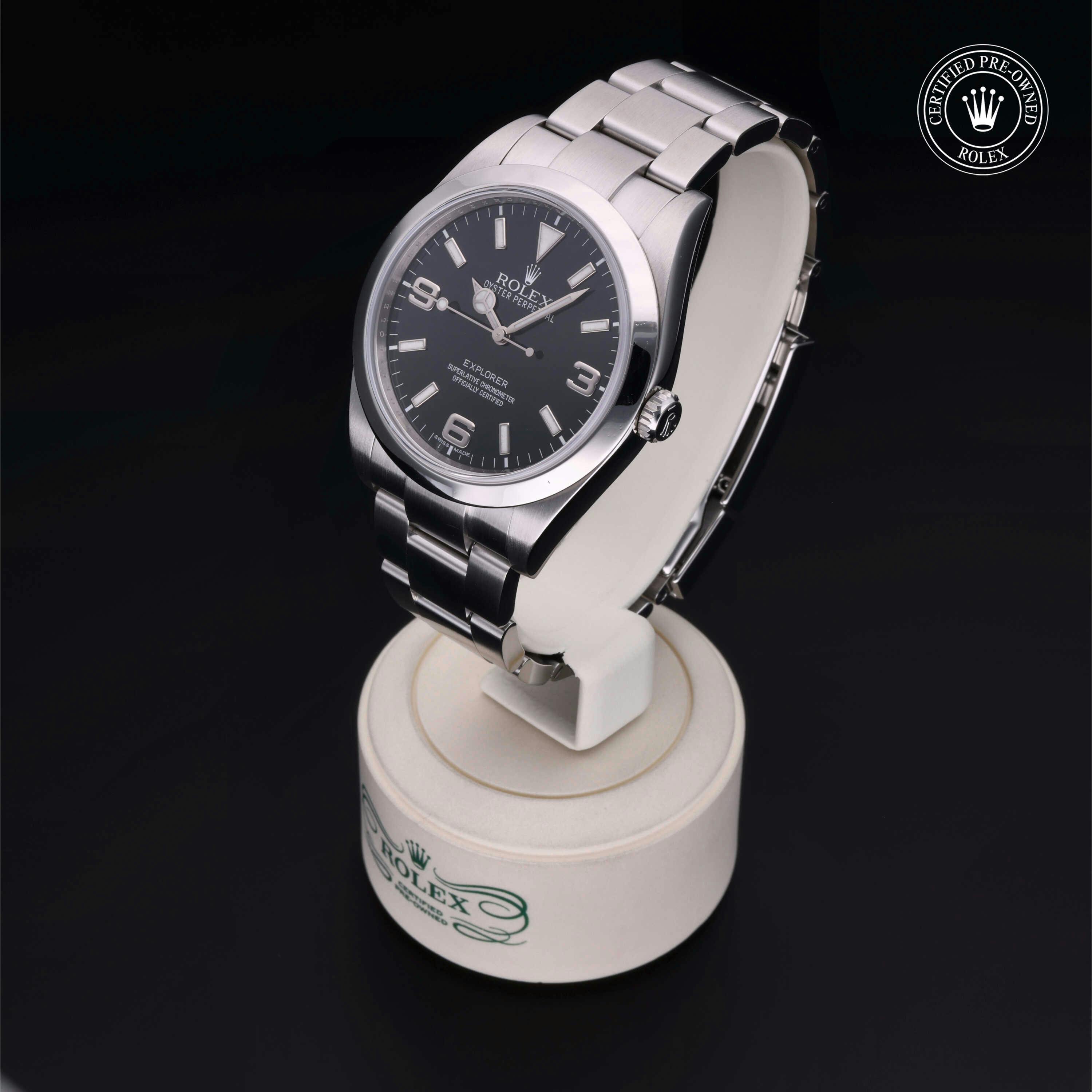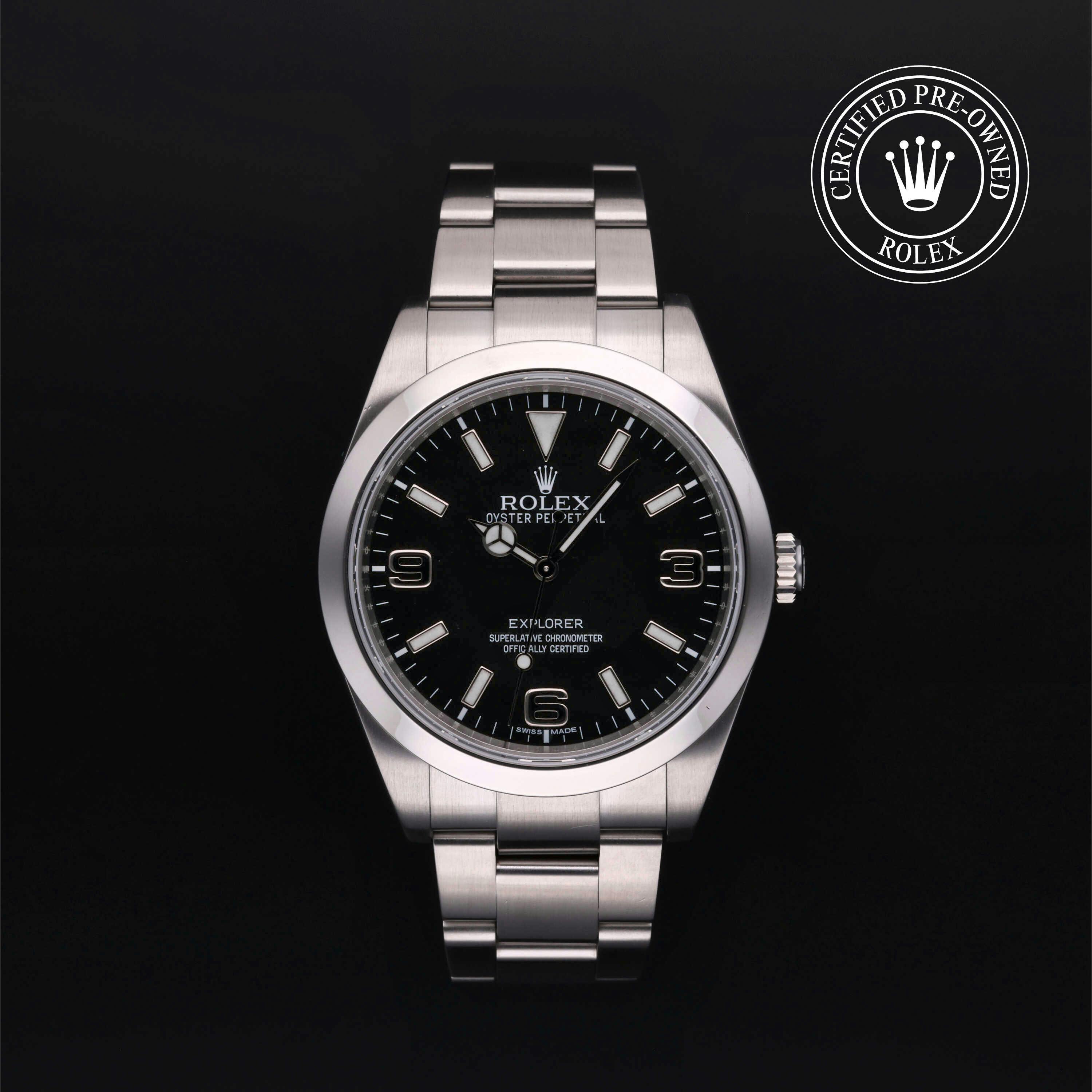Rolex Certified Pre-Owned Explorer (214270) self - winding automatic watch, features a 39mm stainless steel case and smooth bezel surrounding a black dial on a stainless steel oyster bracelet. Functions include hours, minutes and seconds. This watch has received Rolex-authorized service and certification. It comes with the original papers, and includes a custom Rolex Certified Pre-Owned hang tag, travel pouch and RCPO international warranty card.