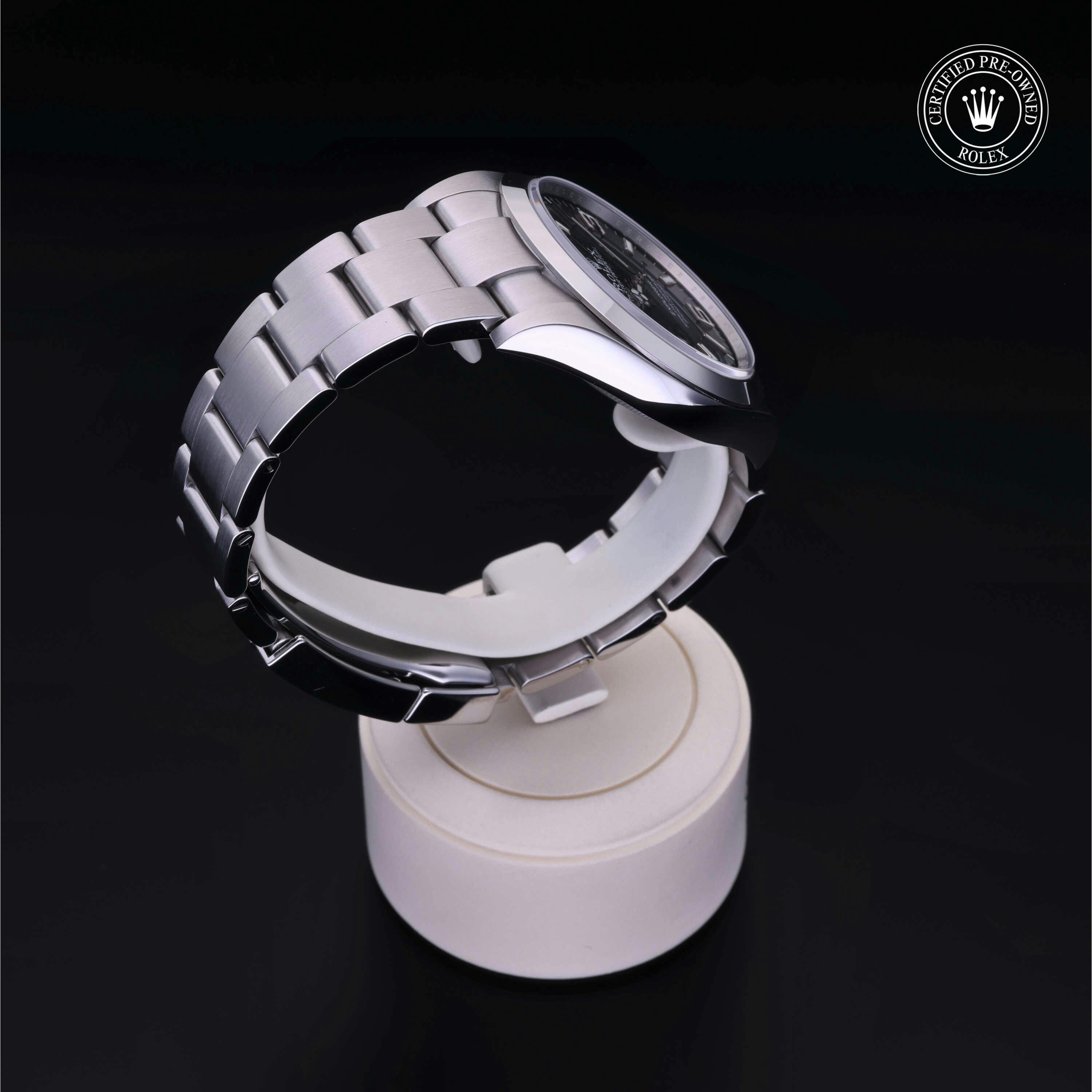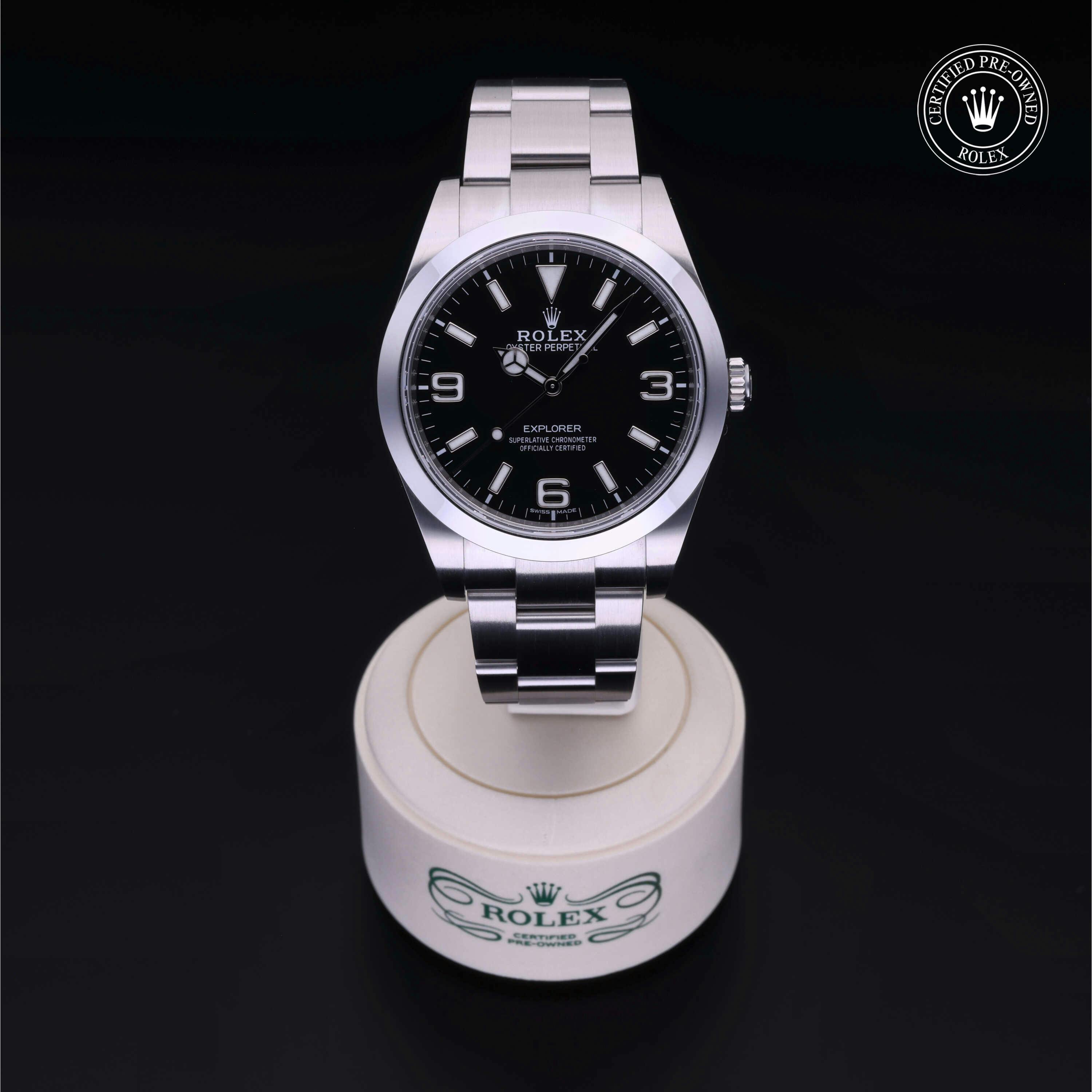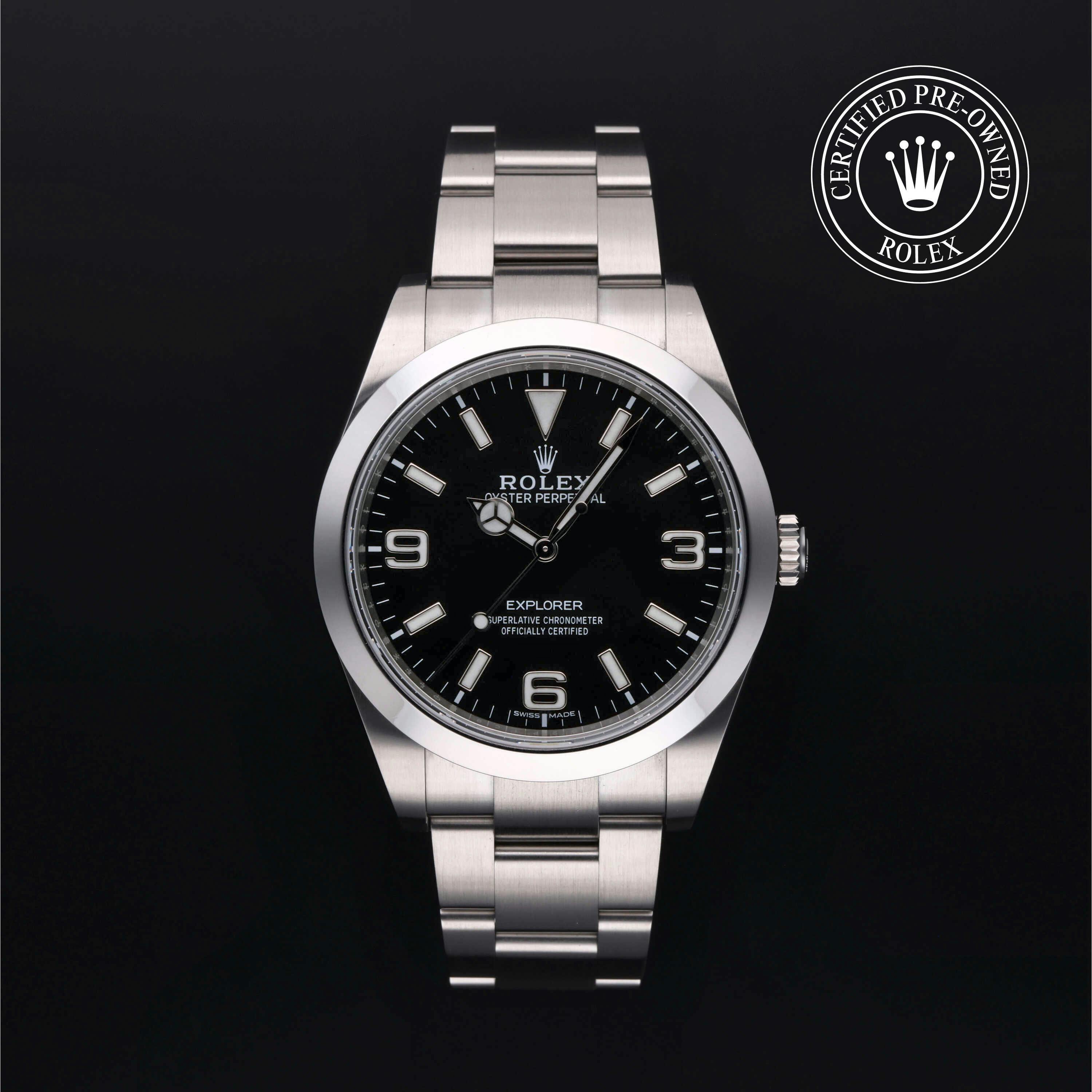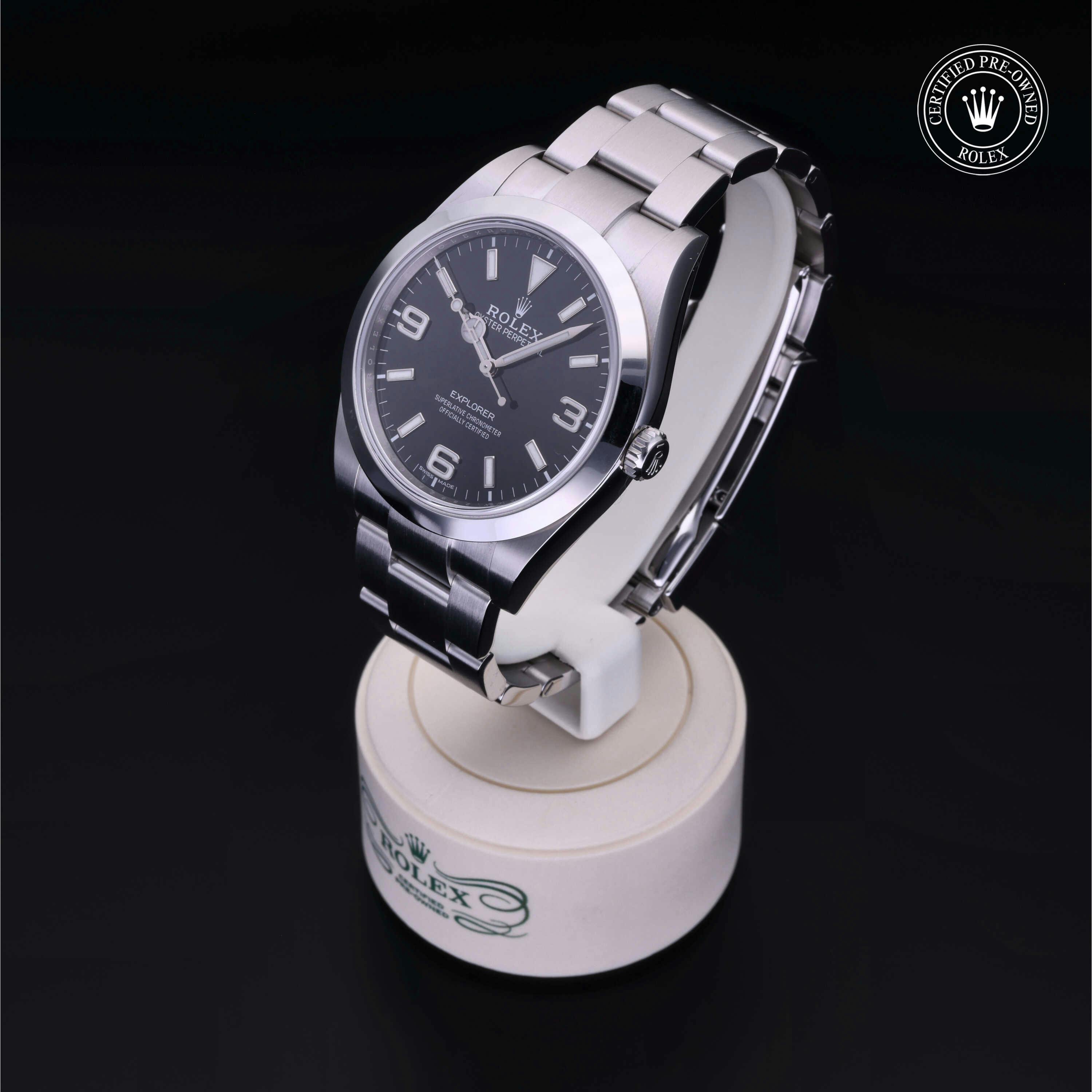 Rolex Certified Pre-Owned Explorer (214270) self - winding automatic watch, features a 39mm stainless steel case and smooth bezel surrounding a black dial on a stainless steel oyster bracelet. Functions include hours, minutes and seconds. This watch has received Rolex-authorized service and certification. It does not come with the original box or papers, but includes a custom Rolex Certified Pre-Owned hang tag, travel pouch and RCPO international warranty card.