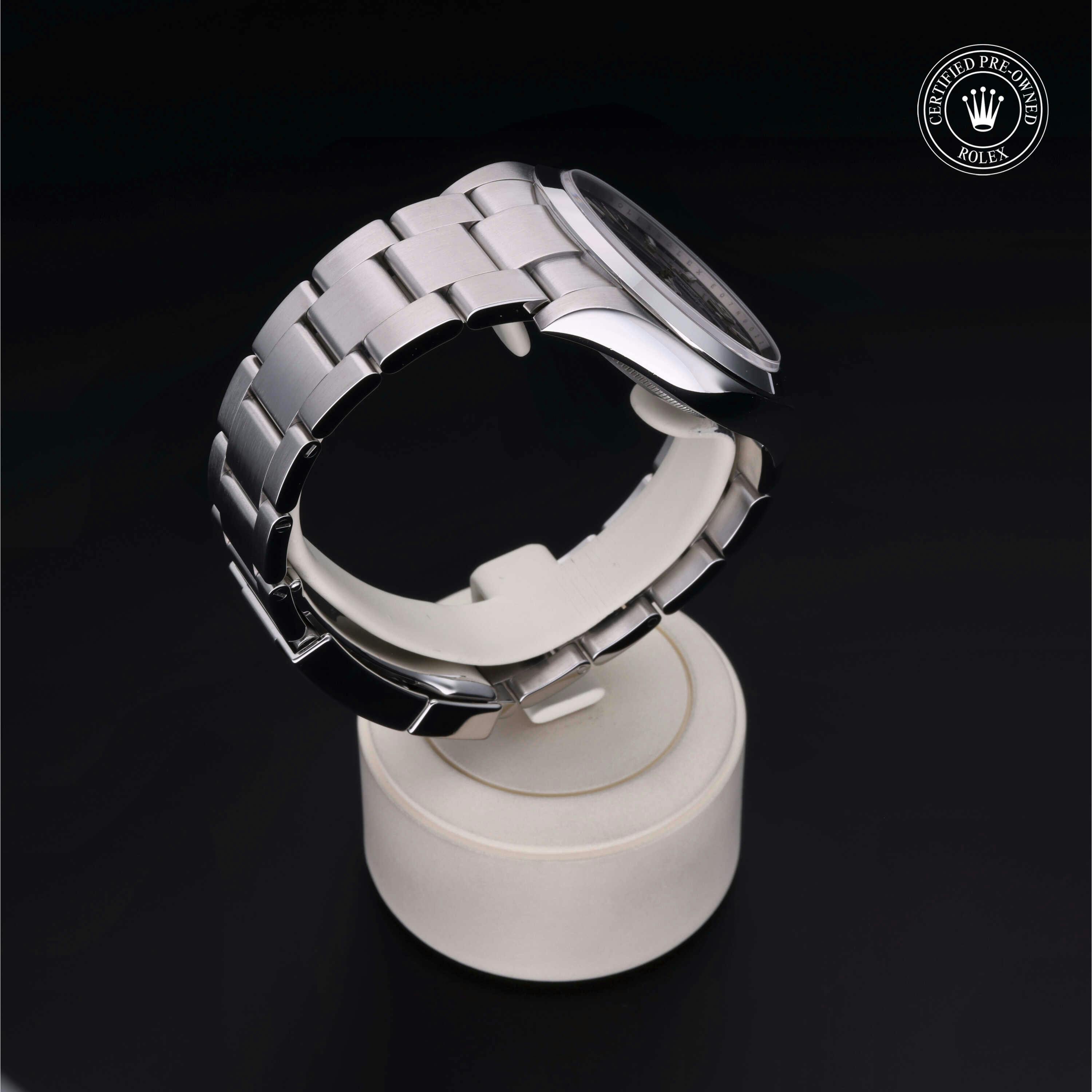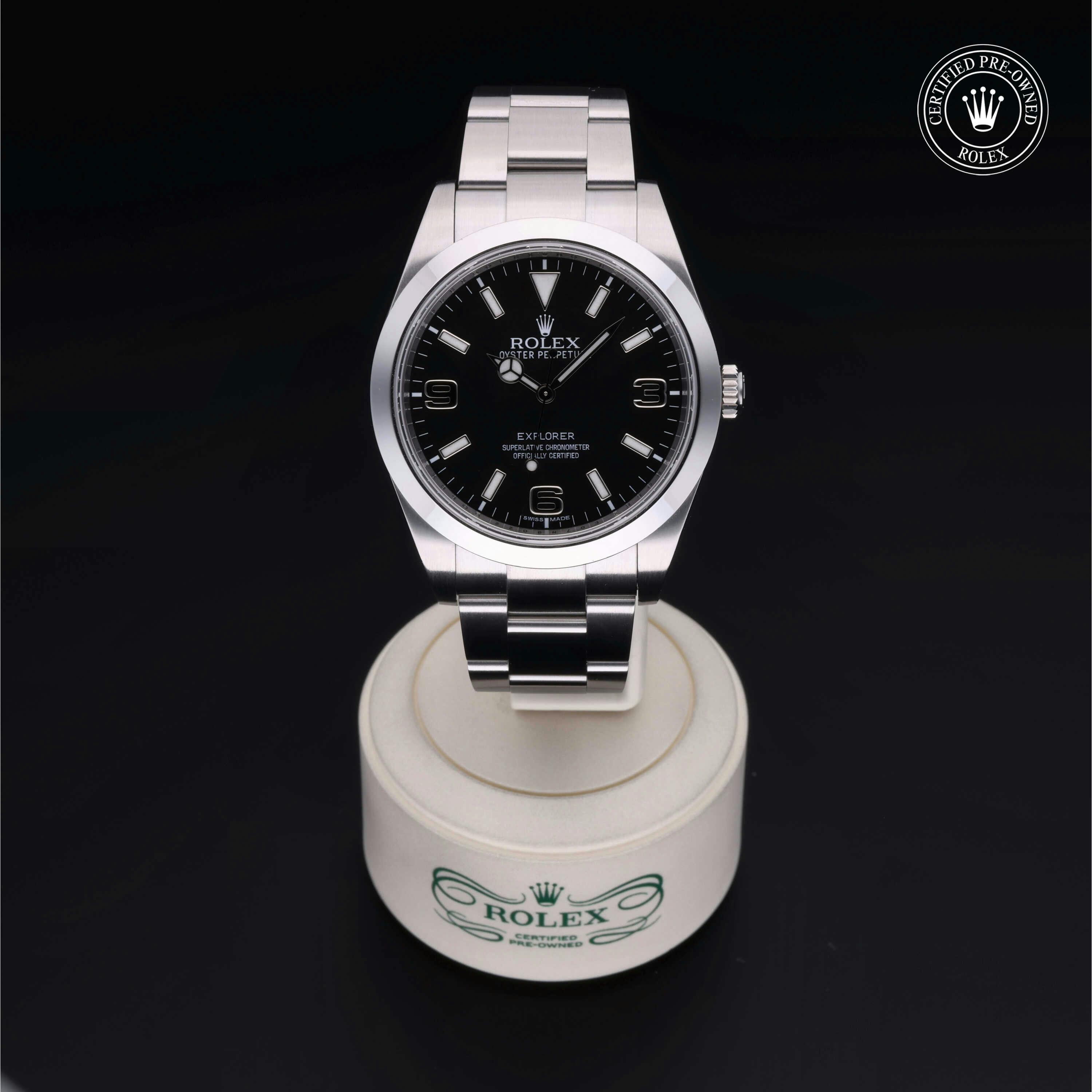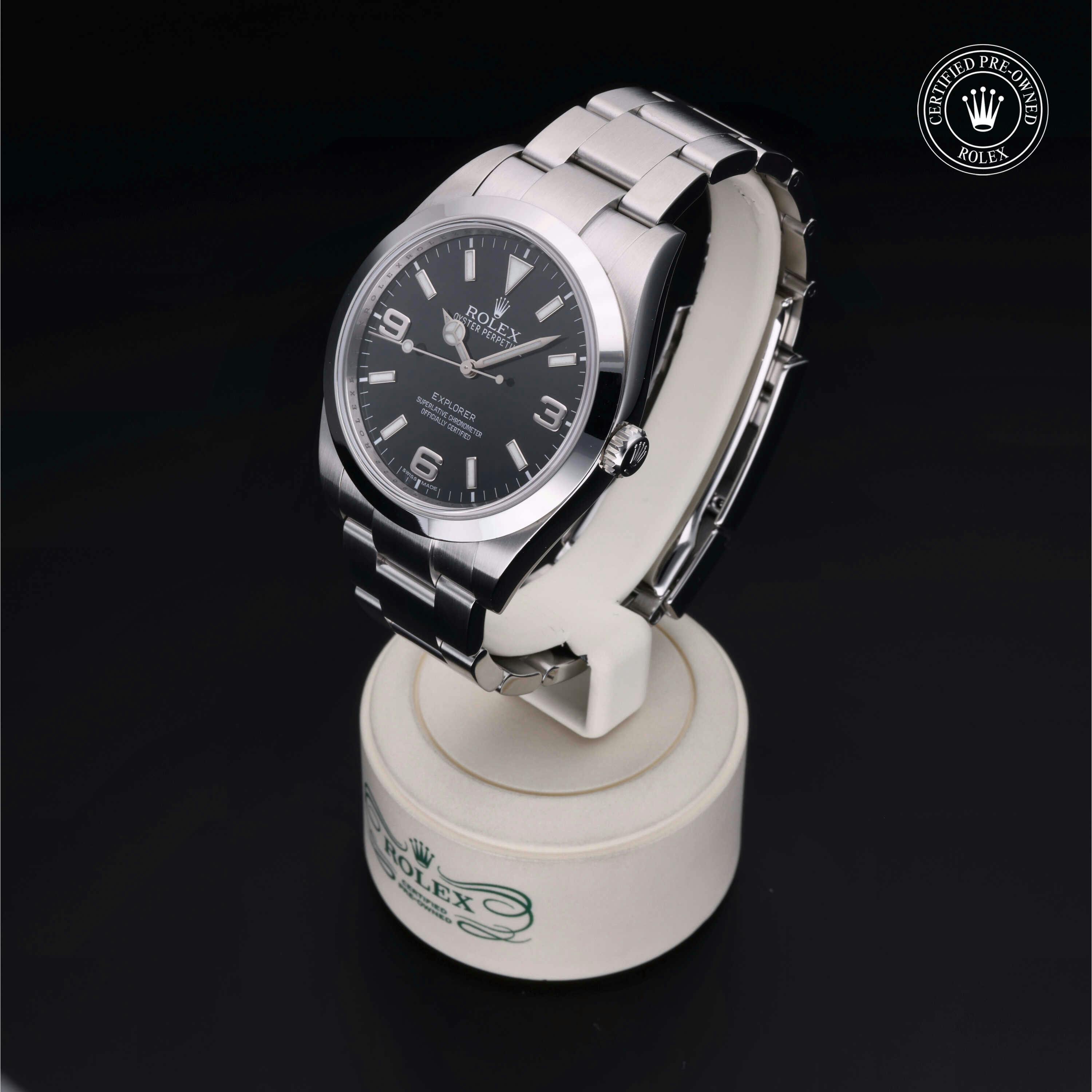 Rolex Certified Pre-Owned Explorer (214270) self - winding automatic watch, features a 39mm stainless steel case and smooth bezel surrounding a black dial on a stainless steel oyster bracelet. Functions include hours, minutes and seconds. This watch has received Rolex-authorized service and certification. It comes with the original papers, and includes a custom Rolex Certified Pre-Owned hang tag, travel pouch and RCPO international warranty card.