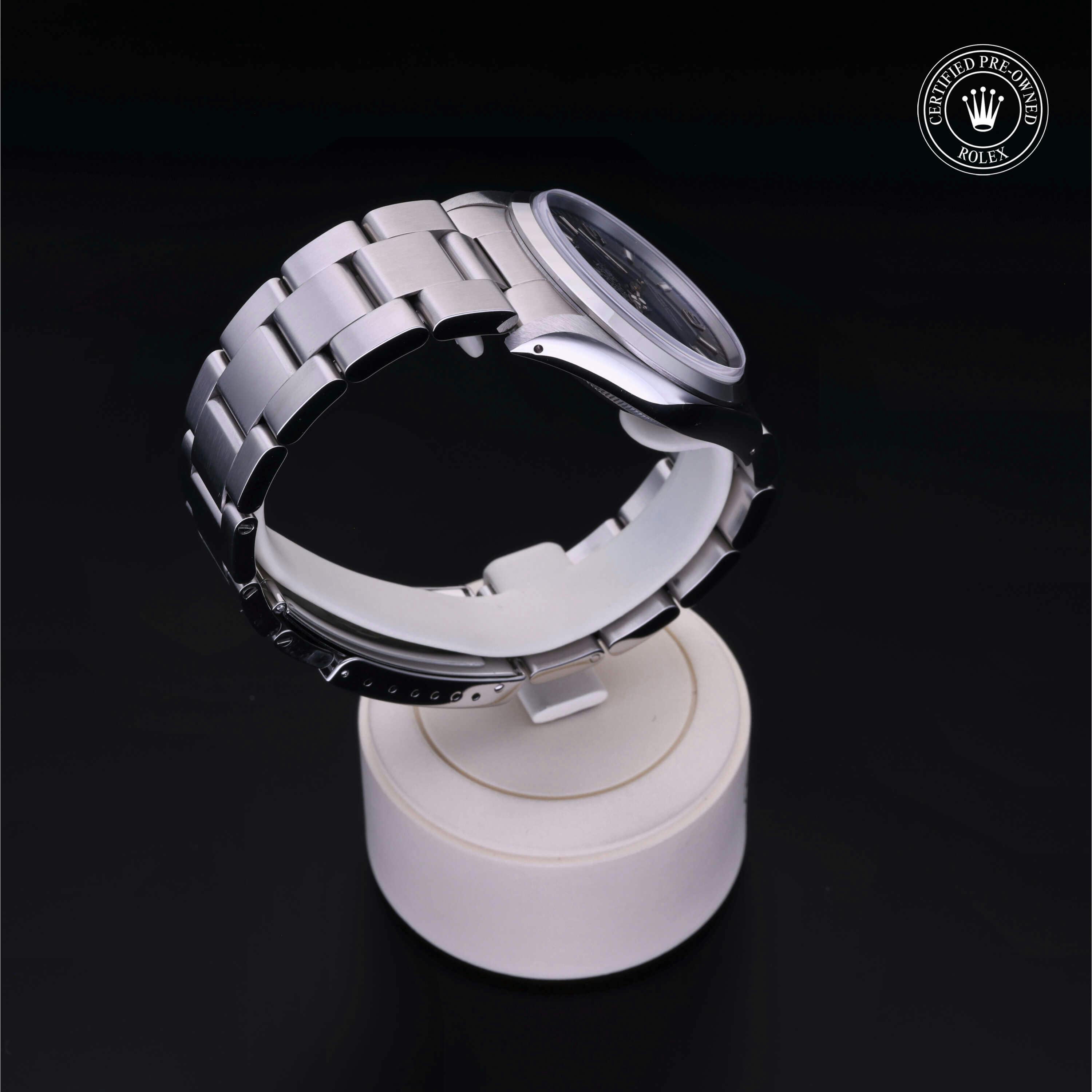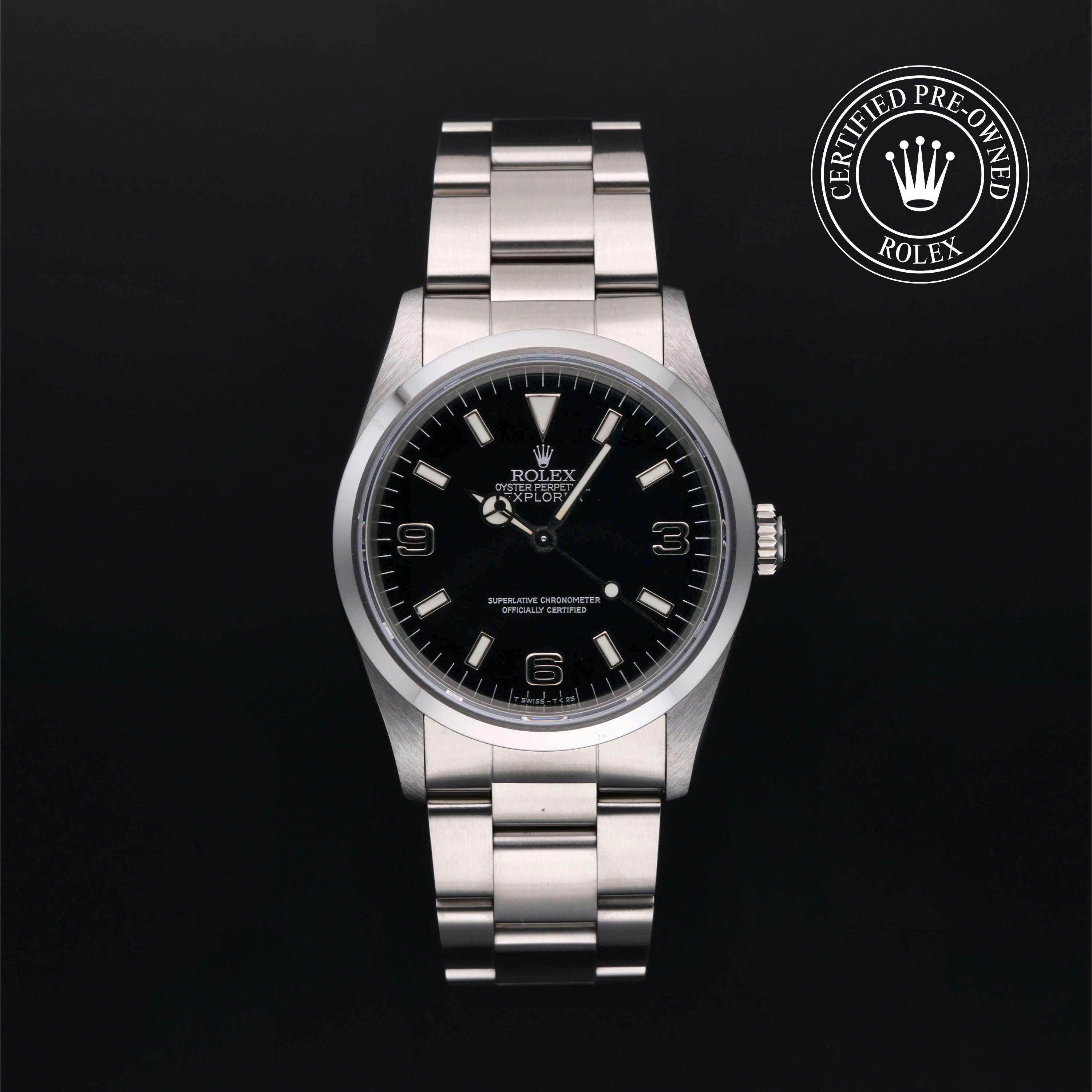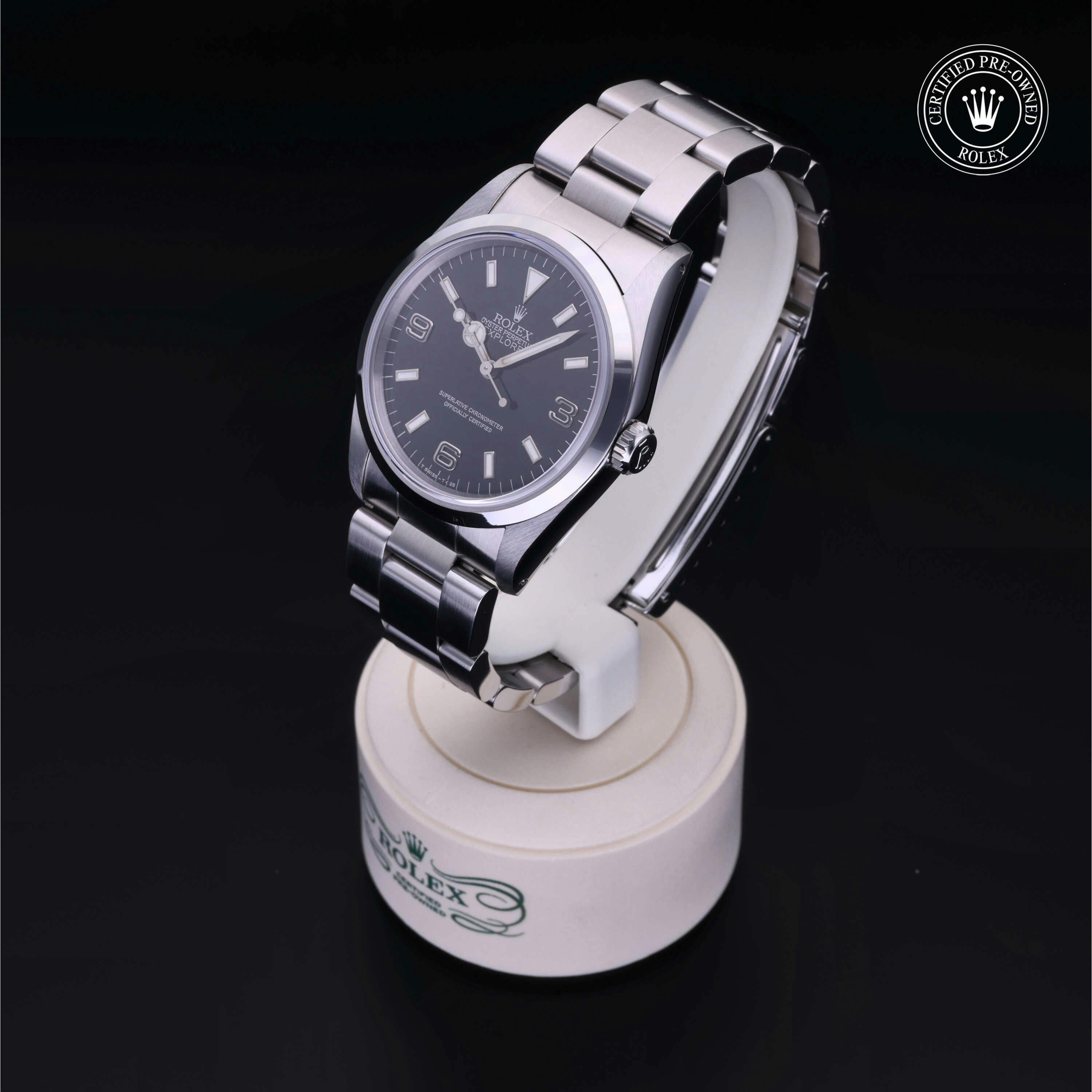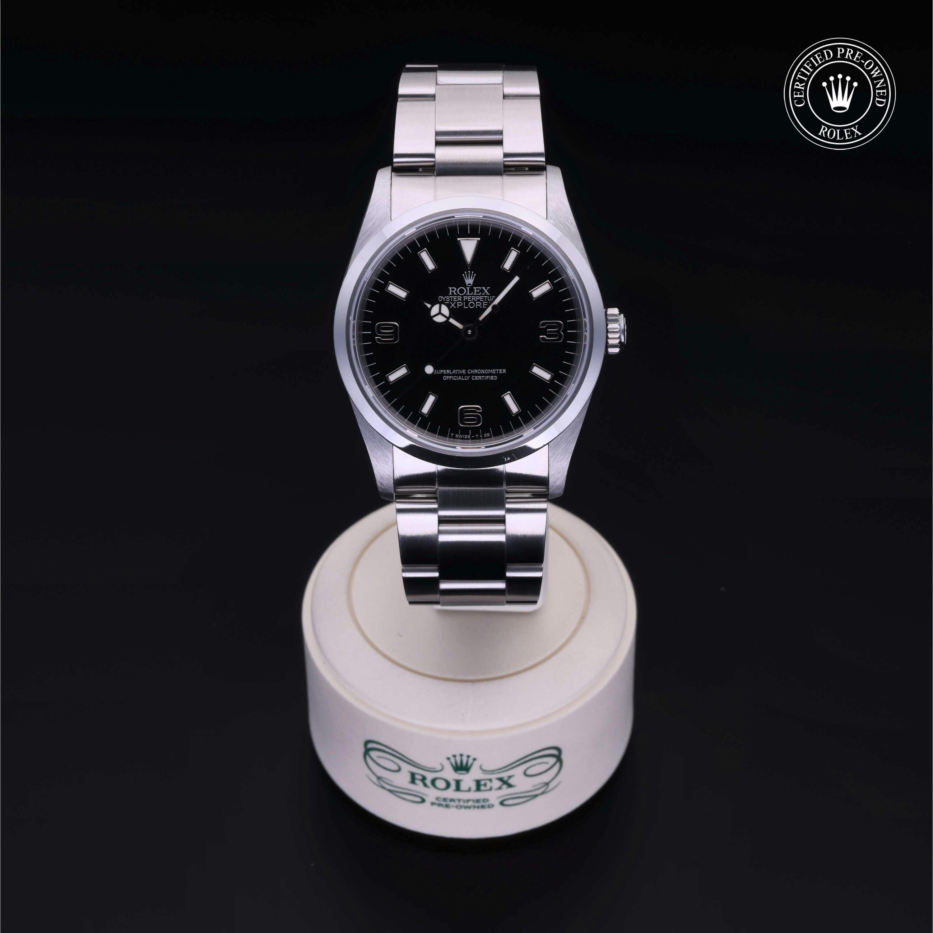Rolex Certified Pre-Owned Explorer (14270) self - winding automatic watch, features a 36mm stainless steel case and smooth bezel surrounding a black dial on a stainless steel oyster bracelet. Functions include hours, minutes and seconds. This watch has received Rolex-authorized service and certification. It does not come with the original box or papers, but includes a custom Rolex Certified Pre-Owned hang tag, travel pouch and RCPO international warranty card.