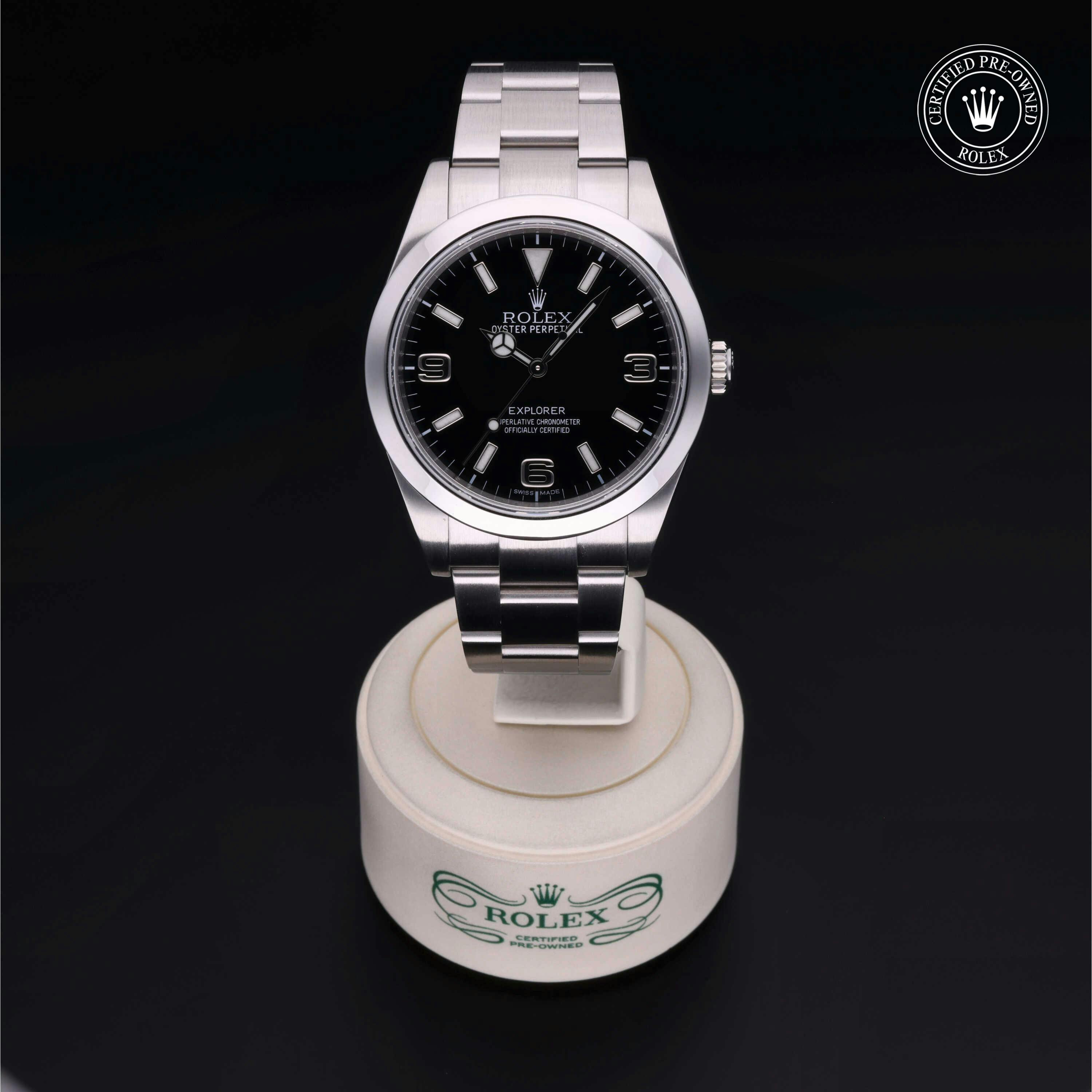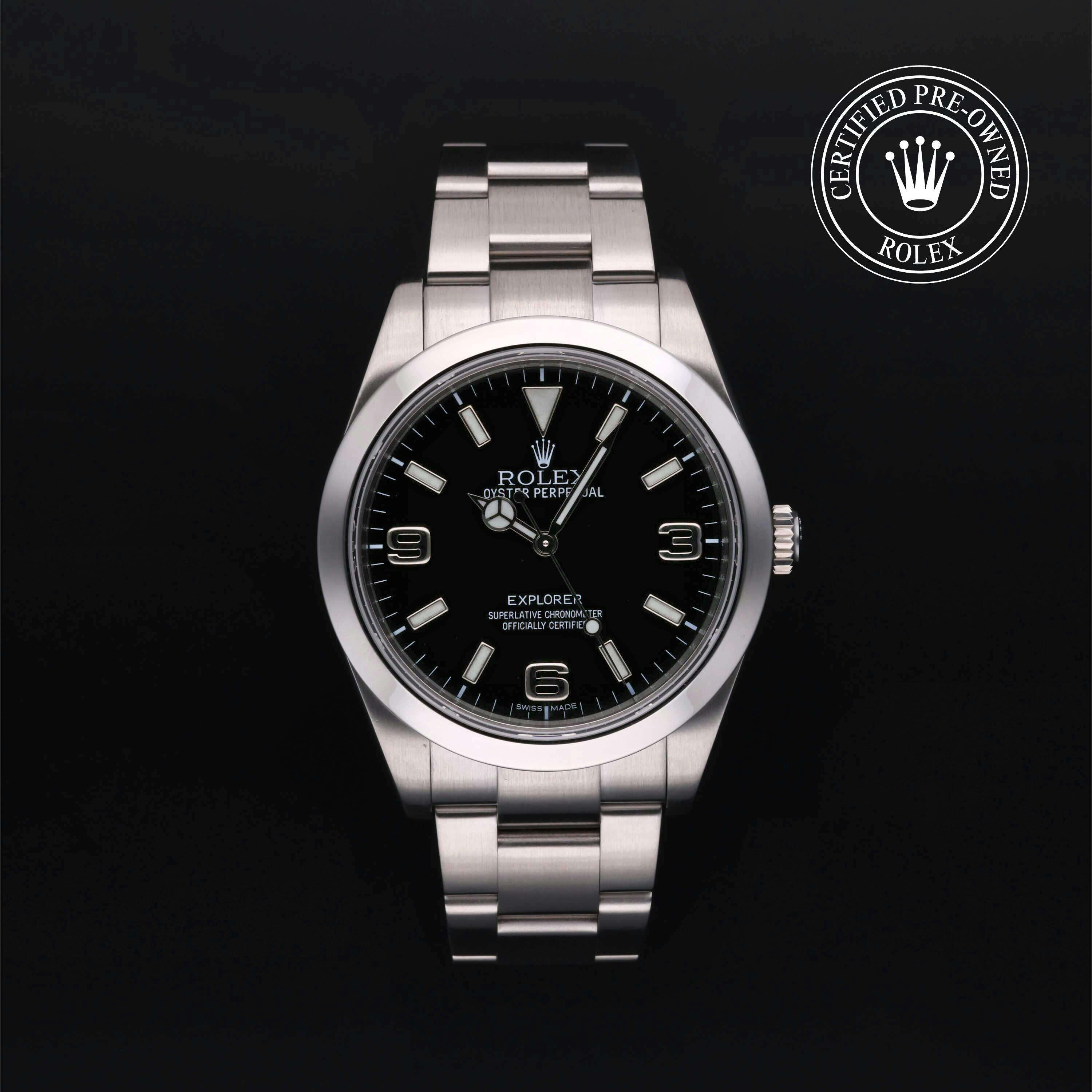 Rolex Certified Pre-Owned Explorer (214270) self - winding automatic watch, features a 39mm stainless steel case and smooth bezel surrounding a black dial on a stainless steel oyster bracelet. Functions include hours, minutes and seconds. This watch has received Rolex-authorized service and certification. It does not come with the original box or papers, but includes a custom Rolex Certified Pre-Owned hang tag, travel pouch and RCPO international warranty card.