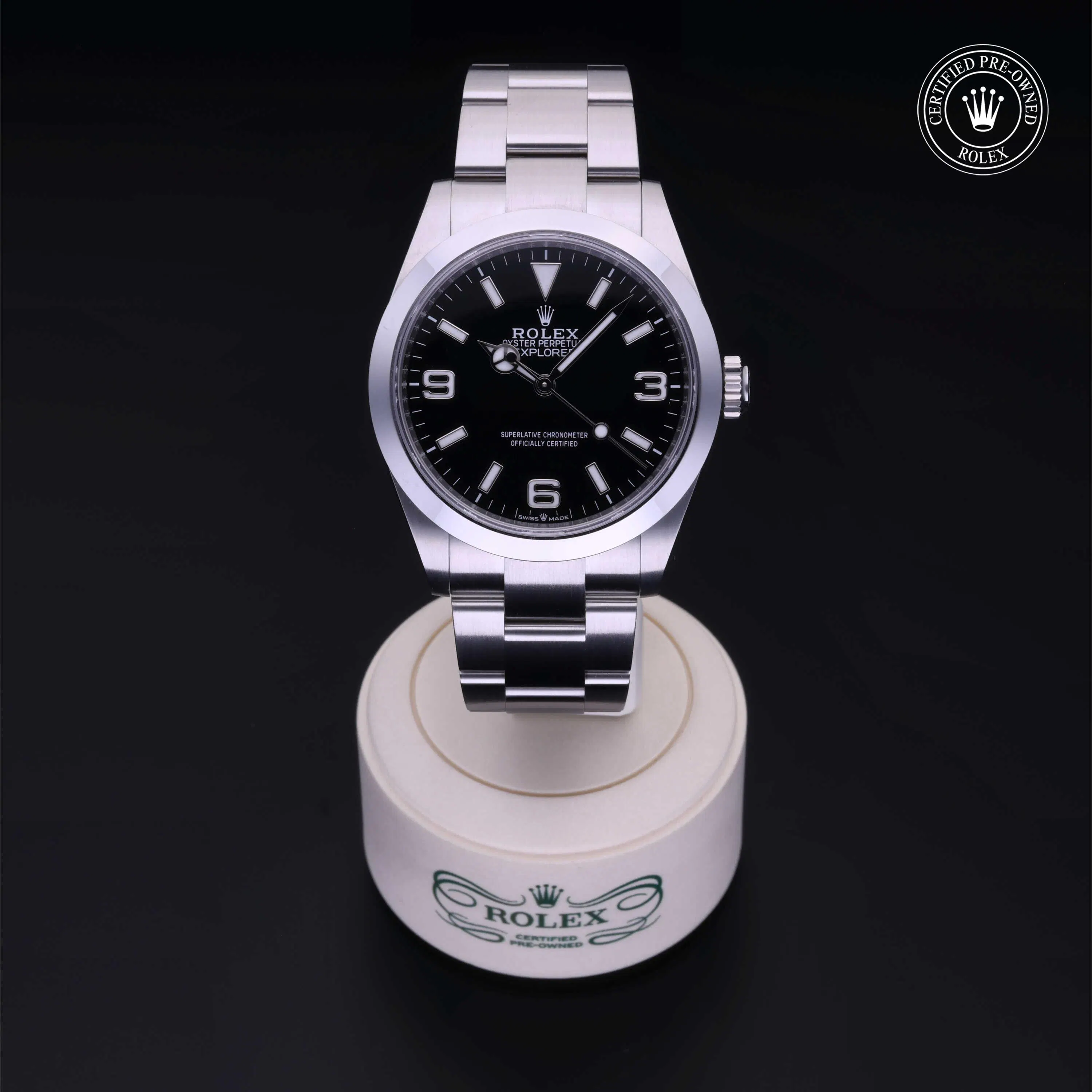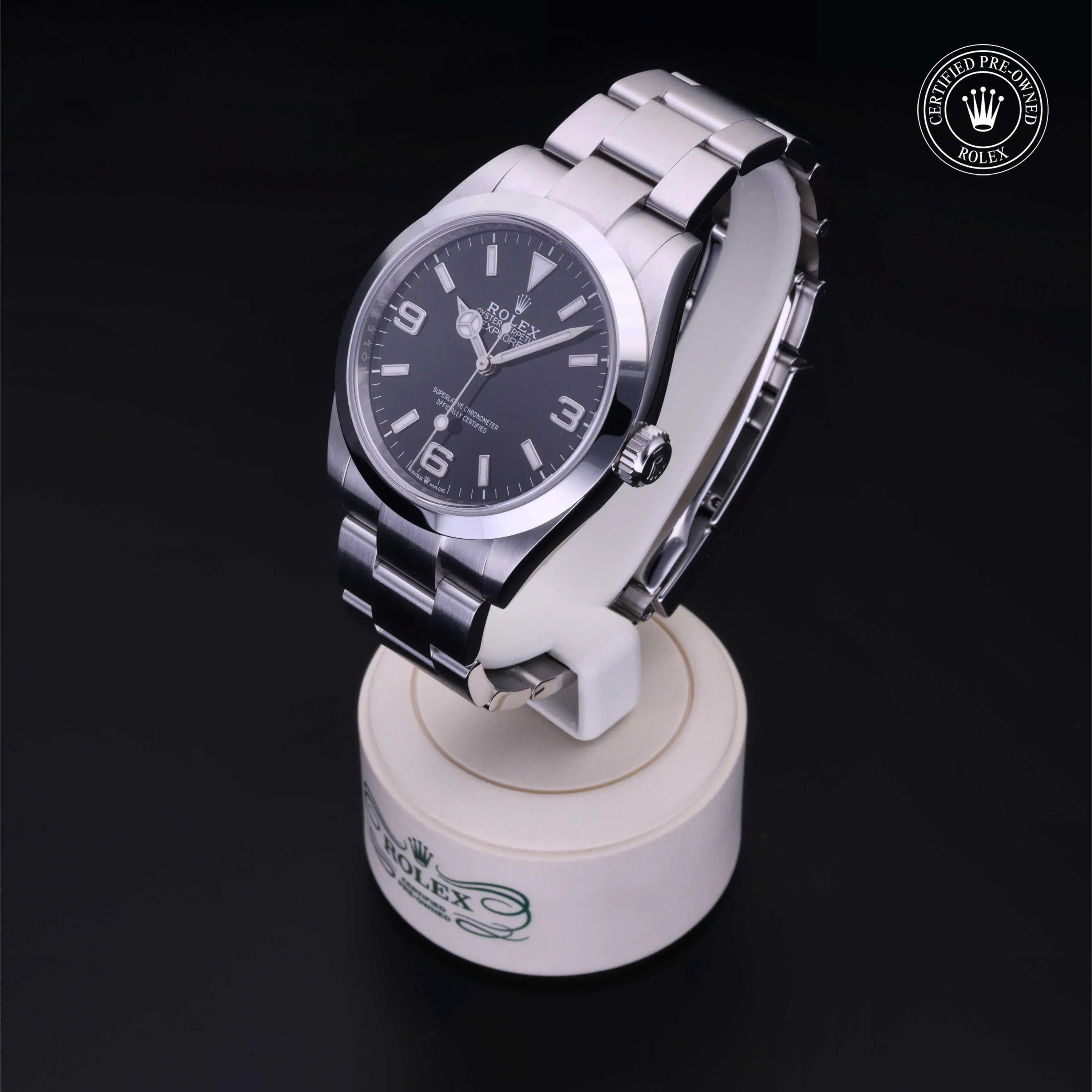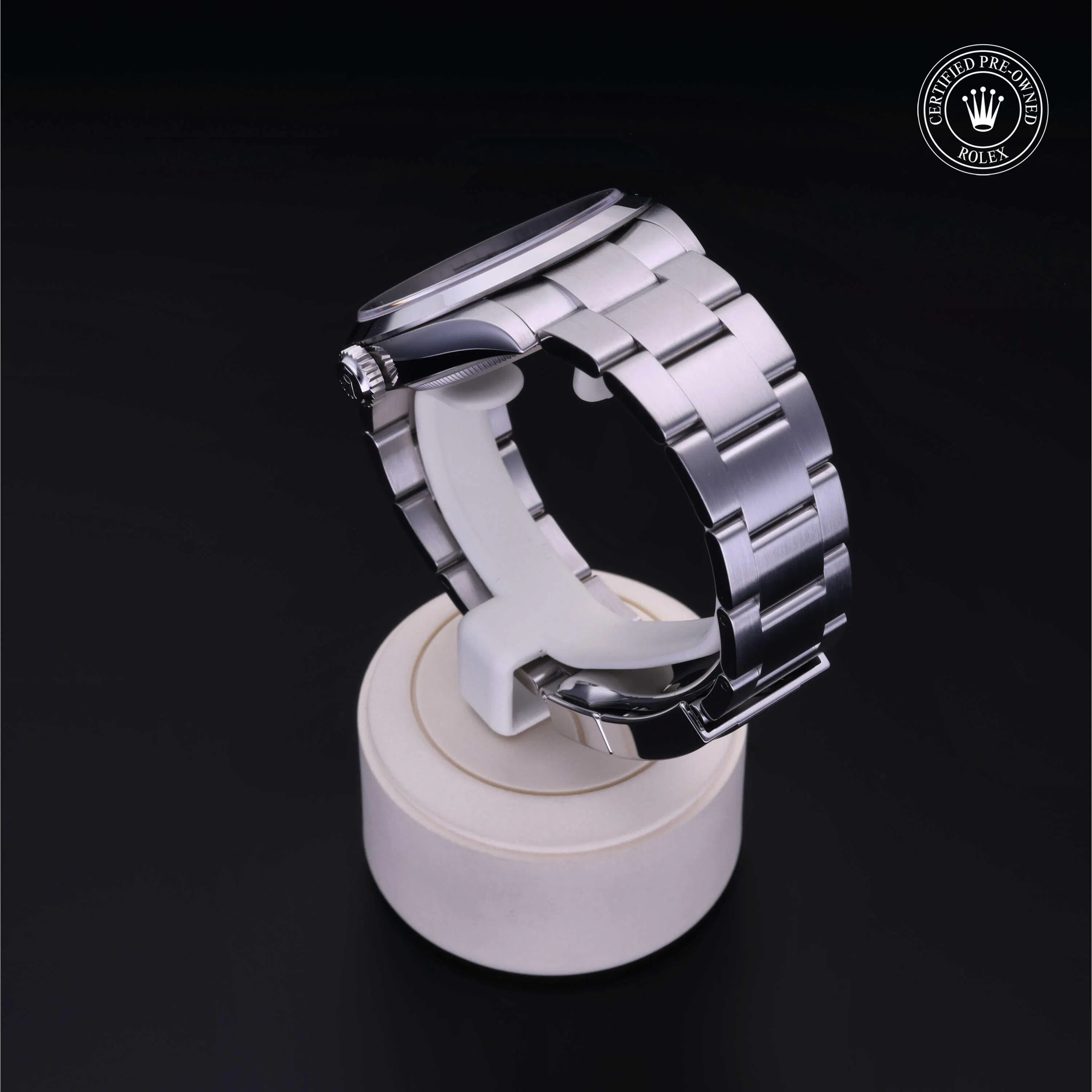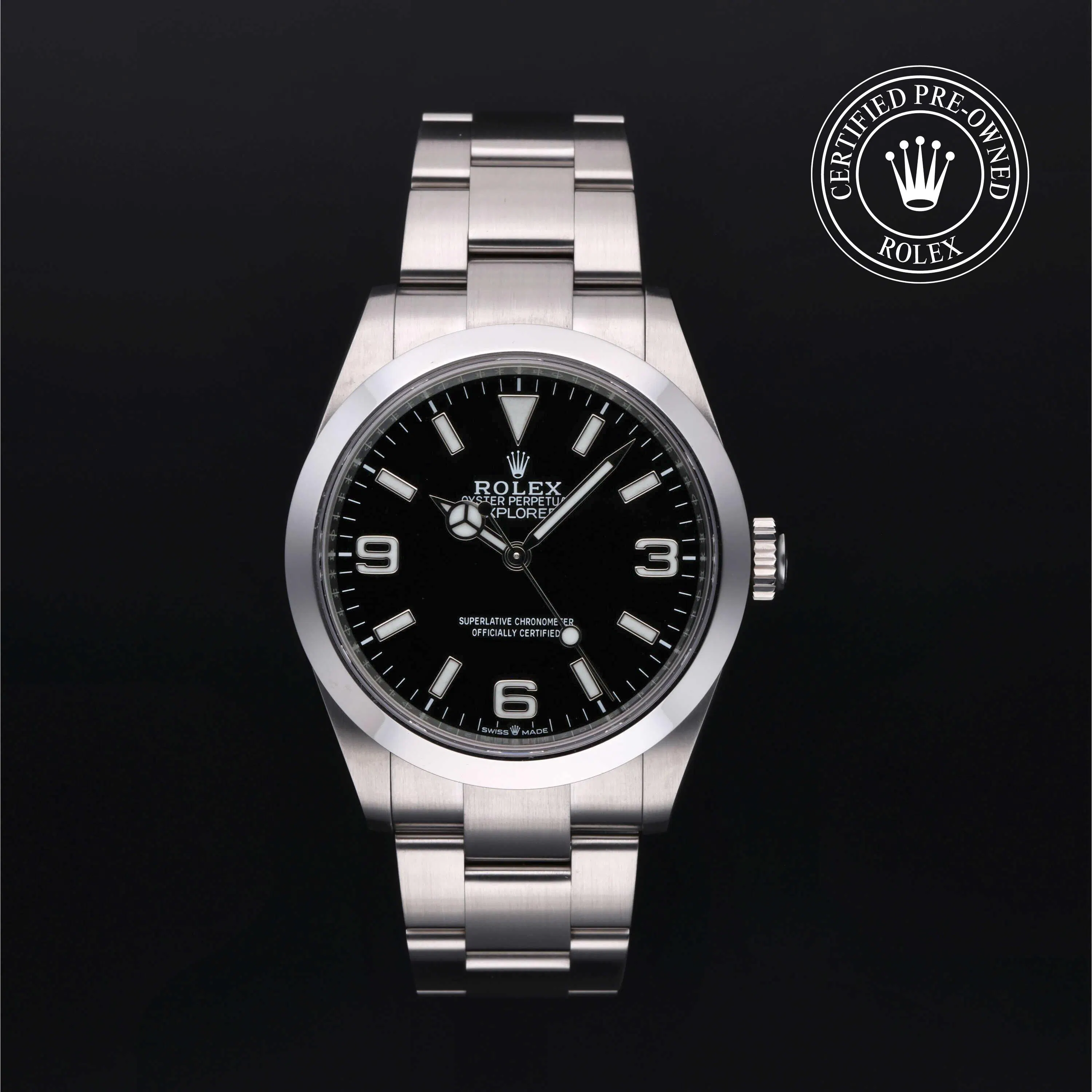 Rolex Certified Pre-Owned Explorer (224270) self - winding automatic watch, features a 40mm stainless steel case and smooth bezel surrounding a black dial on a stainless steel oyster bracelet. Functions include hours, minutes and seconds. This watch has received Rolex-authorized service and certification. It comes with the original box and papers, and includes a custom Rolex Certified Pre-Owned hang tag, travel pouch and RCPO international warranty card.