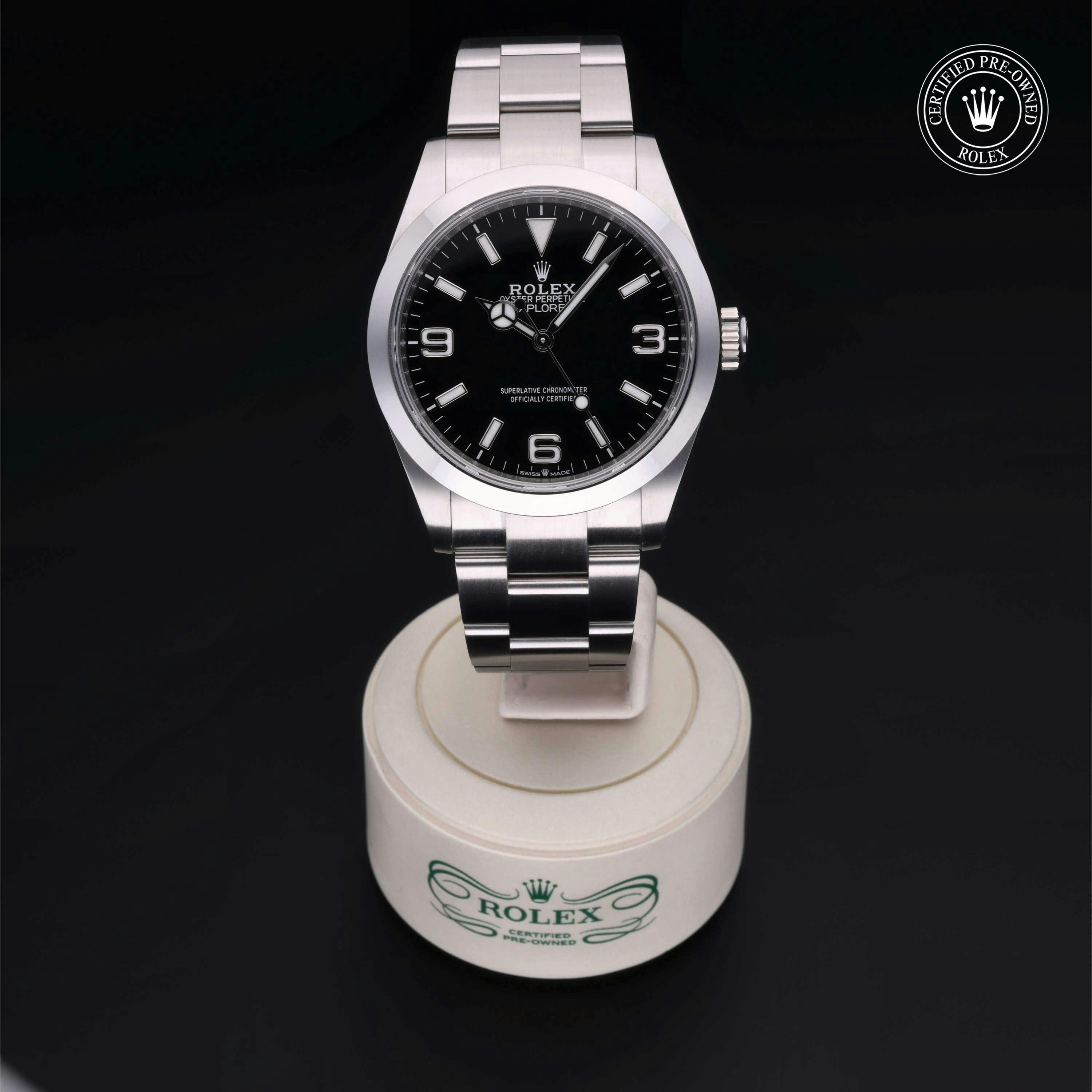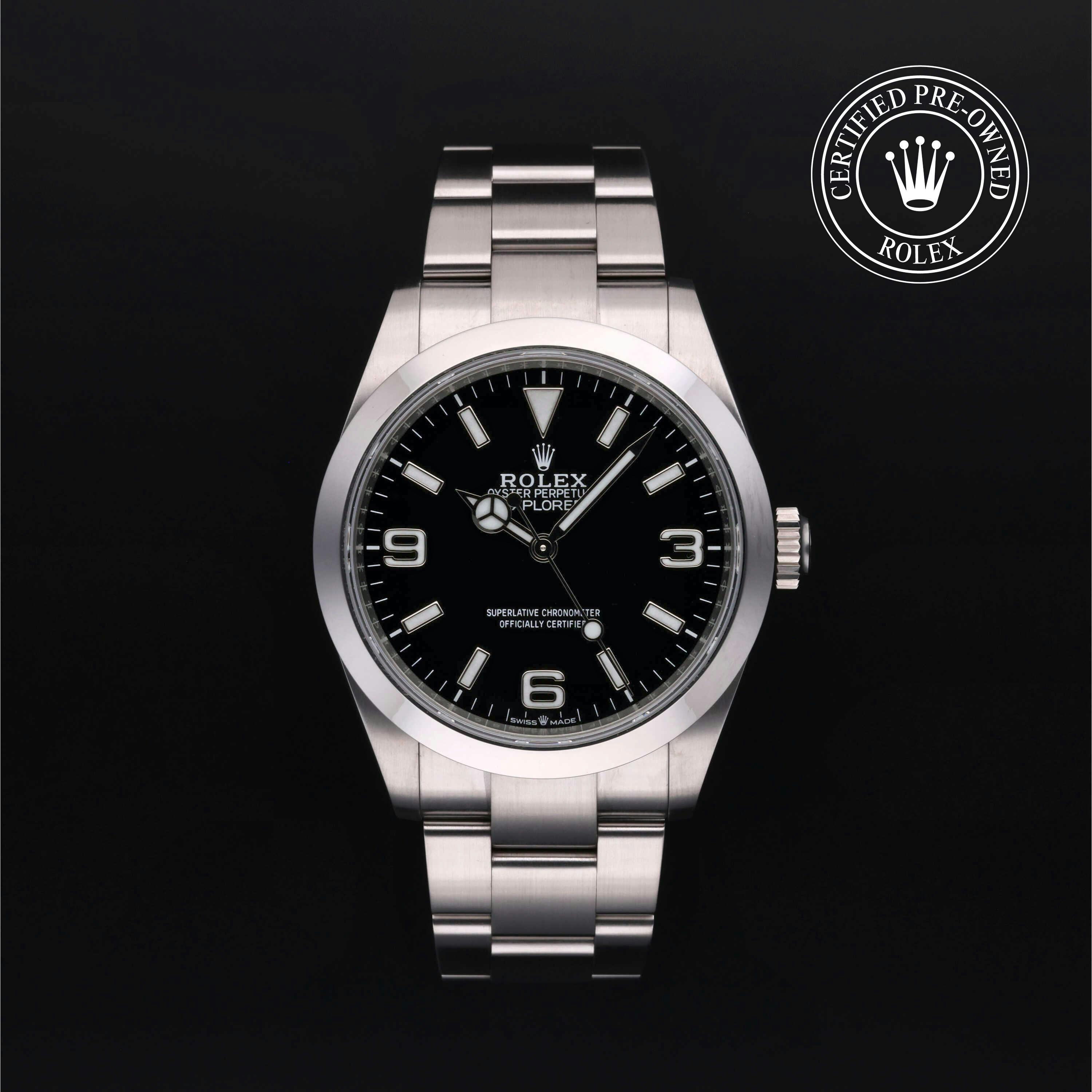 Rolex Certified Pre-Owned Explorer (224270) self - winding automatic watch, features a 40mm stainless steel case and smooth bezel surrounding a black dial on a stainless steel oyster bracelet. Functions include hours, minutes and seconds. This watch has received Rolex-authorized service and certification. It comes with the original box and papers, and includes a custom Rolex Certified Pre-Owned hang tag, travel pouch and RCPO international warranty card.