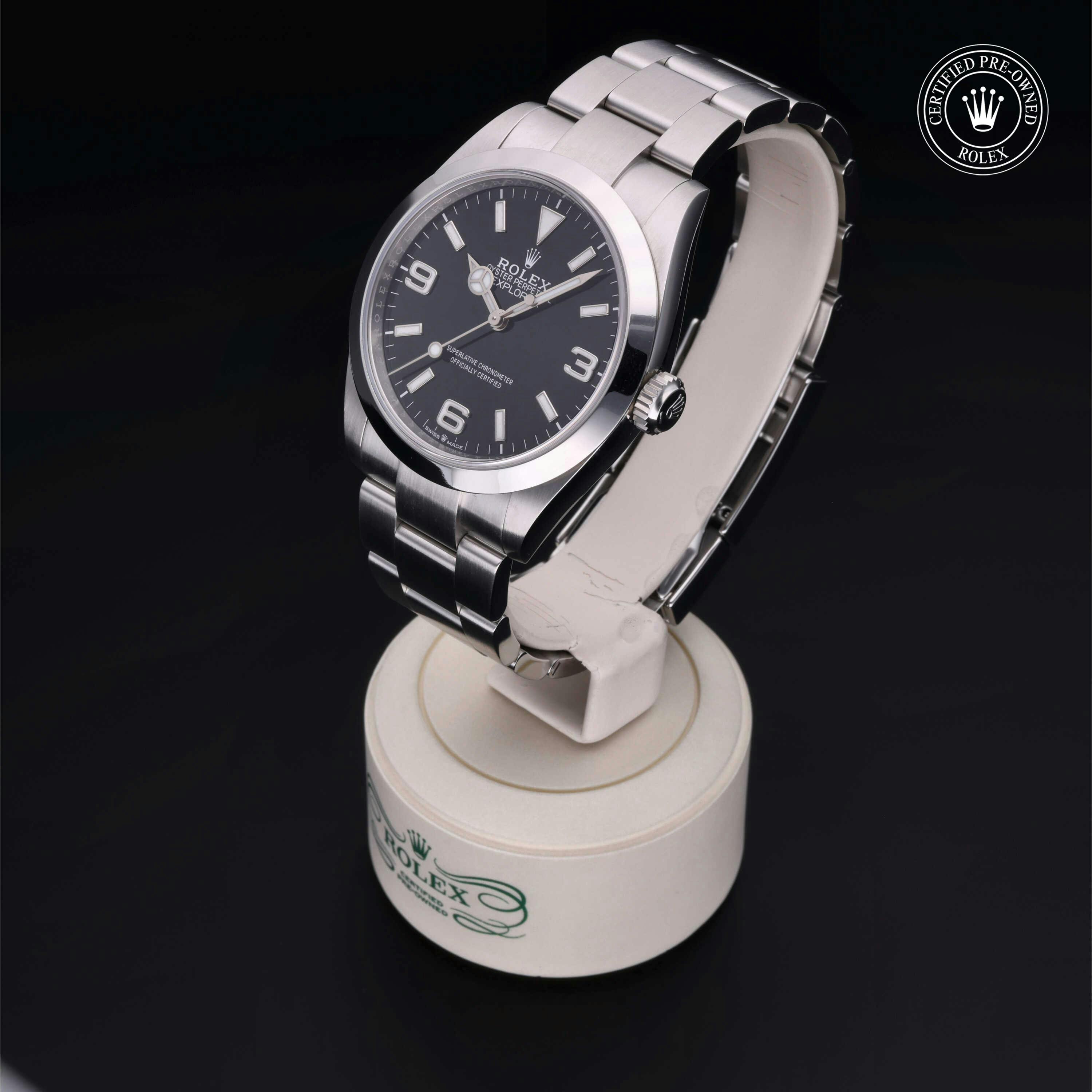 Rolex Certified Pre-Owned Explorer (224270) self - winding automatic watch, features a 40mm stainless steel case and smooth bezel surrounding a black dial on a stainless steel oyster bracelet. Functions include hours, minutes and seconds. This watch has received Rolex-authorized service and certification. It comes with the original box and papers, and includes a custom Rolex Certified Pre-Owned hang tag, travel pouch and RCPO international warranty card.
