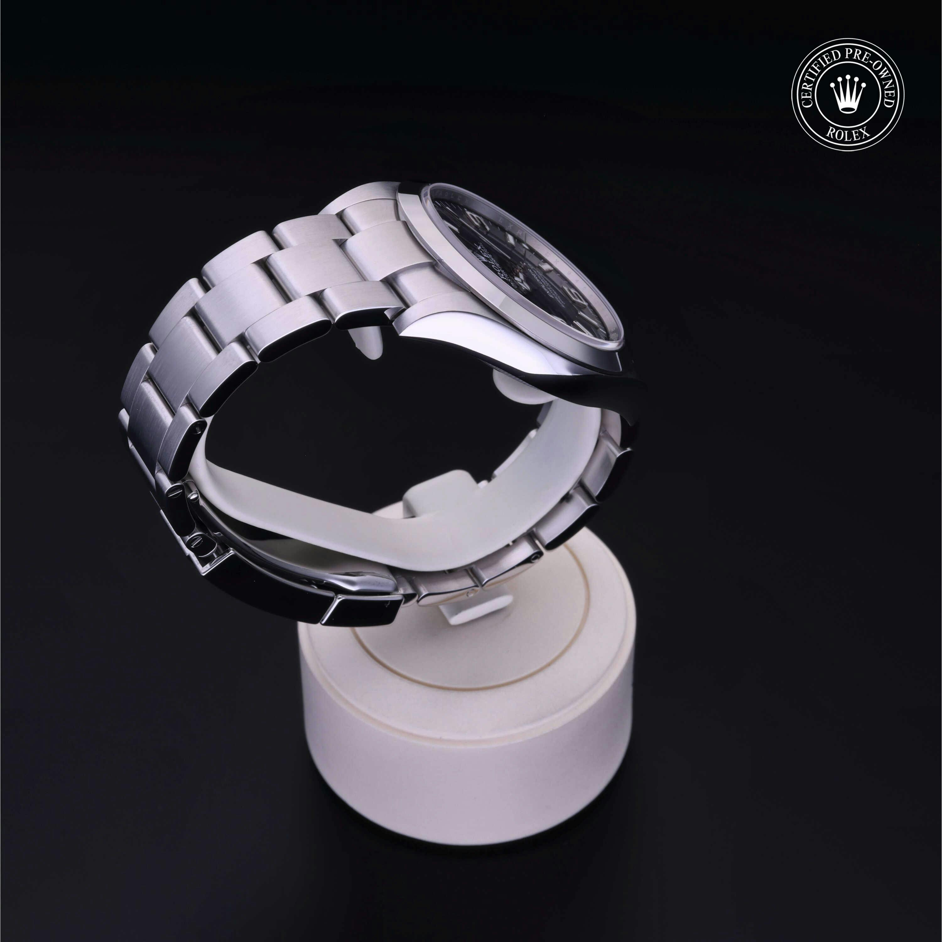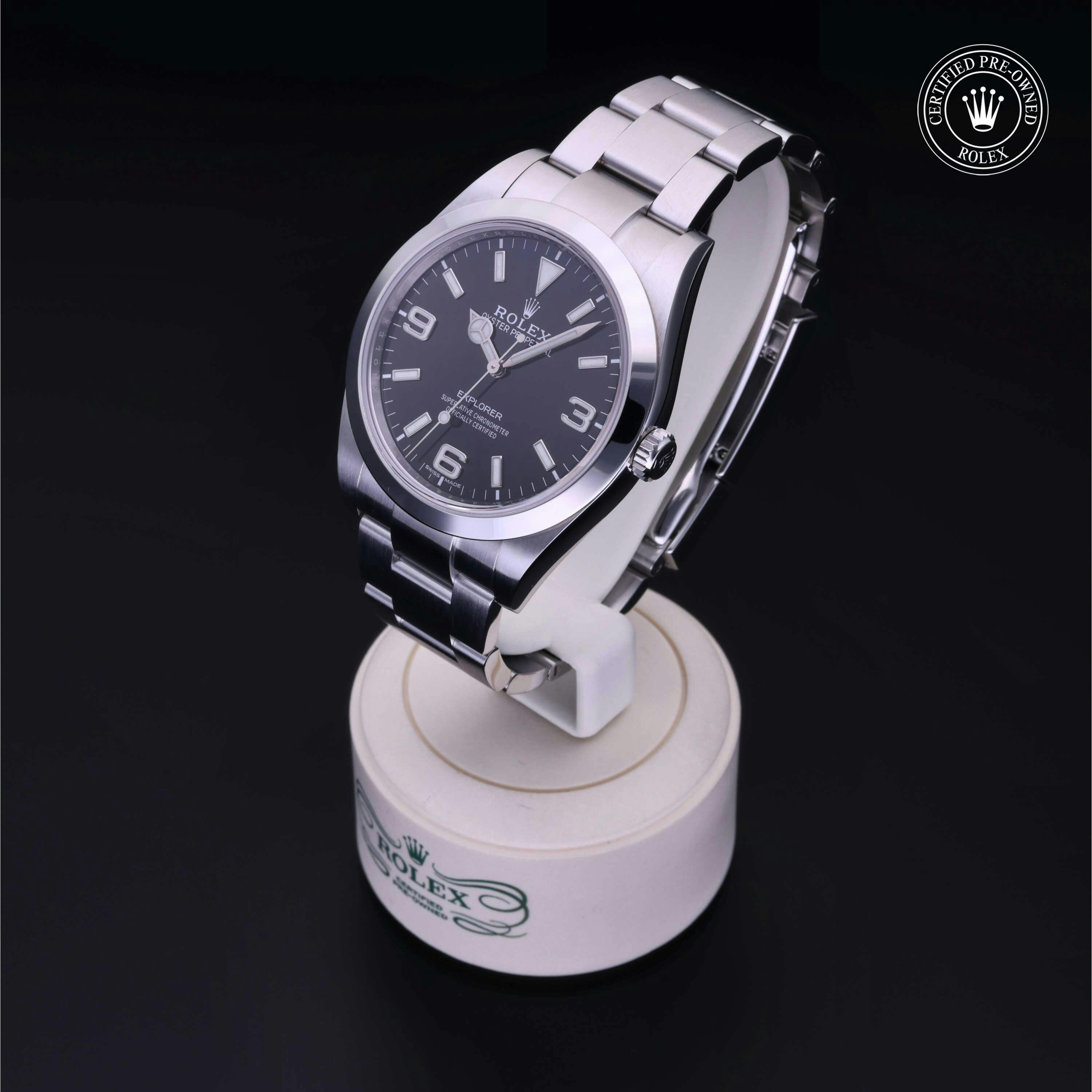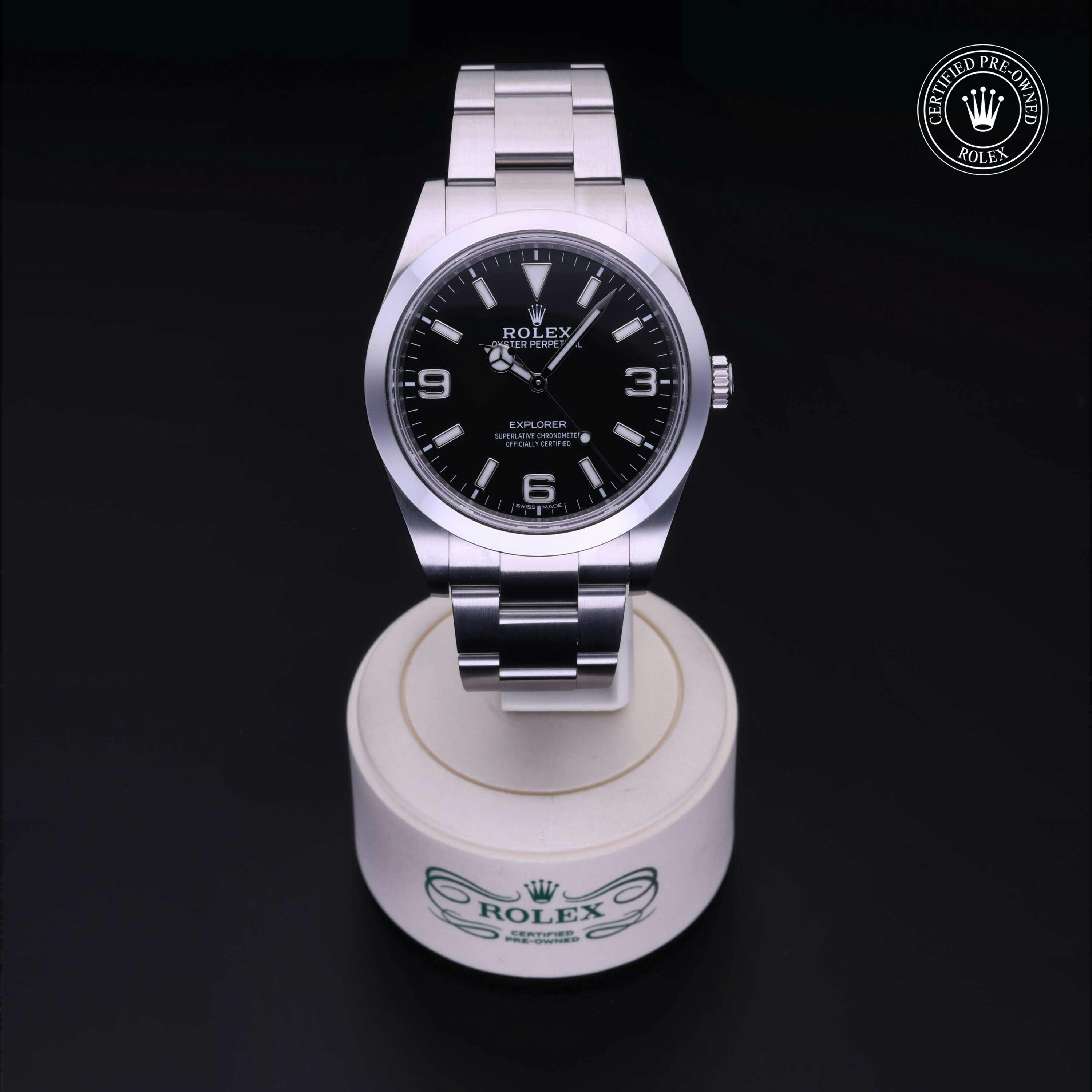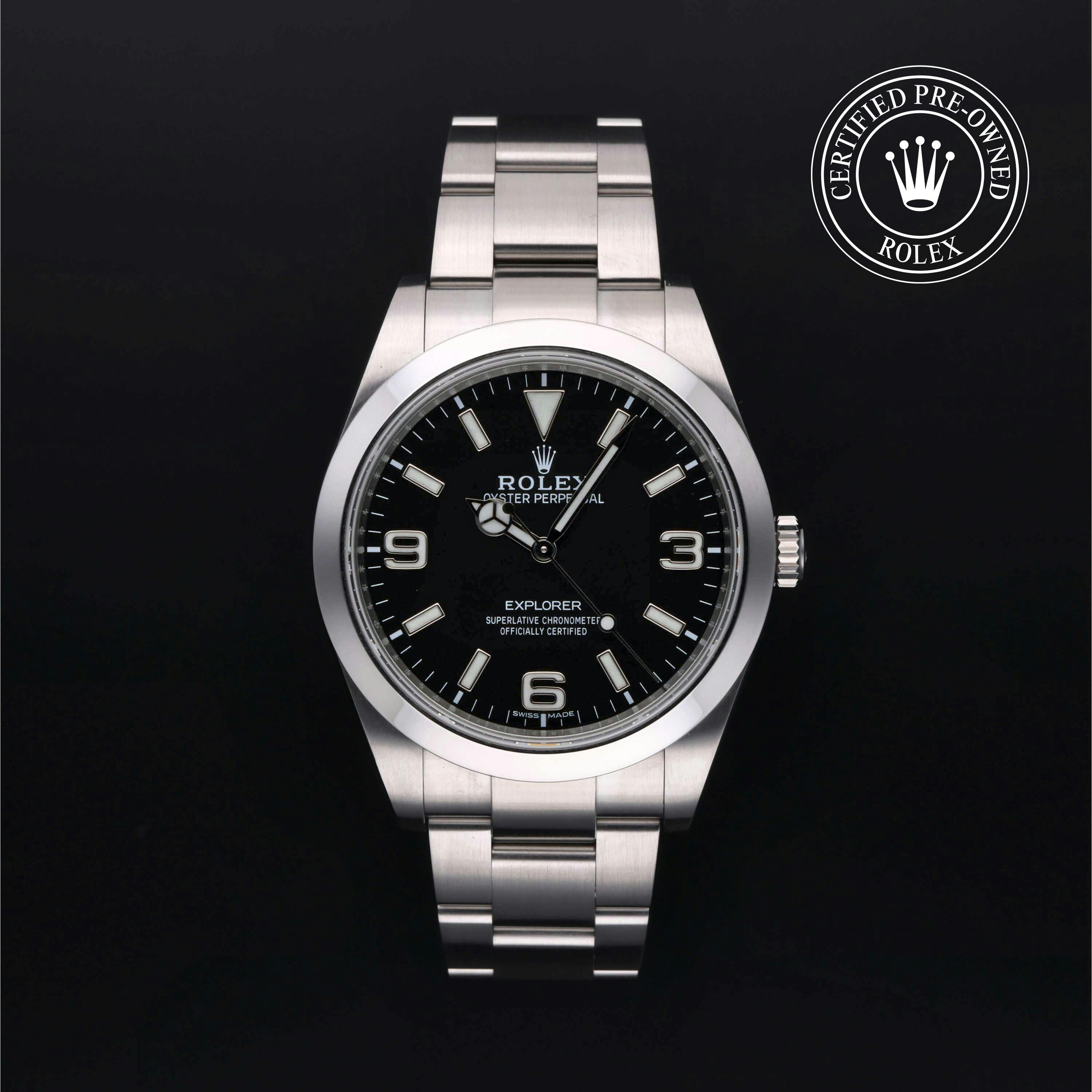 Rolex Certified Pre-Owned Explorer (214270) self - winding automatic watch, features a 39mm stainless steel case and smooth bezel surrounding a black dial on a stainless steel oyster bracelet. Functions include hours, minutes and seconds. This watch has received Rolex-authorized service and certification. It comes with the original box and papers, and includes a custom Rolex Certified Pre-Owned hang tag, travel pouch and RCPO international warranty card.