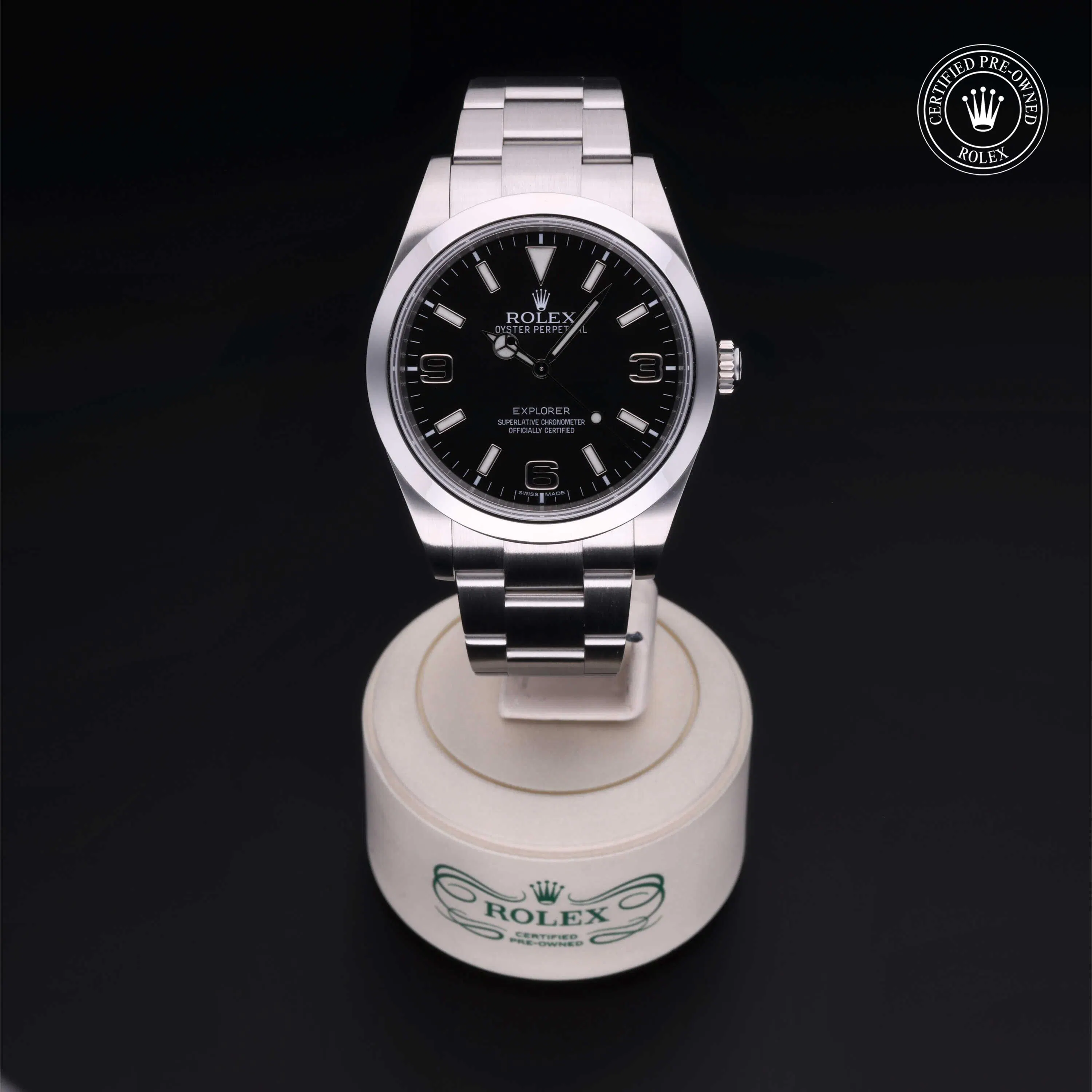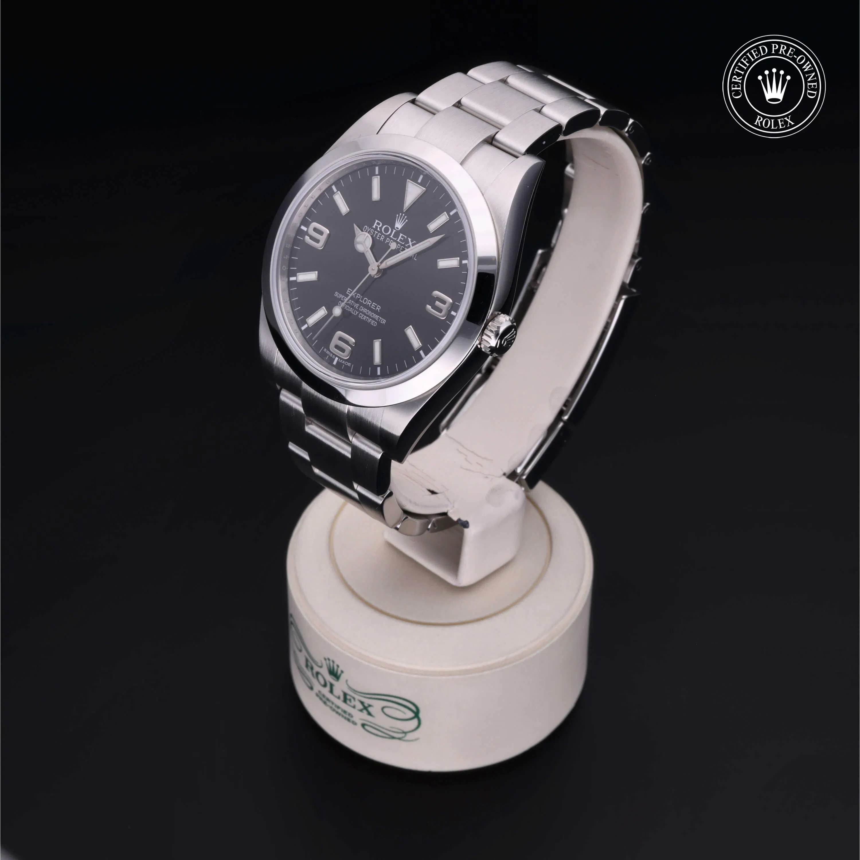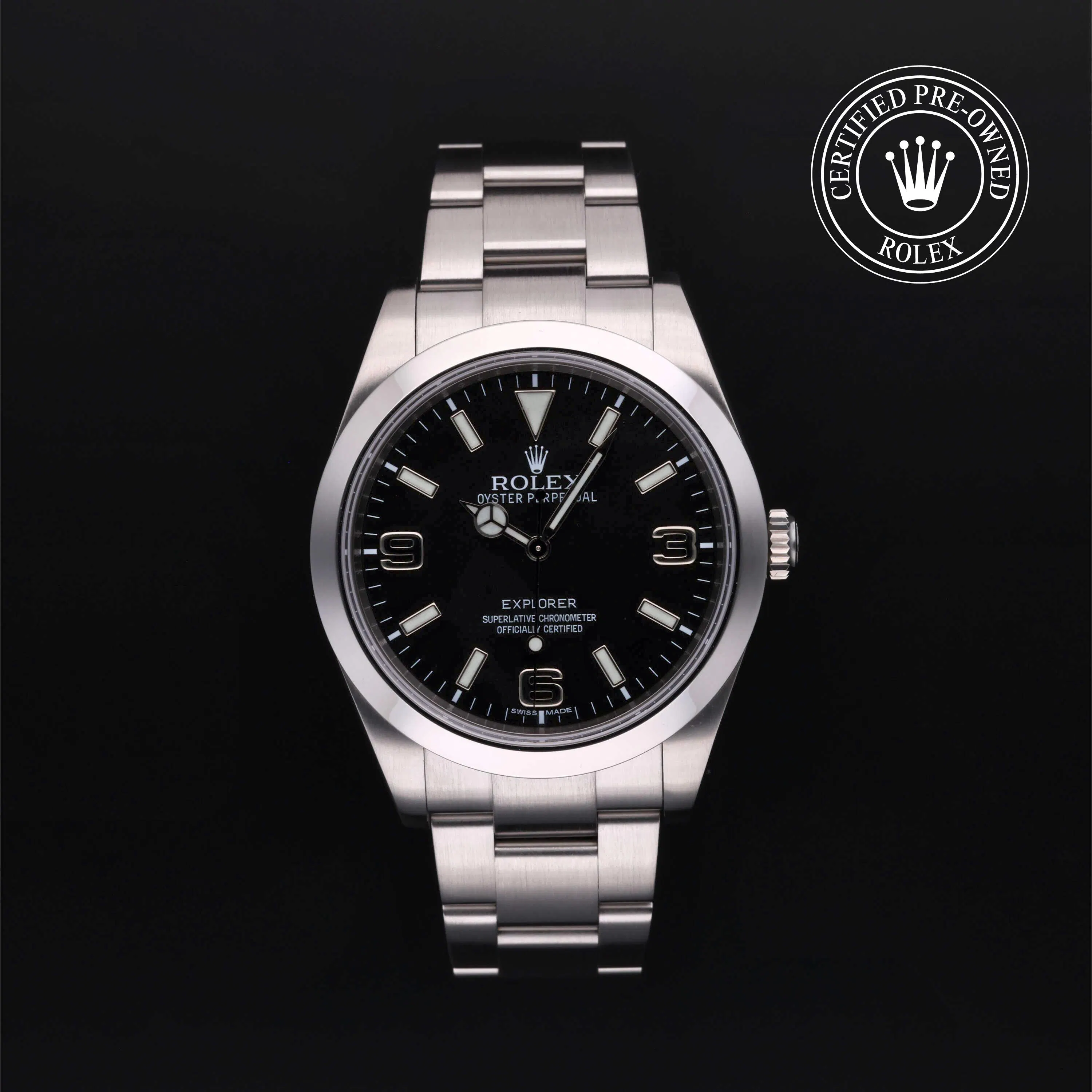 Rolex Certified Pre-Owned Explorer (214270) self - winding automatic watch, features a 39mm stainless steel case and smooth bezel surrounding a black dial on a stainless steel oyster bracelet. Functions include hours, minutes and seconds. This watch has received Rolex-authorized service and certification. It does not come with the original box or papers, but includes a custom Rolex Certified Pre-Owned hang tag, travel pouch and RCPO international warranty card.