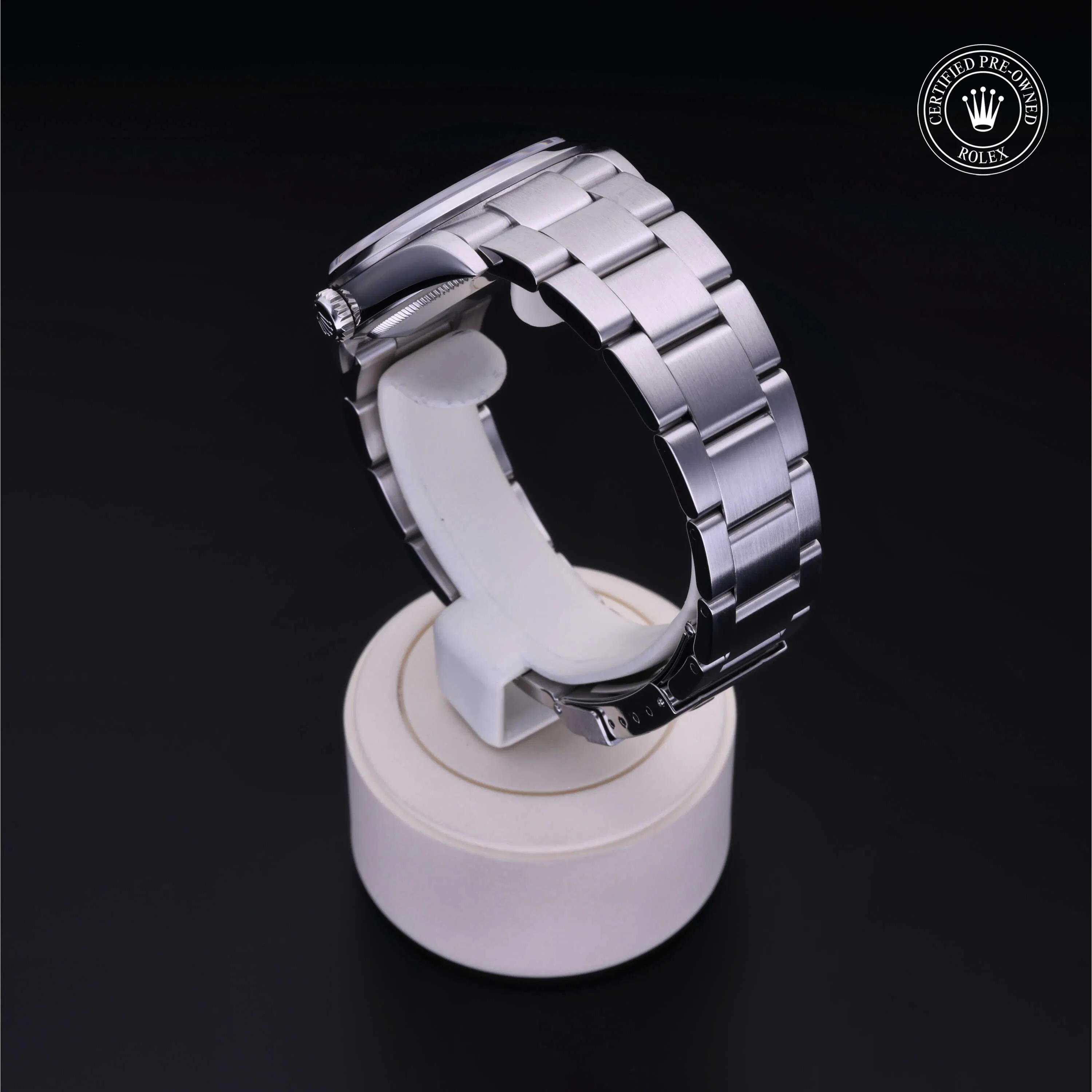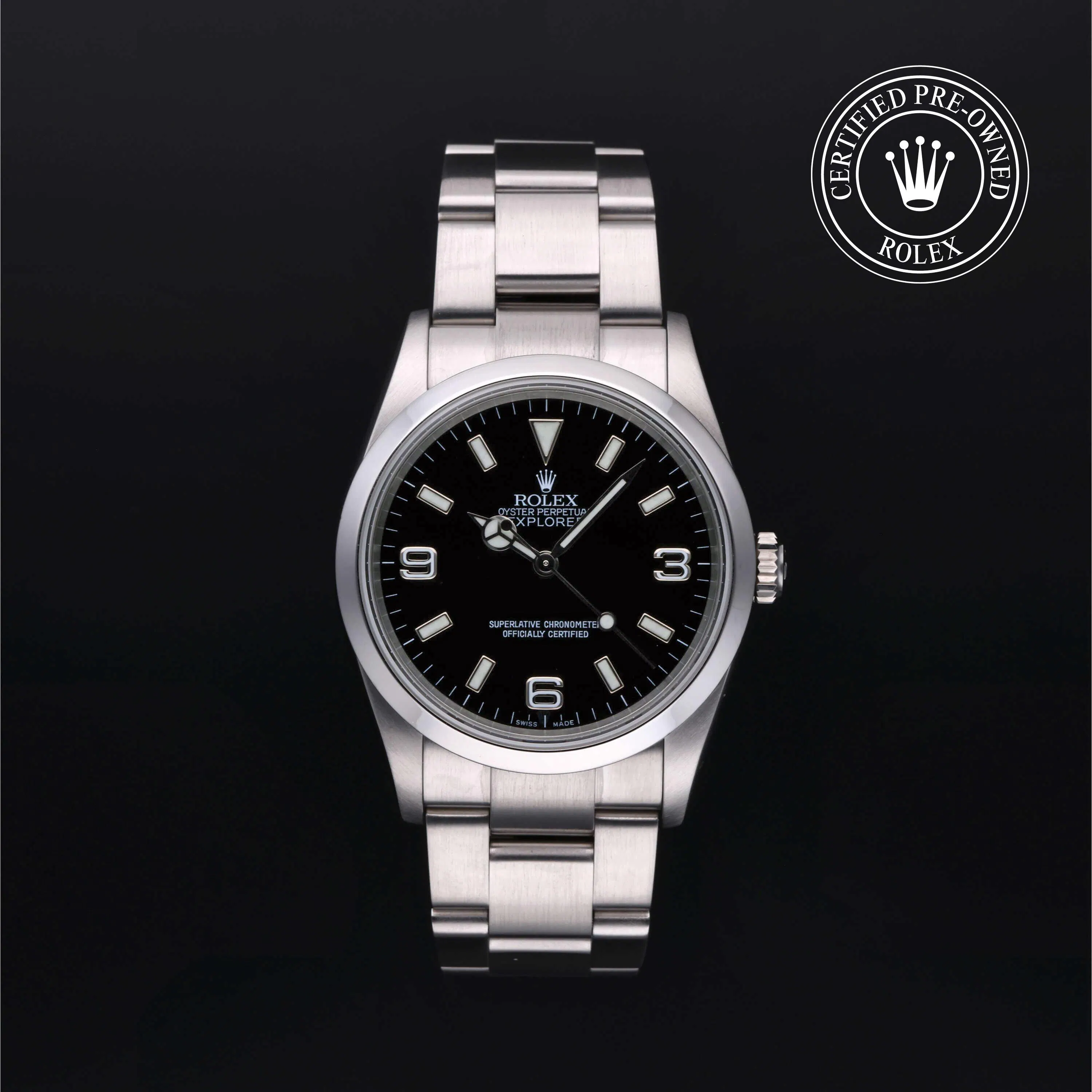 Rolex Certified Pre-Owned Explorer (114270) self - winding automatic watch, features a 36mm stainless steel case and smooth bezel surrounding a black dial on a stainless steel oyster bracelet. Functions include hours, minutes and seconds. This watch has received Rolex-authorized service and certification. It does not come with the original box or papers, but includes a custom Rolex Certified Pre-Owned hang tag, travel pouch and RCPO international warranty card.